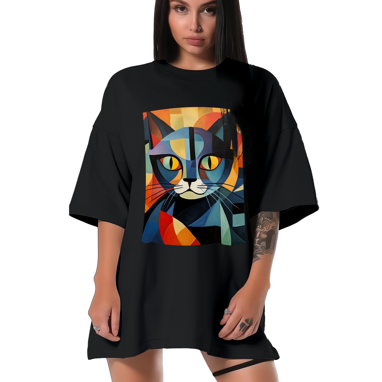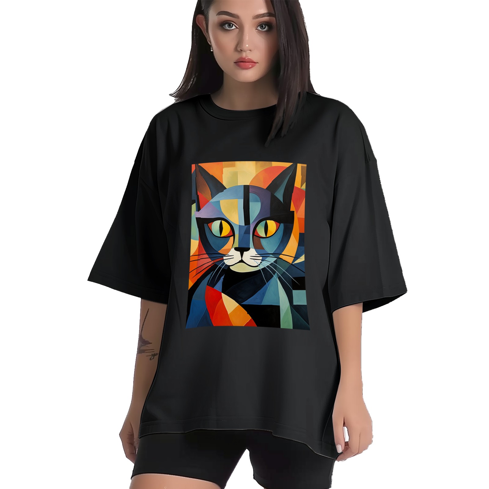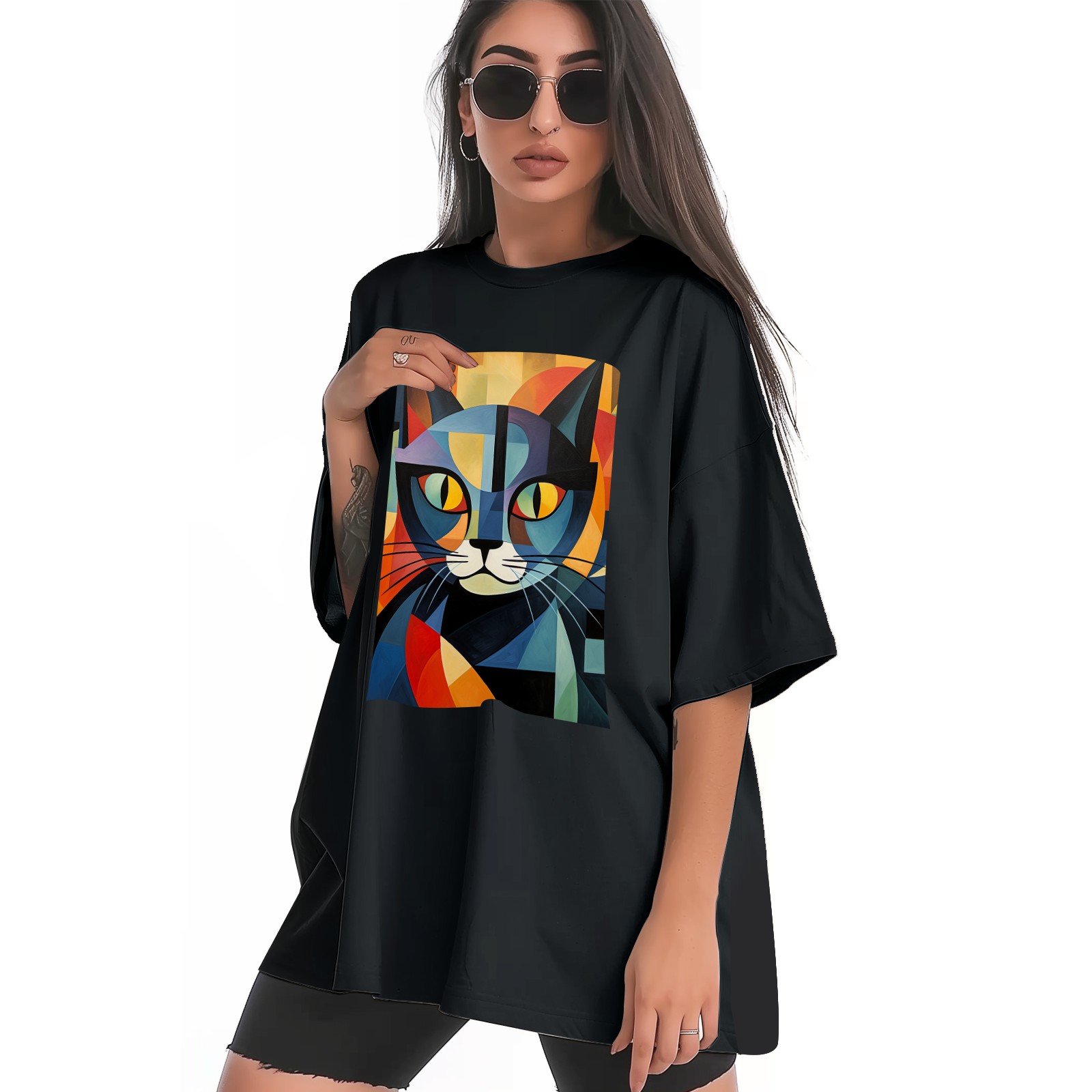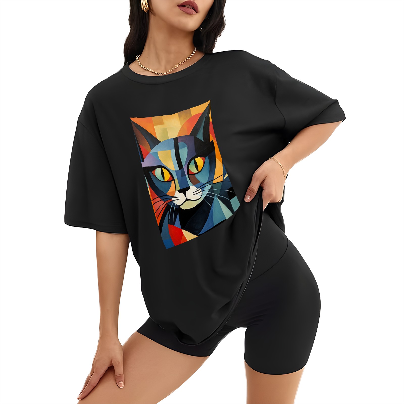 Plus Size Shirt for Women Black Tops for Women Short Sleeves Shirt for Women Cubist Style Cat (16) T Shirt Crewneck Shirt for Women XS