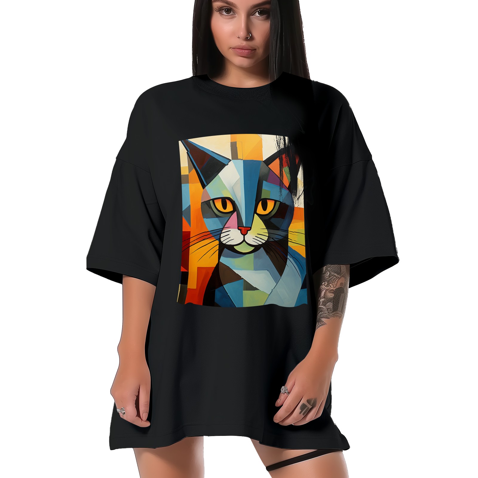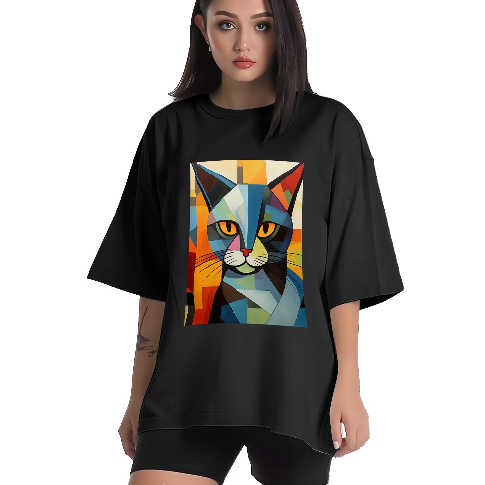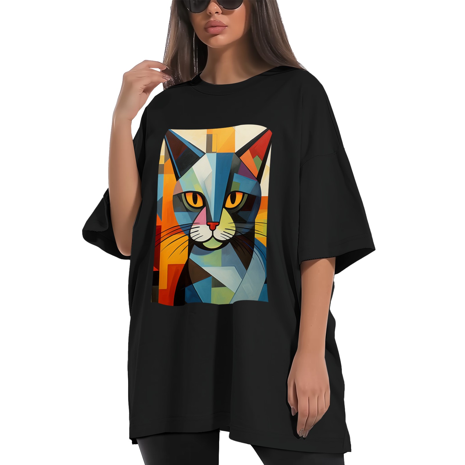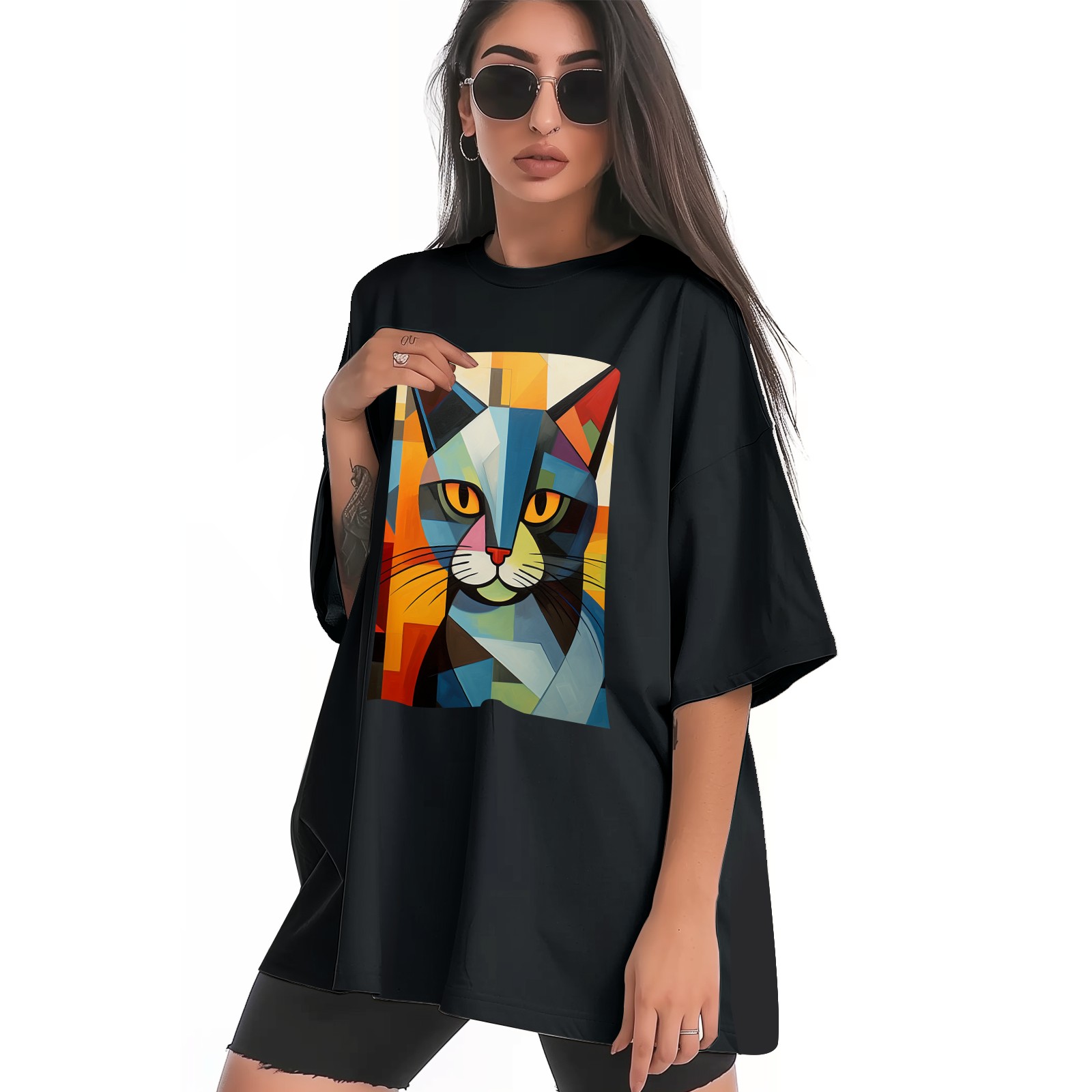 Plus Size Shirt for Women Black Tops for Women Short Sleeves Shirt for Women Cubist Style Cat (14) T Shirt Crewneck Shirt for Women XS