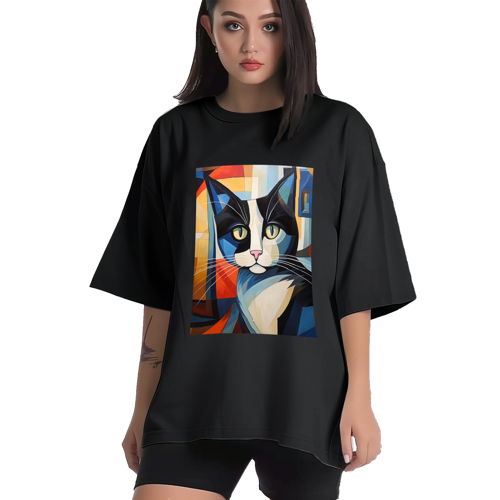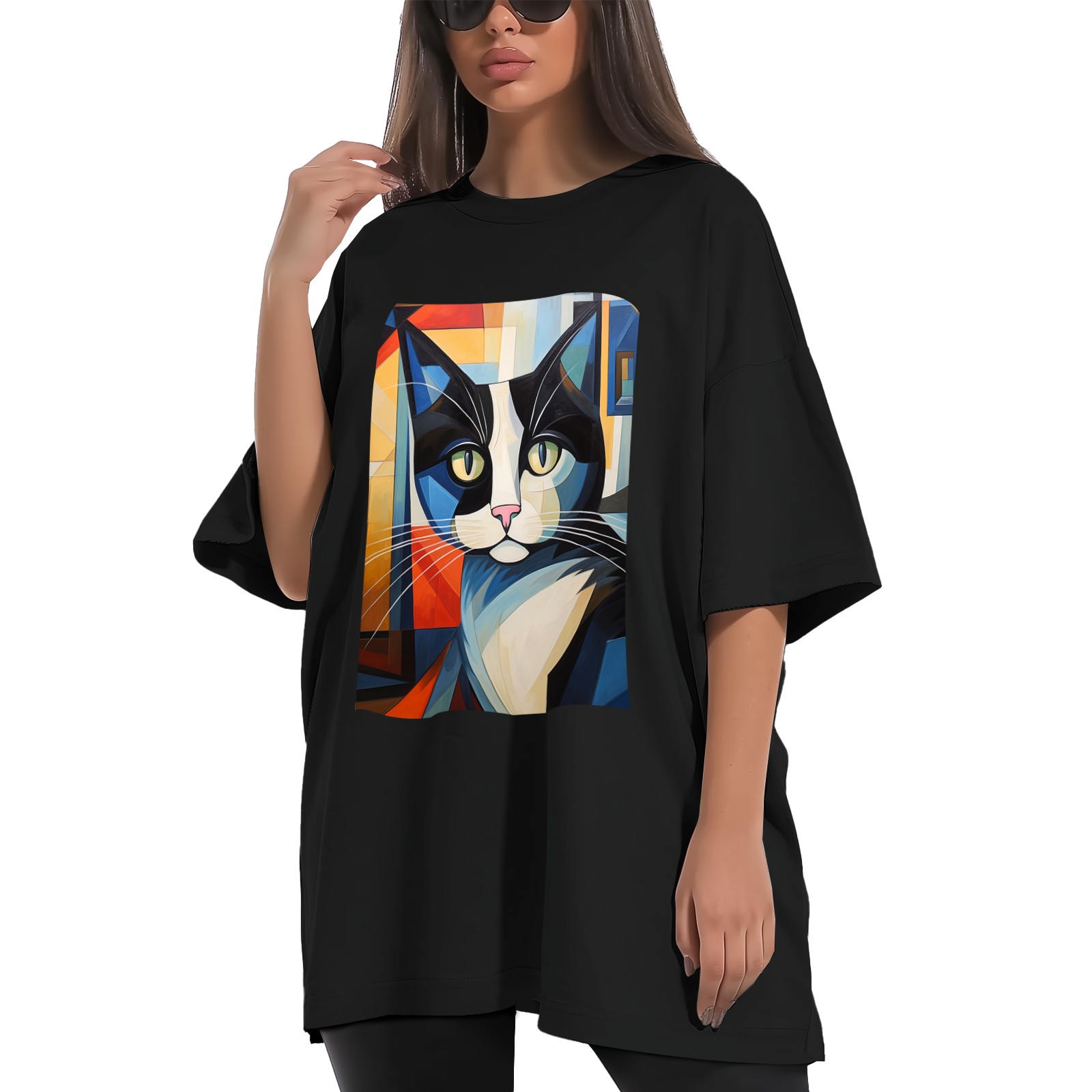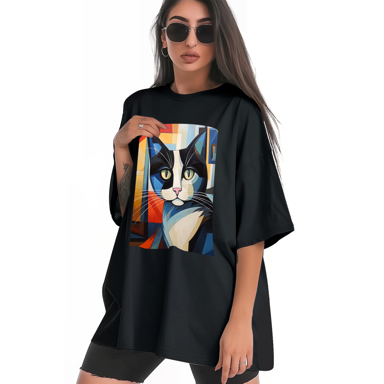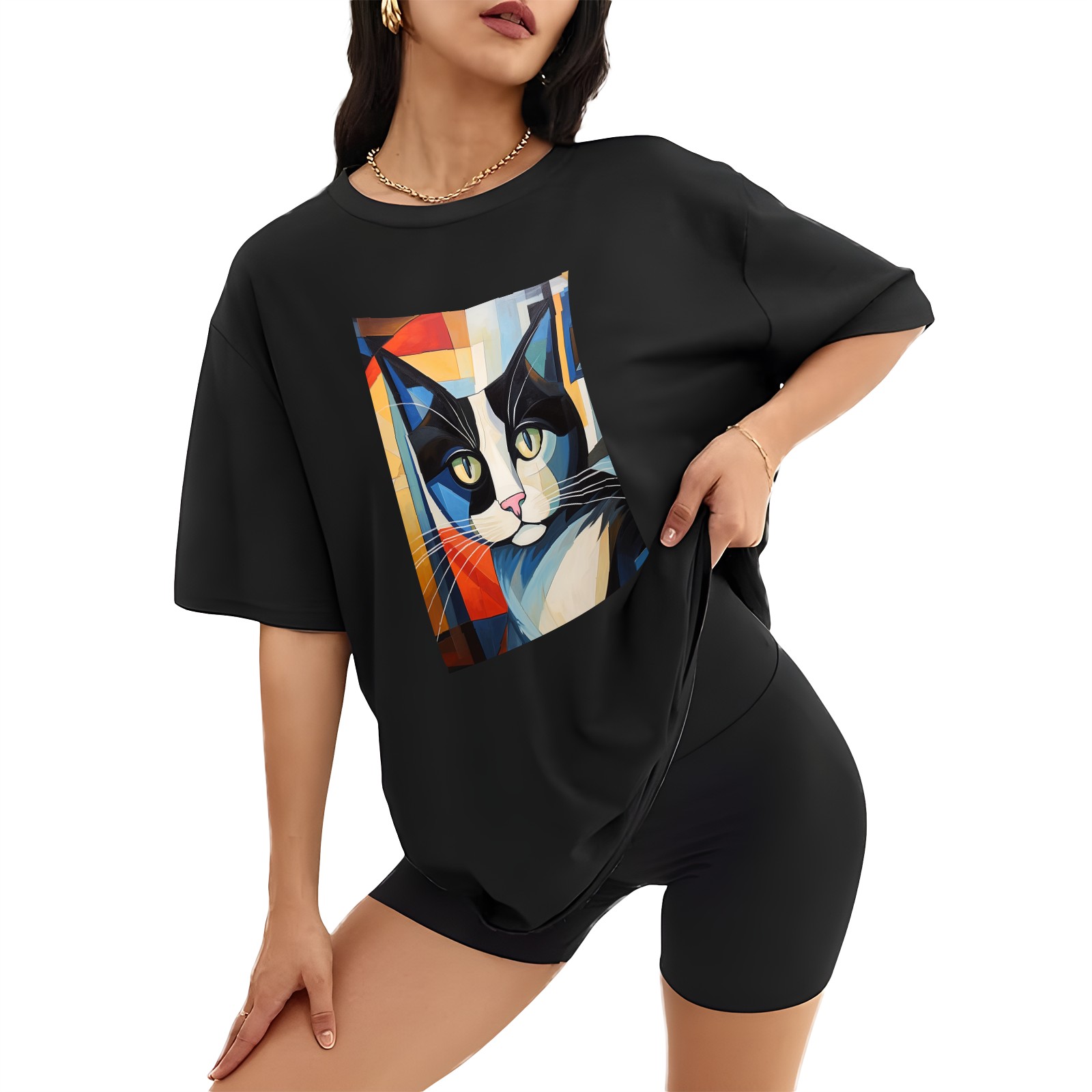 Plus Size Shirt for Women Black Tops for Women Short Sleeves Shirt for Women Cubist Style Cat (1) T Shirt Crewneck Shirt for Women XS