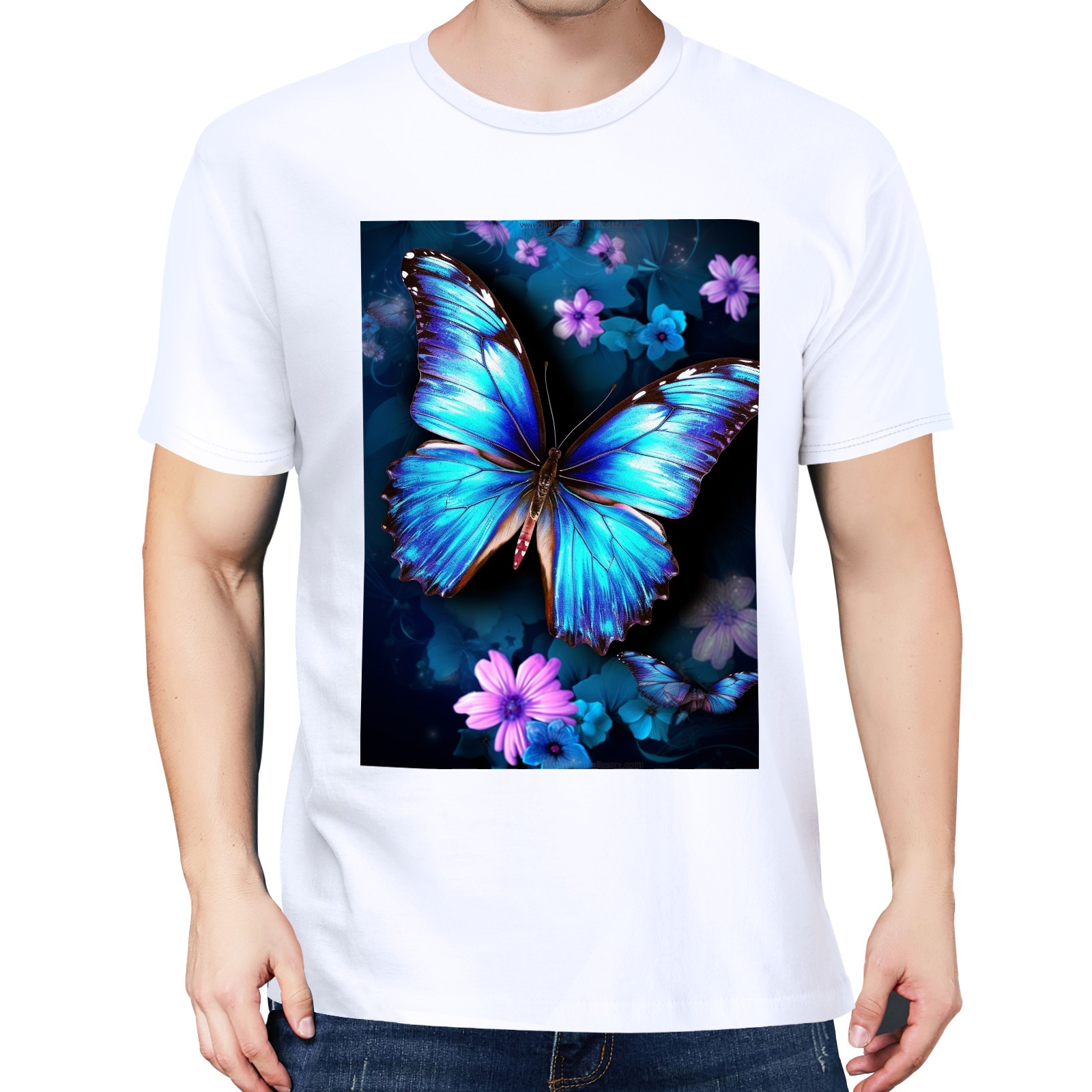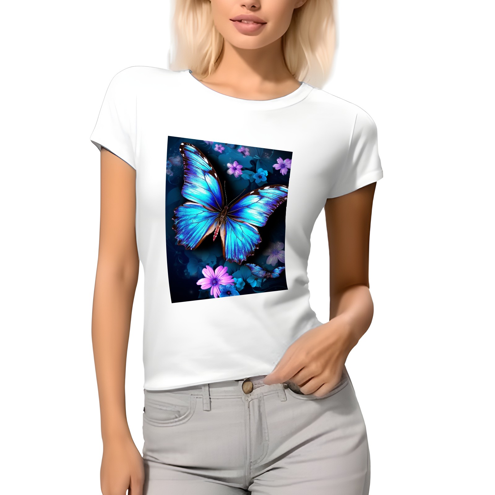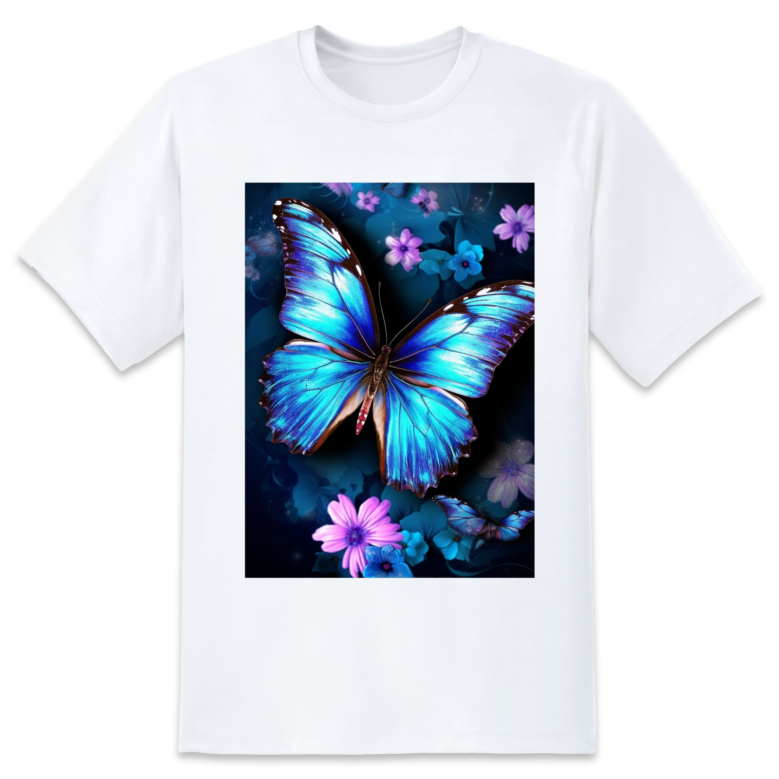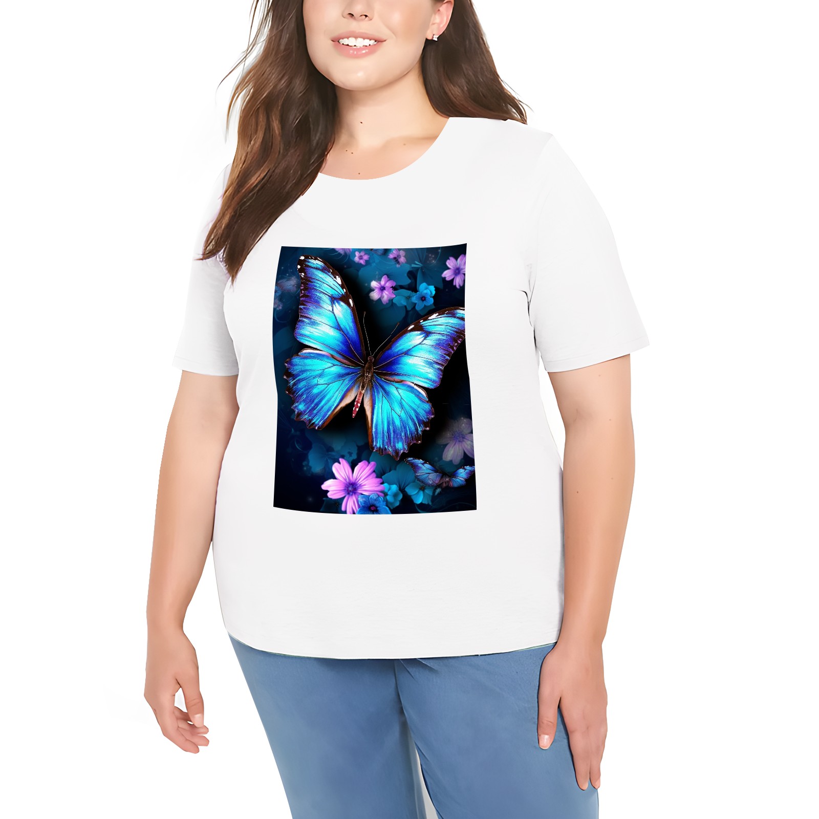 Basic Oversize Tees For WomenBlue Butterflies And Flower (2) Loose Boyfriend Shirts Casual Blouse round neck