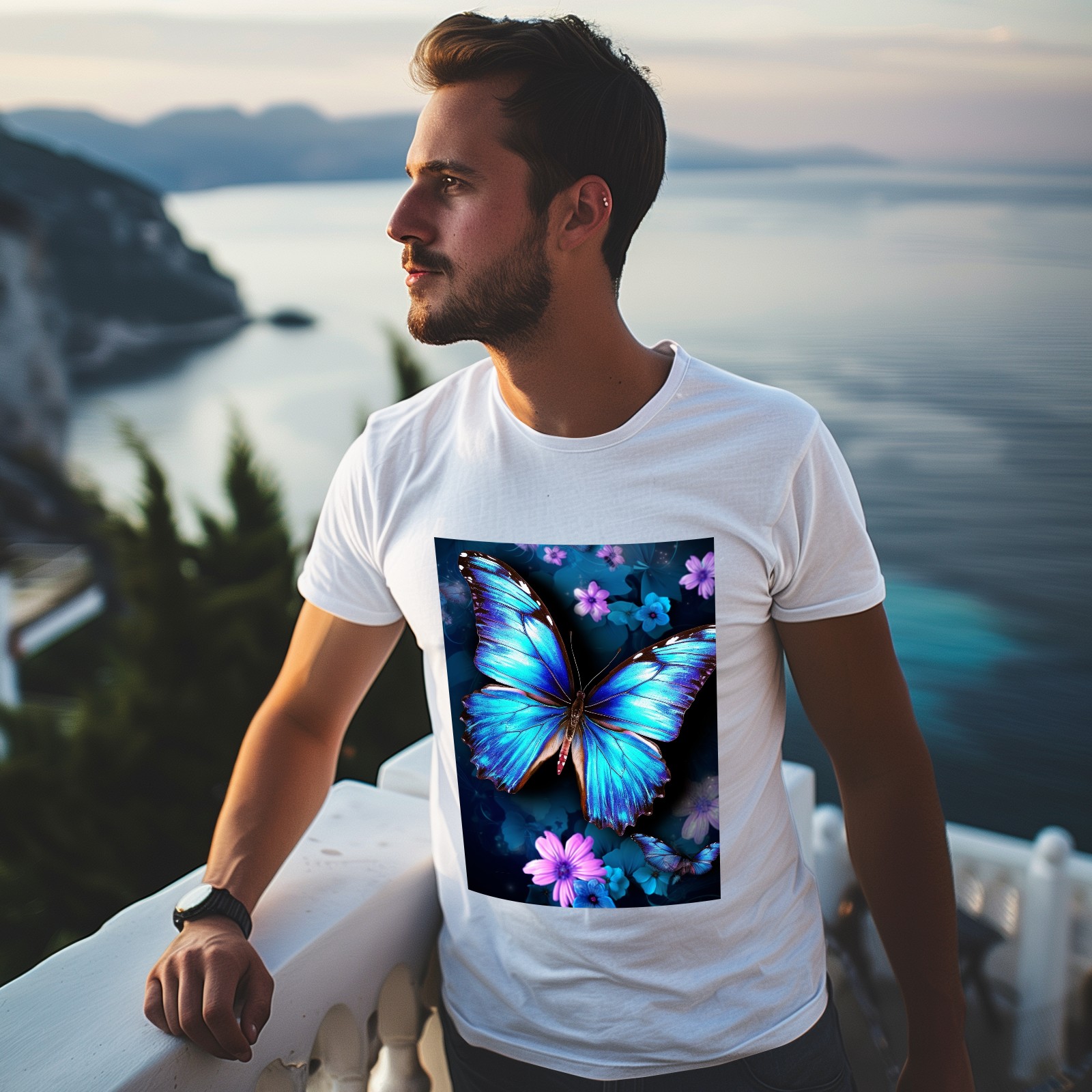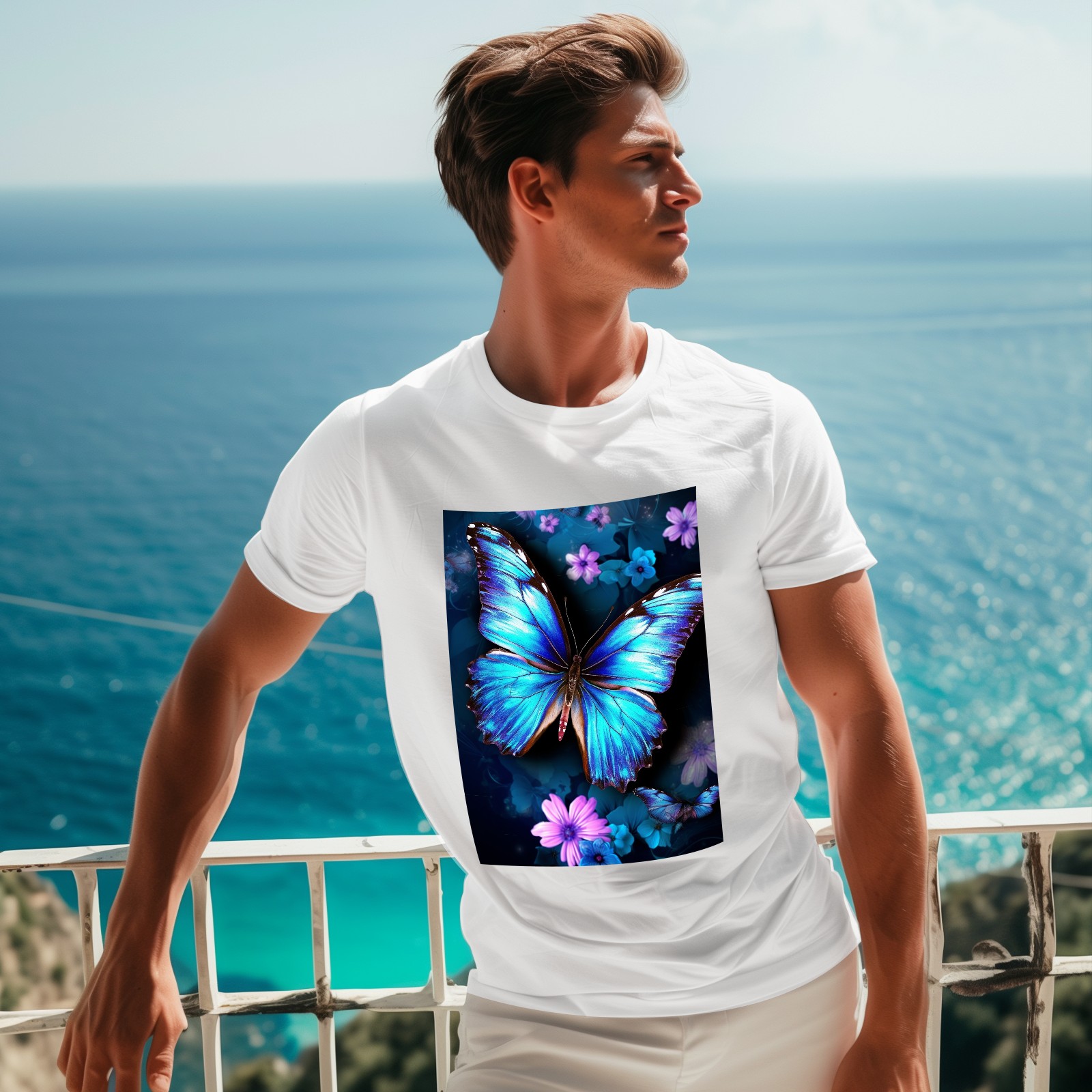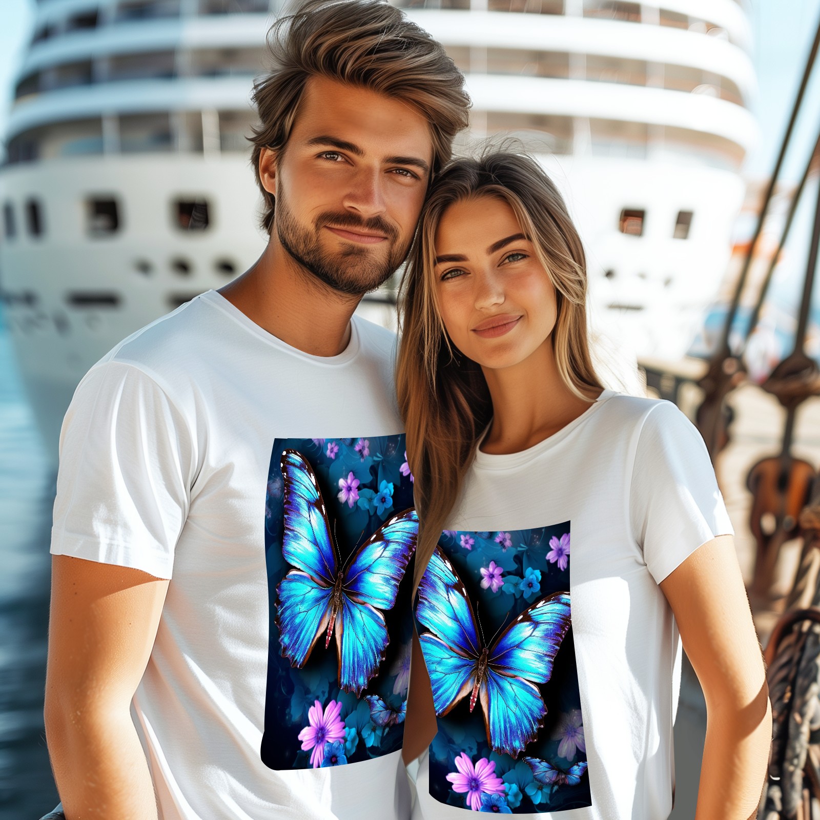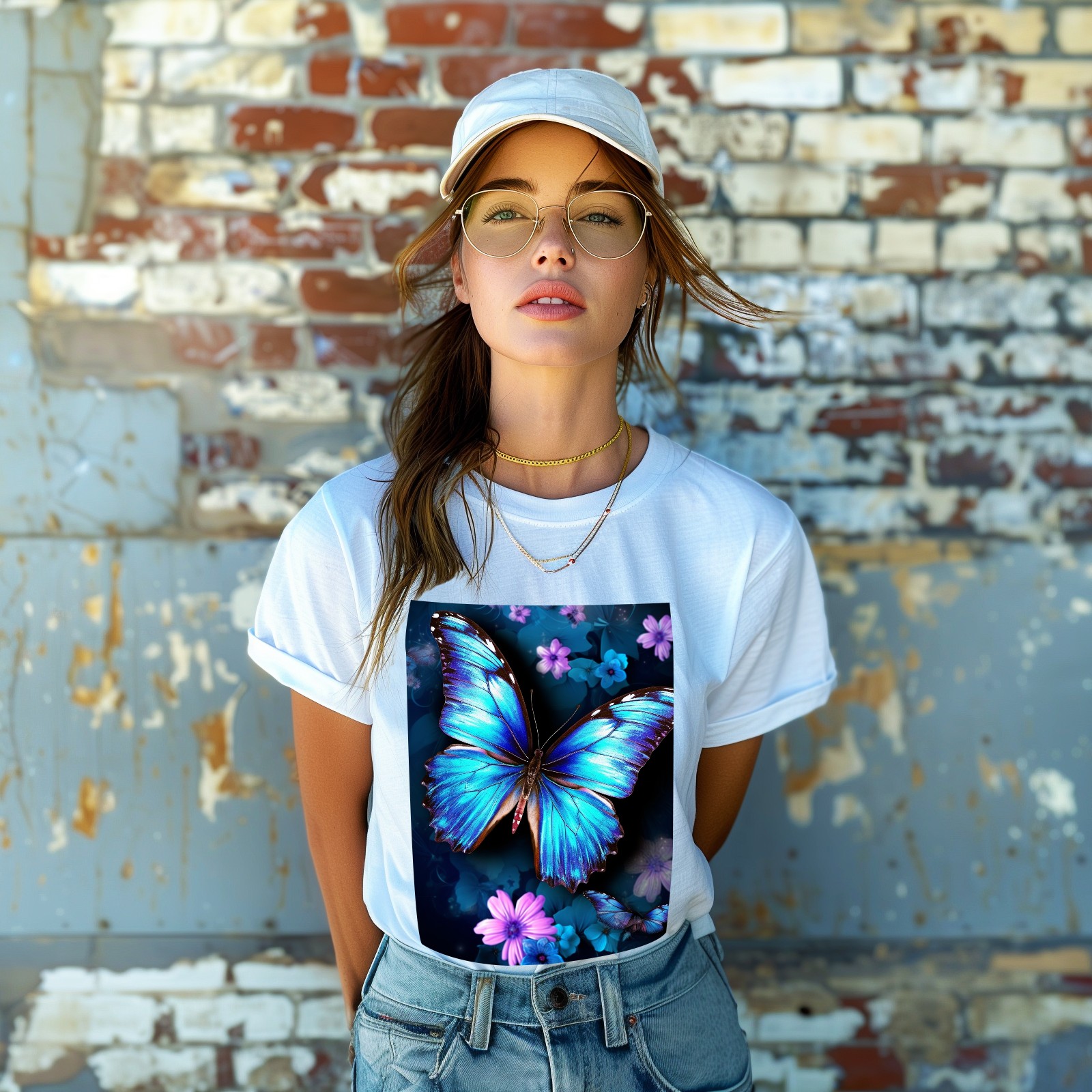 Basic Oversize Tees For WomenBlue Butterflies And Flower (2) Loose Boyfriend Shirts Casual Blouse round neck