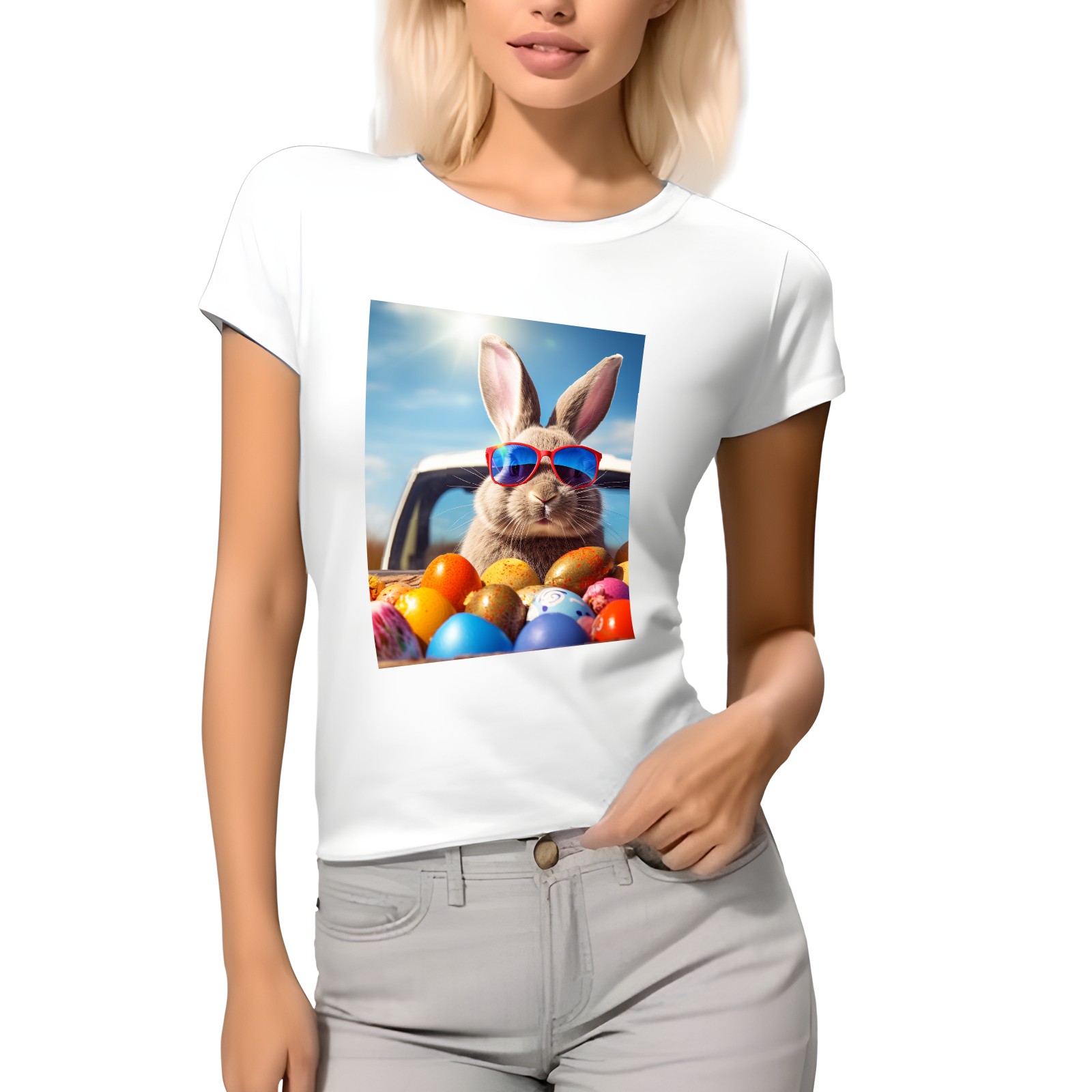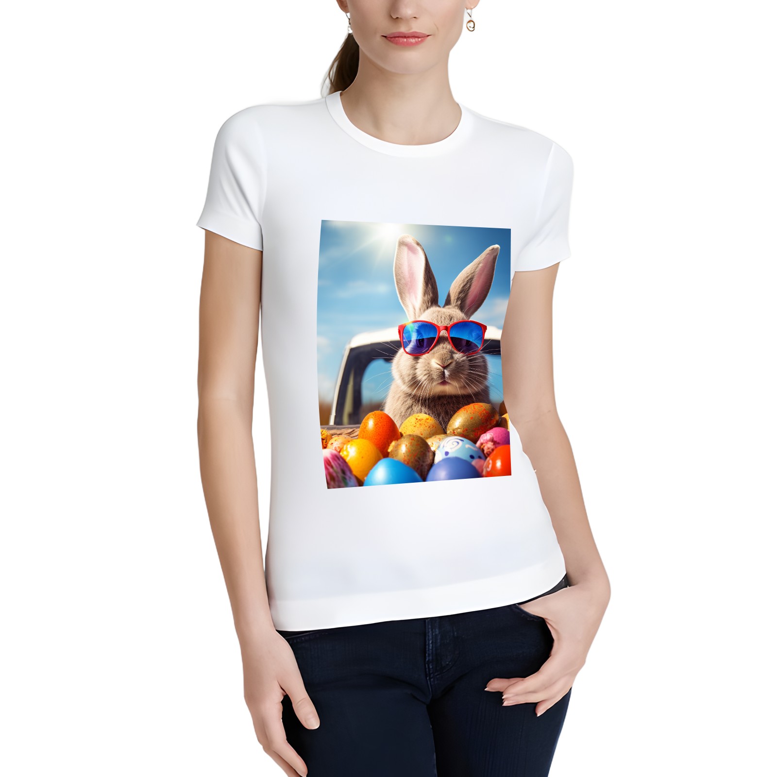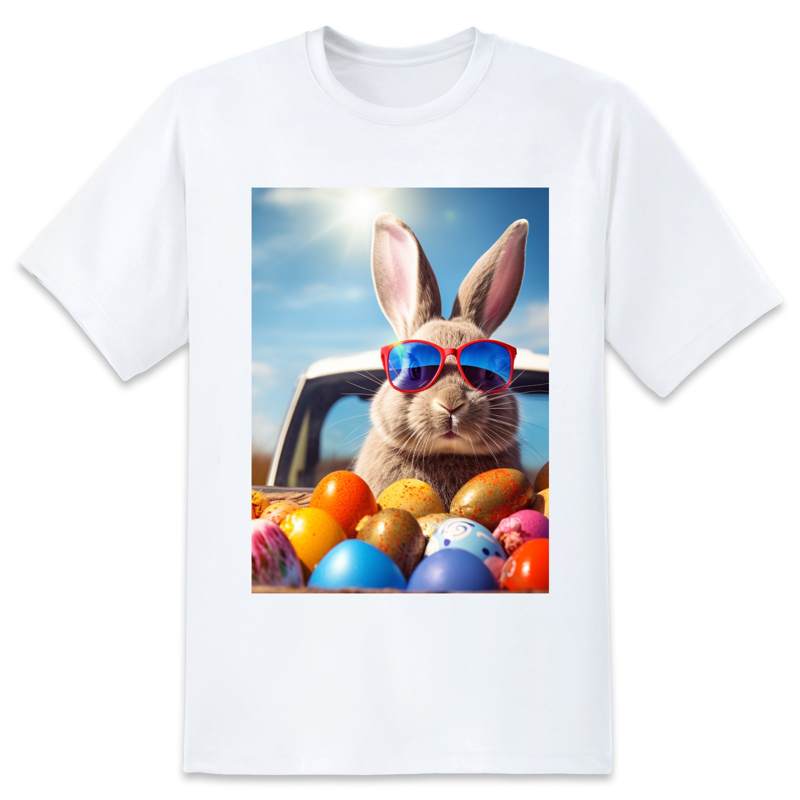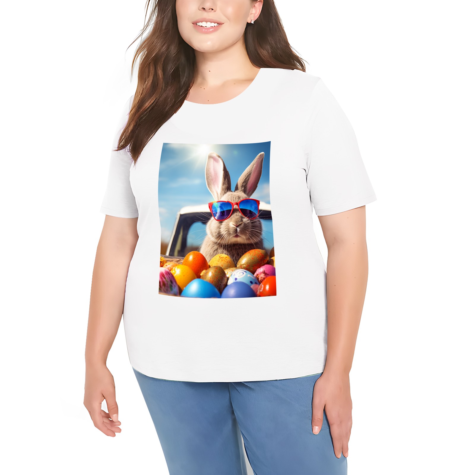 Basic Oversize Tees For WomenBjkj_Cute_Easter_Bunny_with_sunglasses_looking_out_of_a_car_fi_1205dd27-da95-4c79-8b99-f47482d645f8 Loose Boyfriend Shirts Casual Blouse round neck