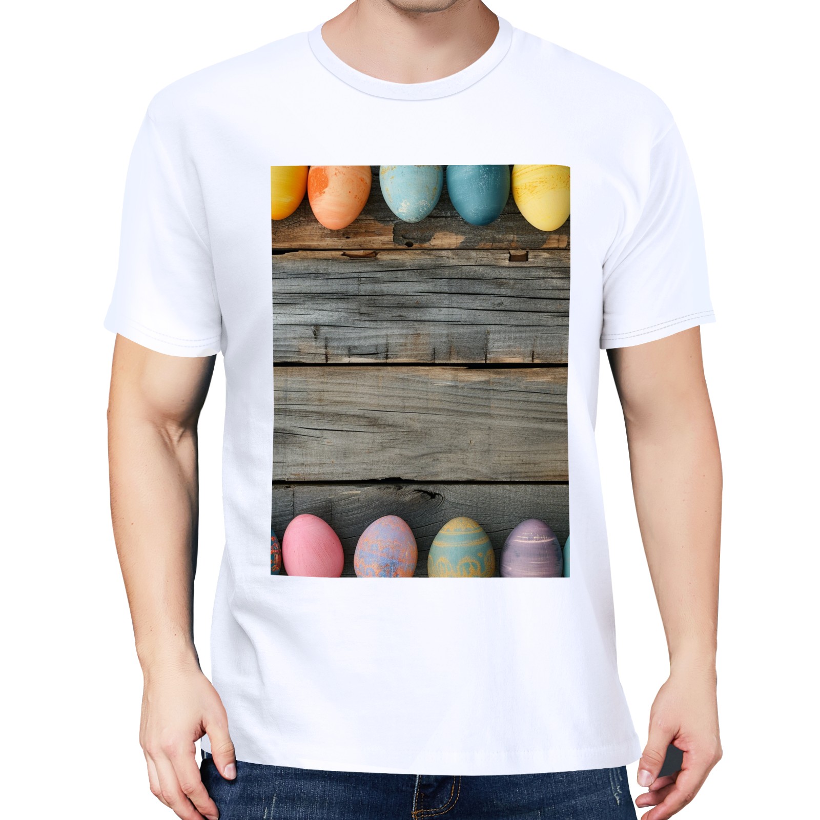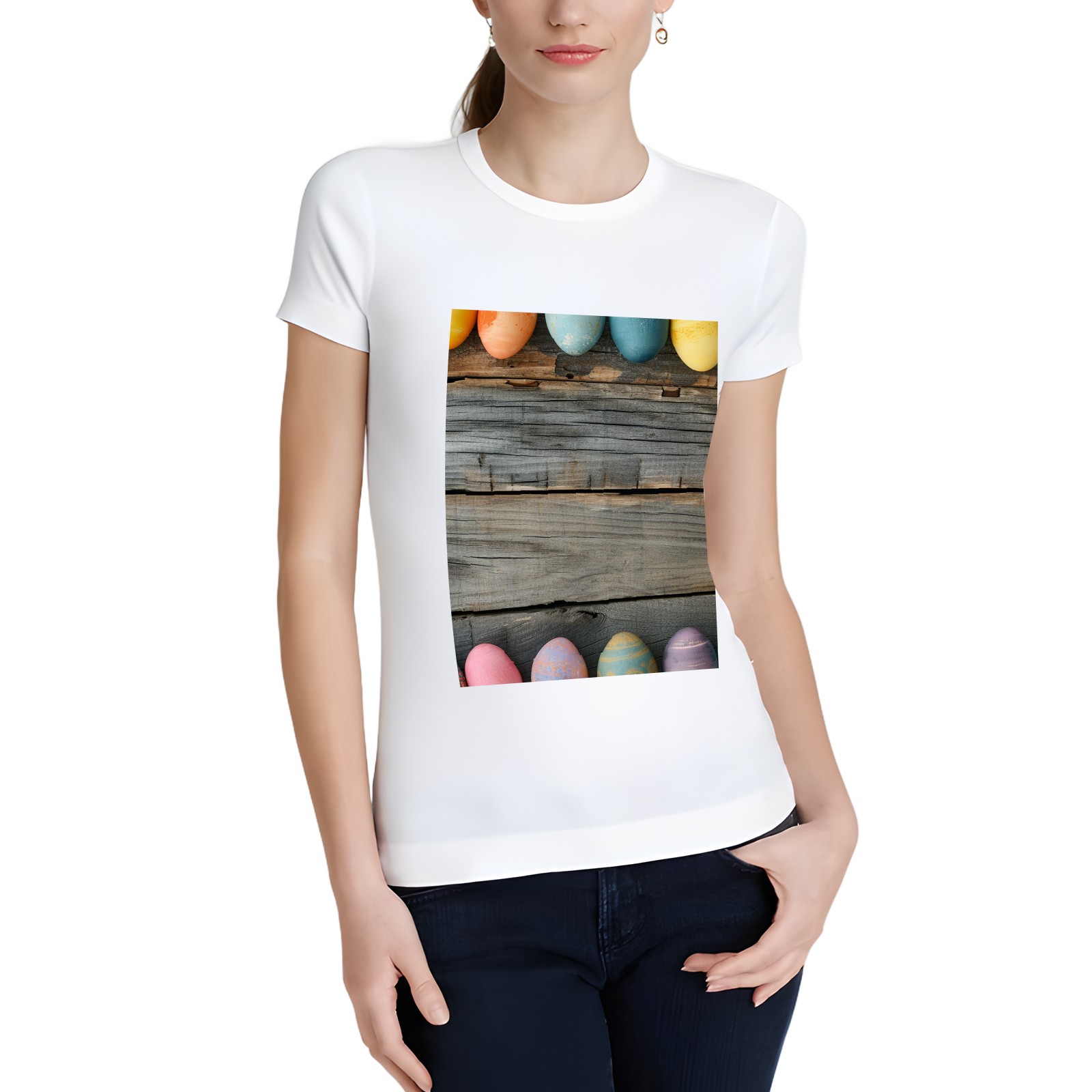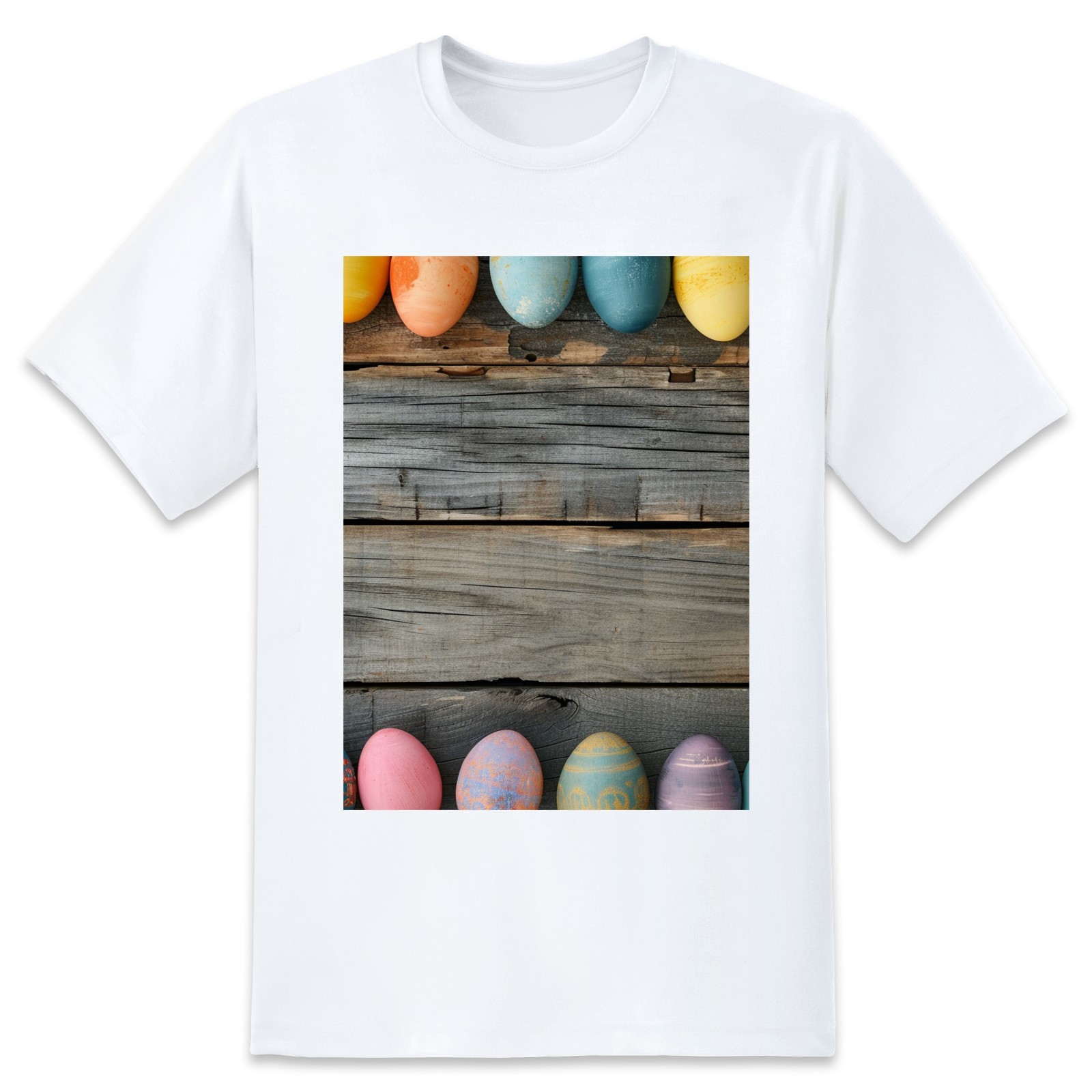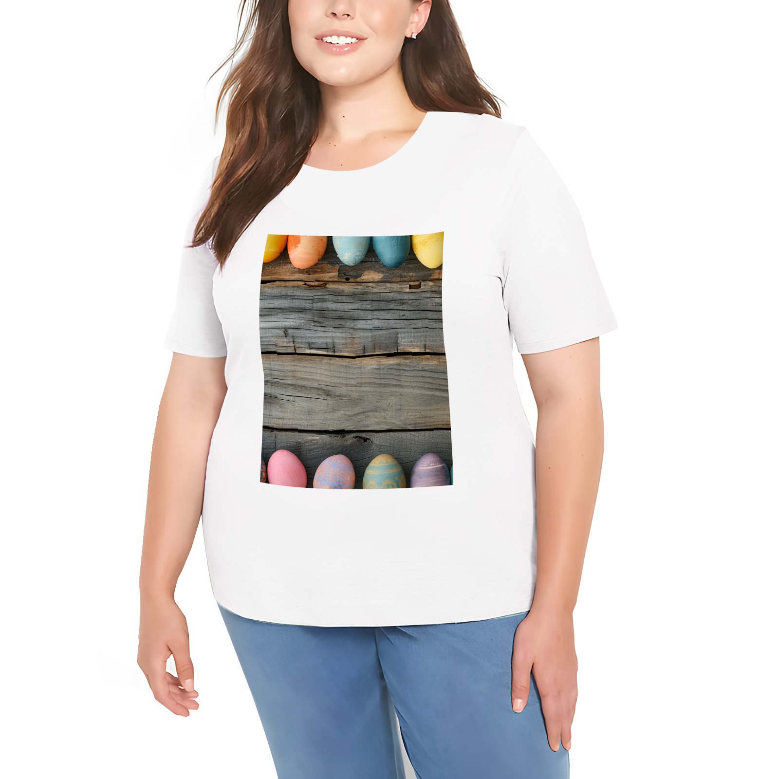 Basic Oversize Tees For WomenBjkj_Colorful_Easter_egg_side_borders_with_rustic_wooden_backg_7a464ebe-bb9d-4017-9994-566da7c39b2d Loose Boyfriend Shirts Casual Blouse round neck