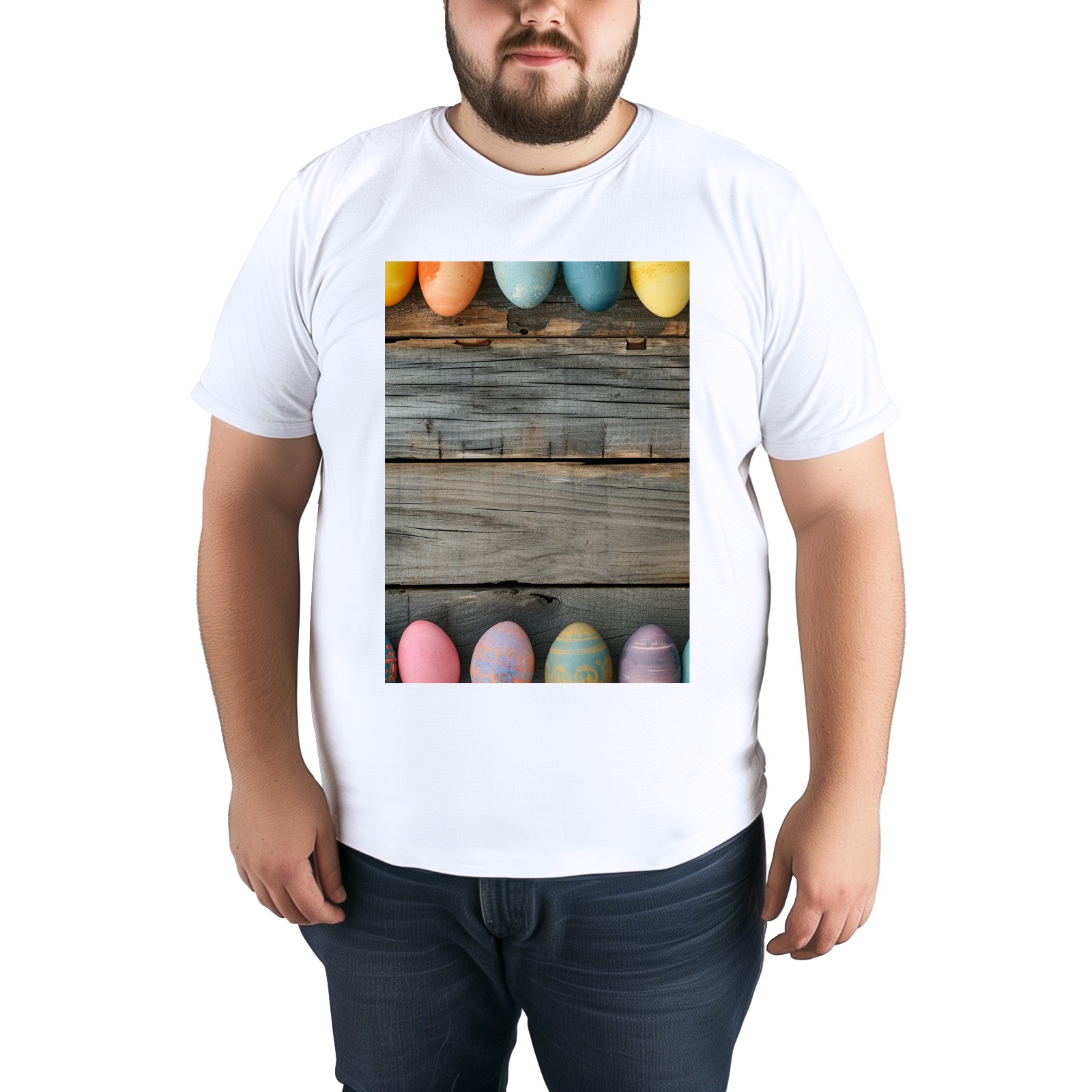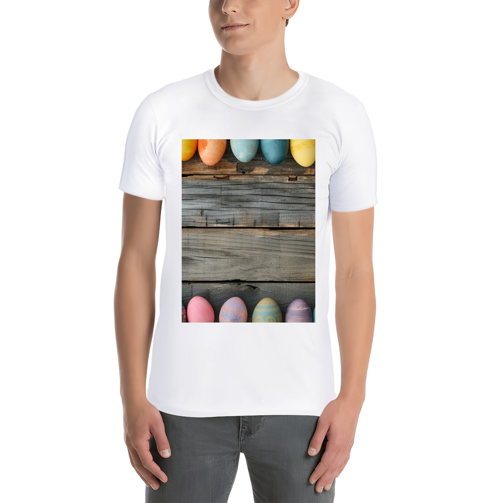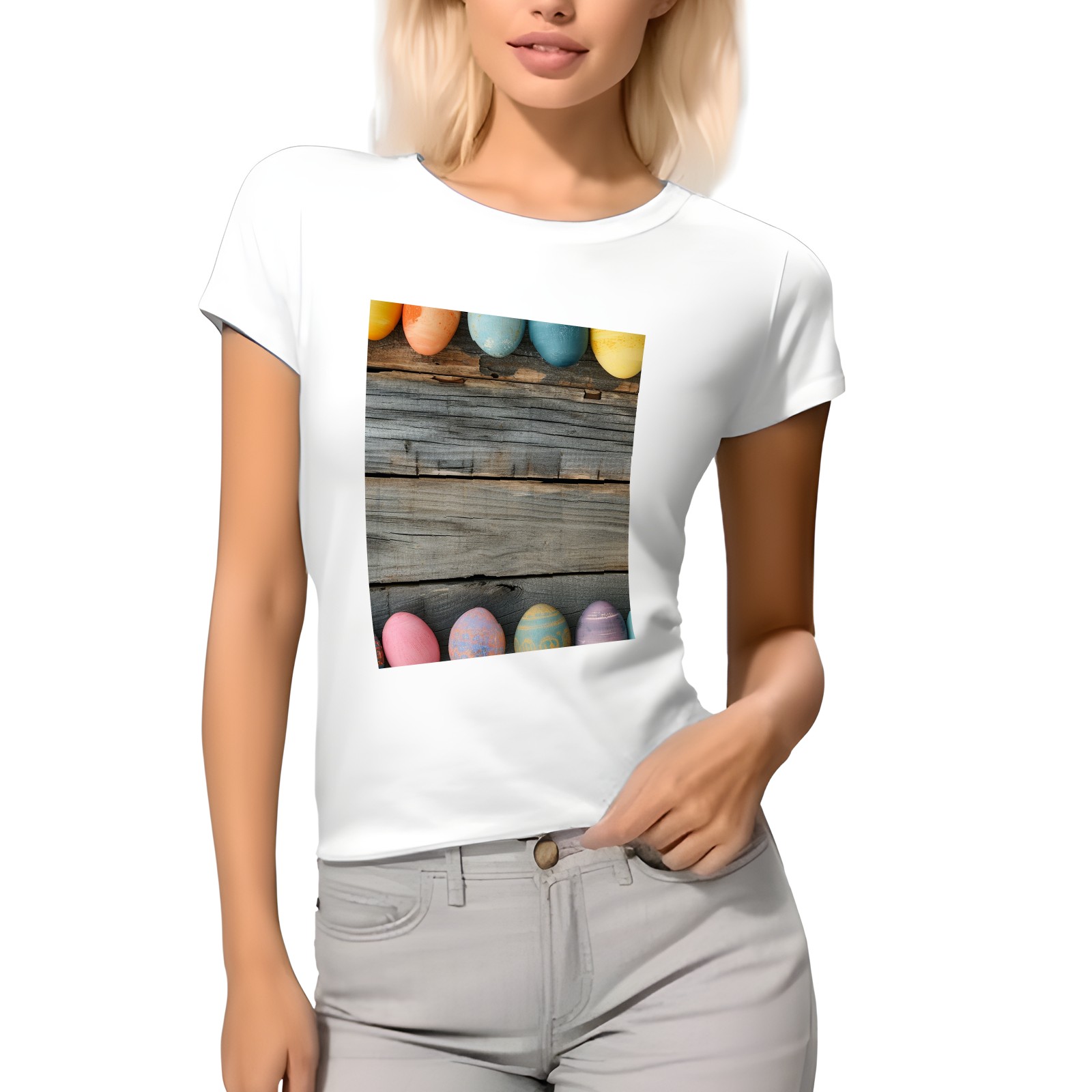 Basic Oversize Tees For WomenBjkj_Colorful_Easter_egg_side_borders_with_rustic_wooden_backg_7a464ebe-bb9d-4017-9994-566da7c39b2d Loose Boyfriend Shirts Casual Blouse round neck