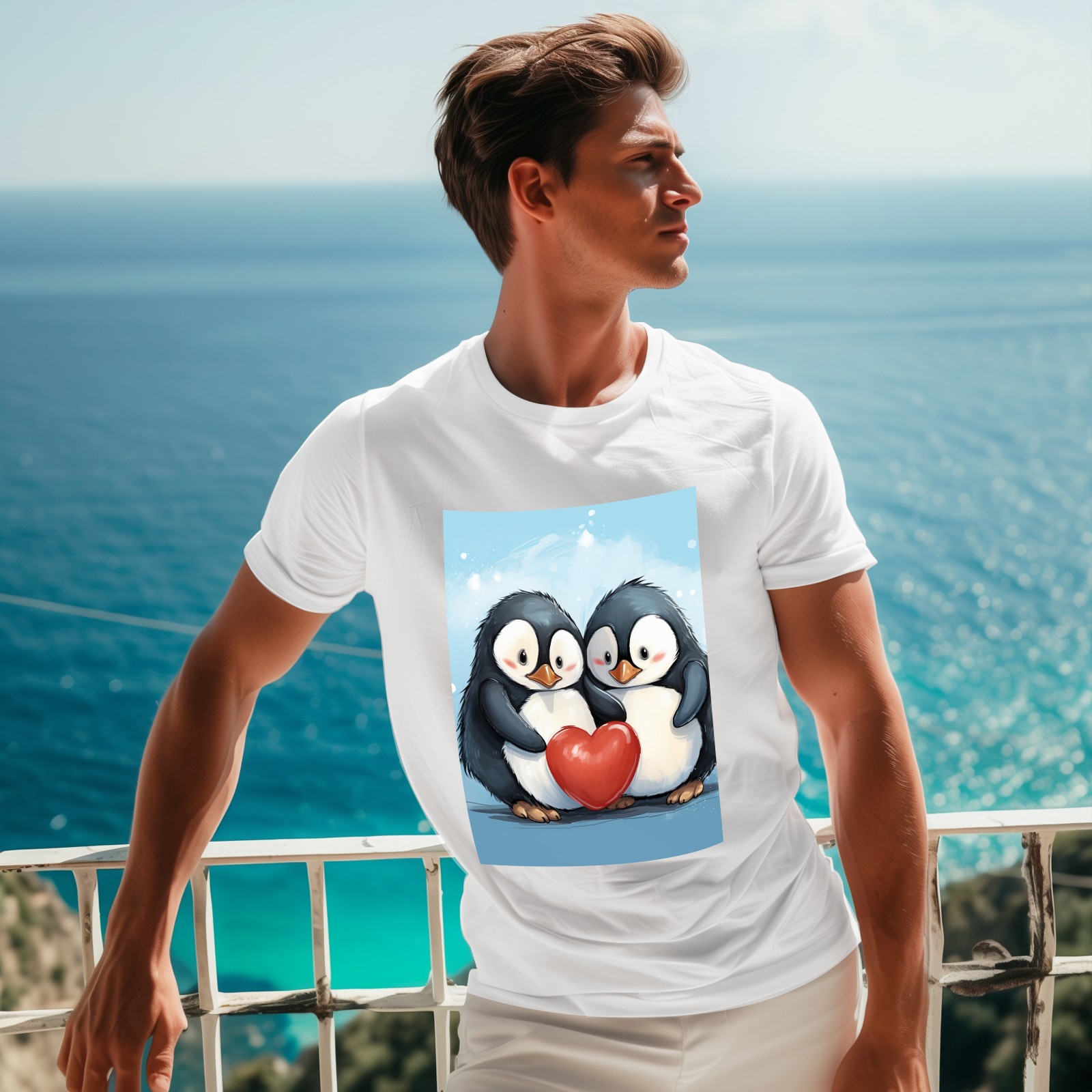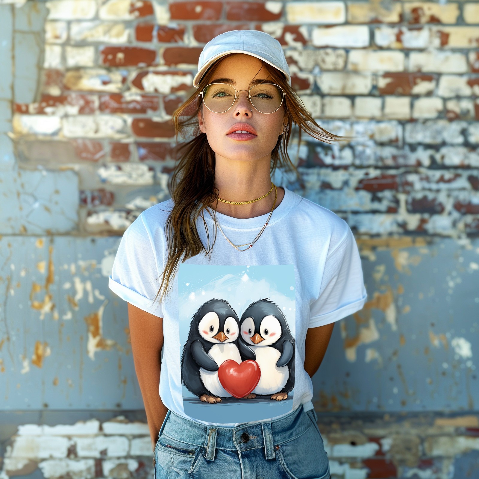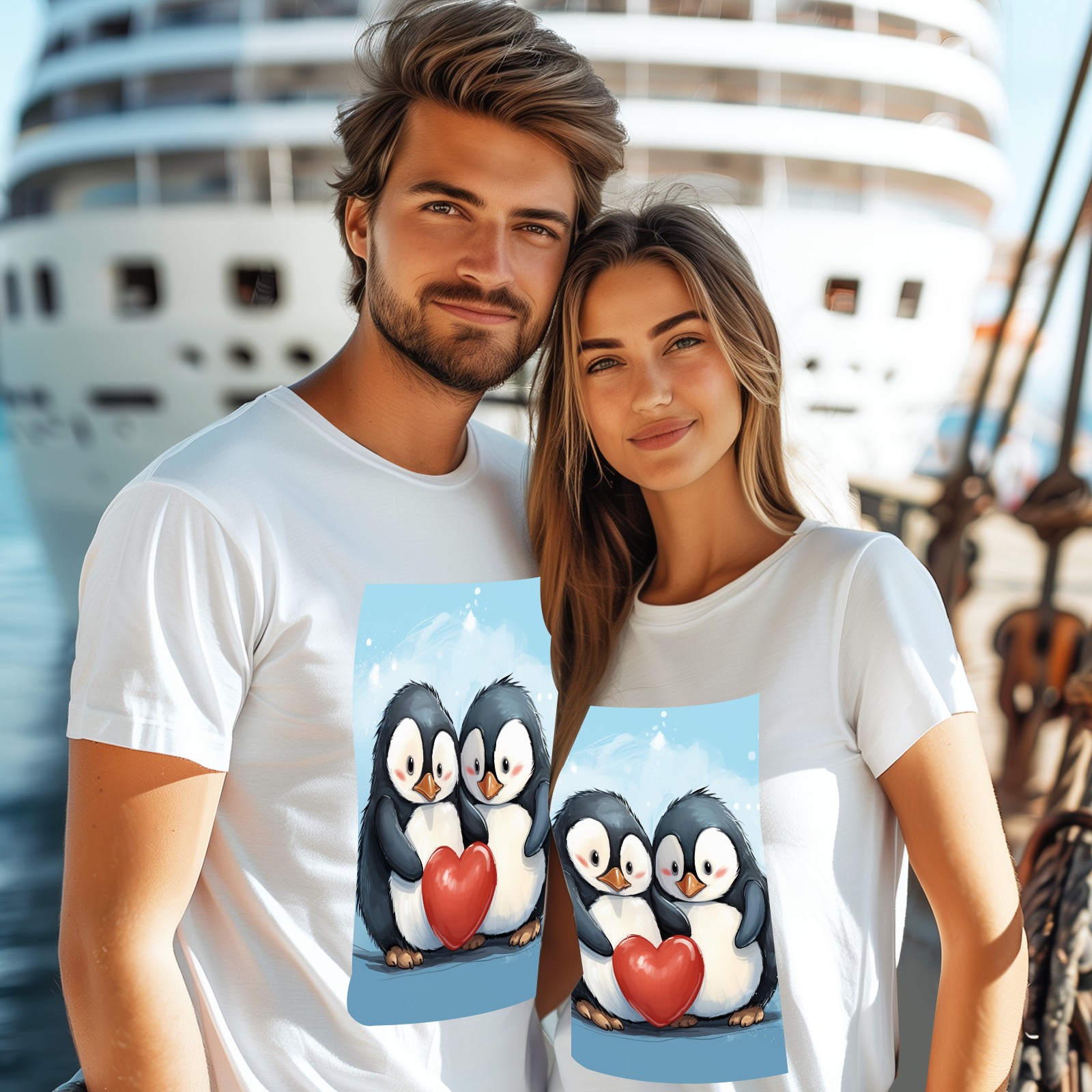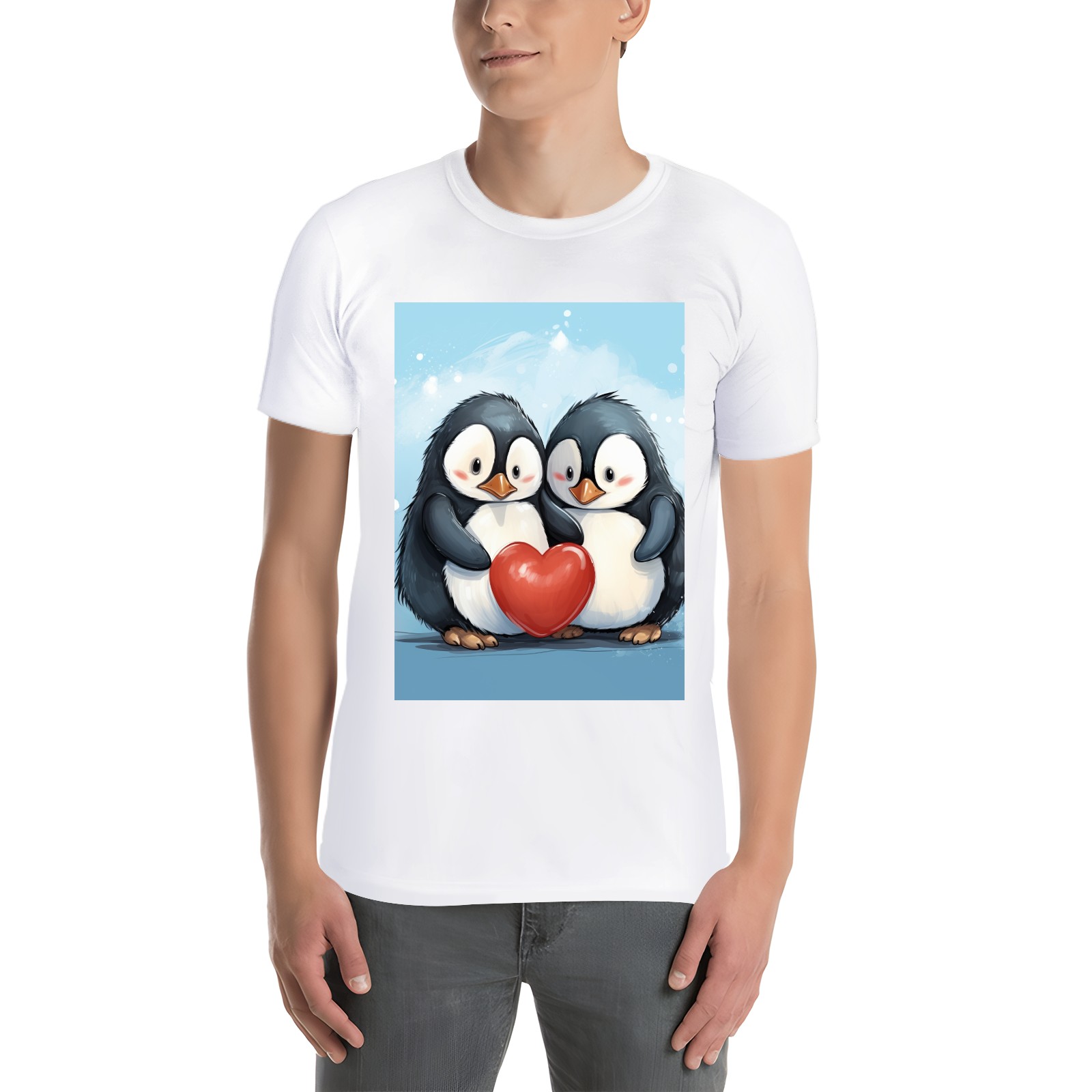 Basic Oversize Tees For WomenTwo Penguins Hugging A Red Heart (2) Loose Boyfriend Shirts Casual Blouse round neck