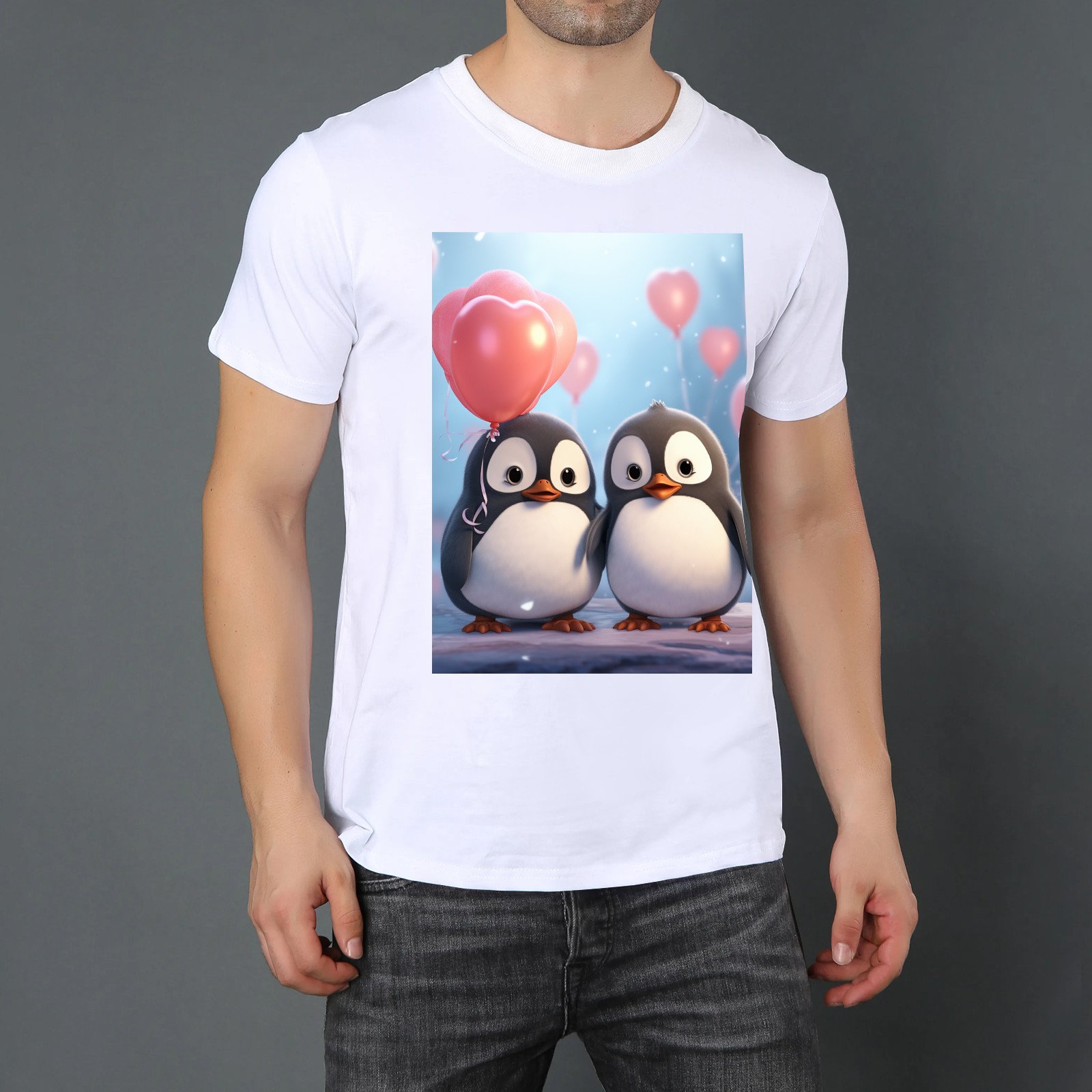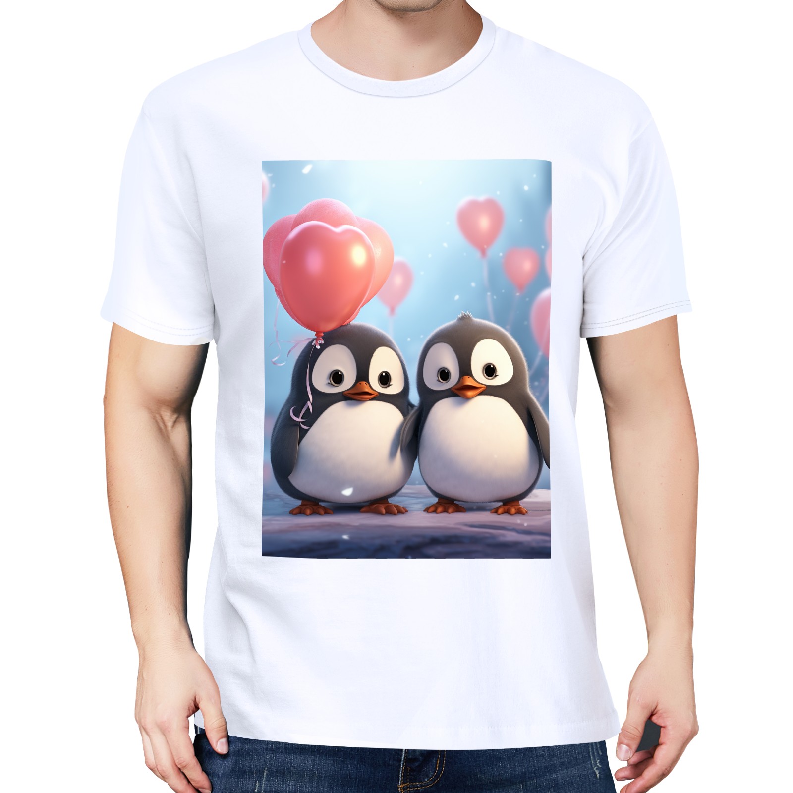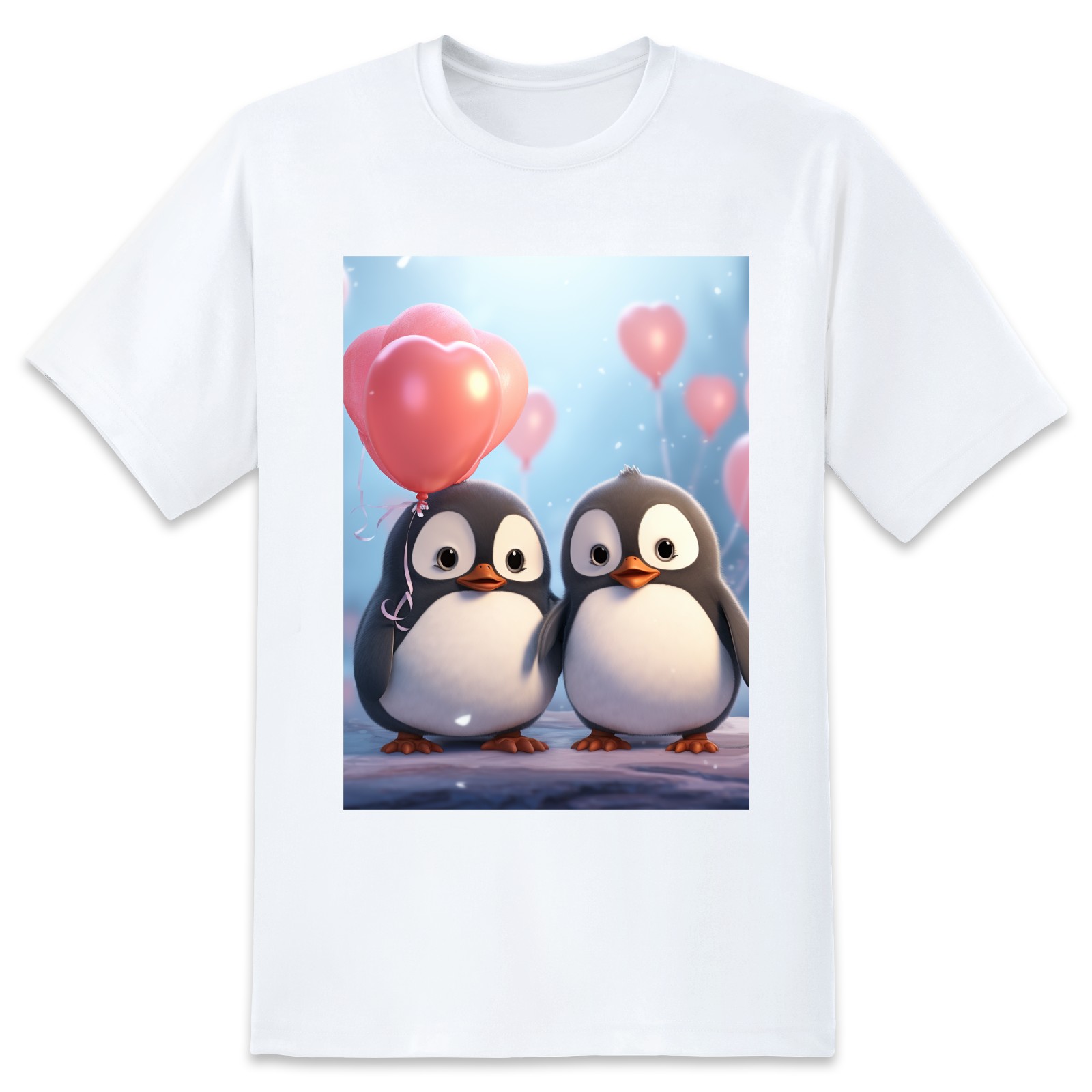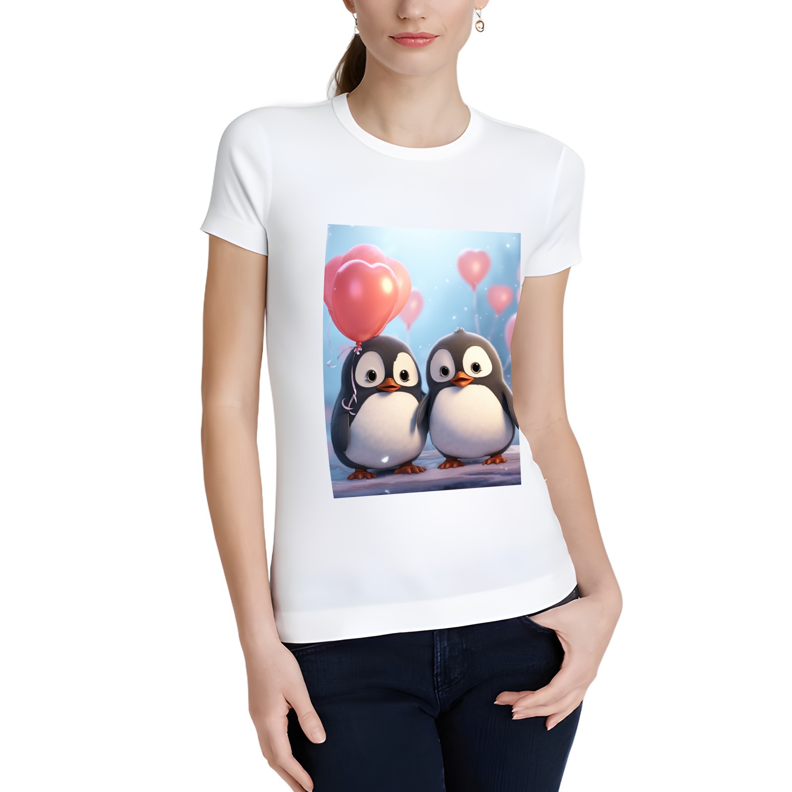 Basic Oversize Tees For WomenCouple Penguins Holding Hearts Balloons (15) Loose Boyfriend Shirts Casual Blouse round neck