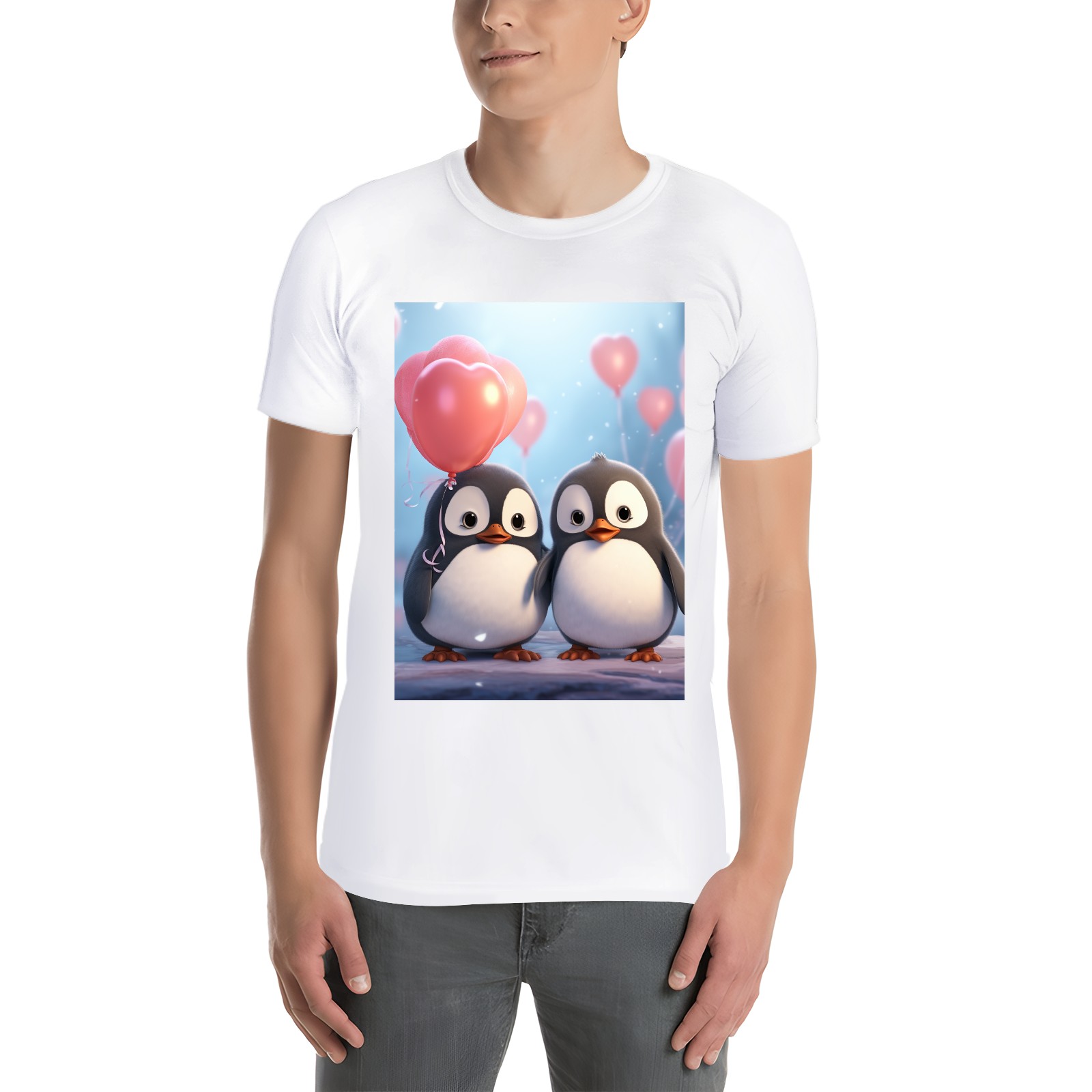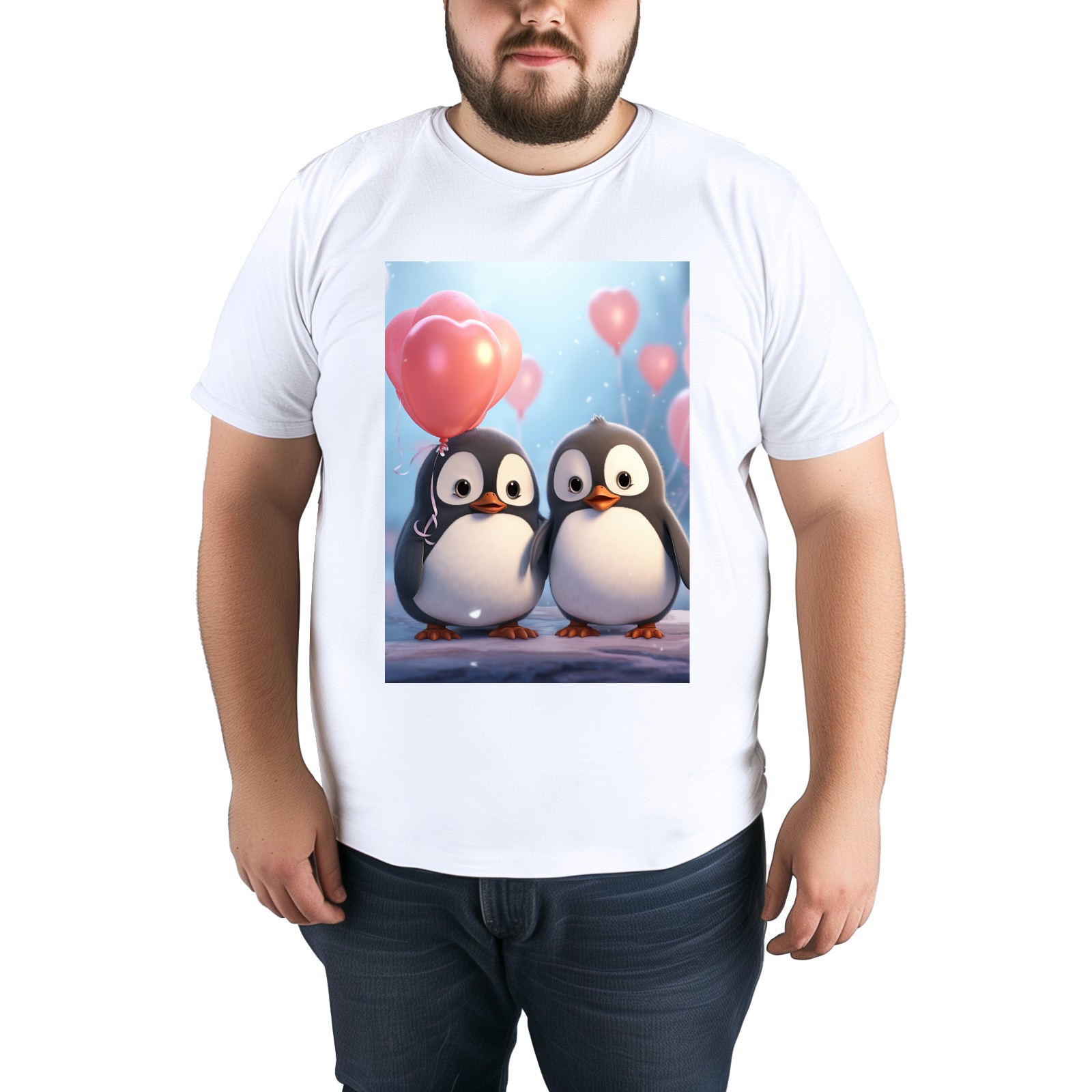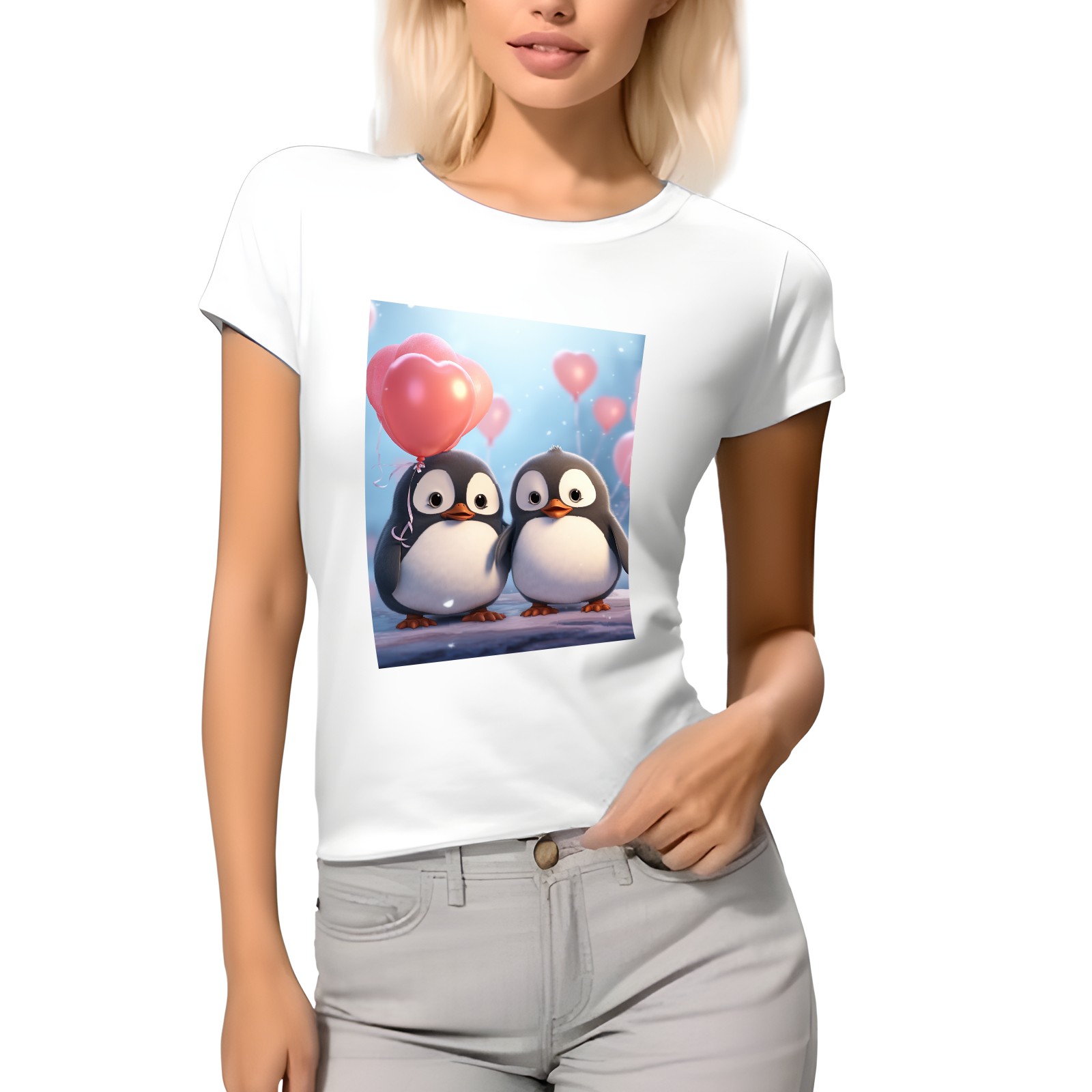 Basic Oversize Tees For WomenCouple Penguins Holding Hearts Balloons (15) Loose Boyfriend Shirts Casual Blouse round neck
