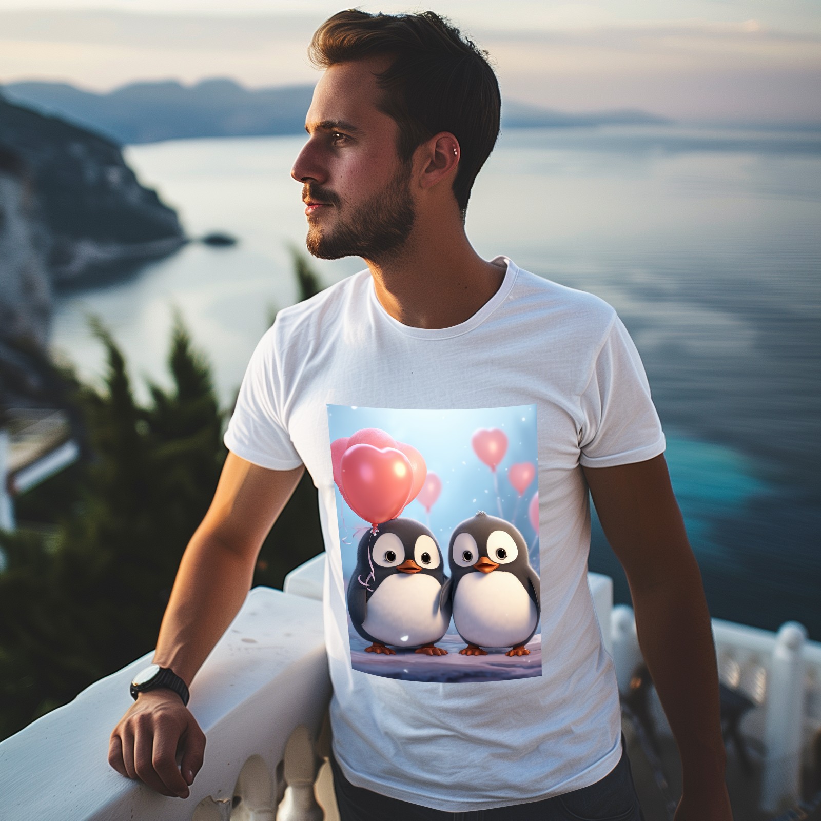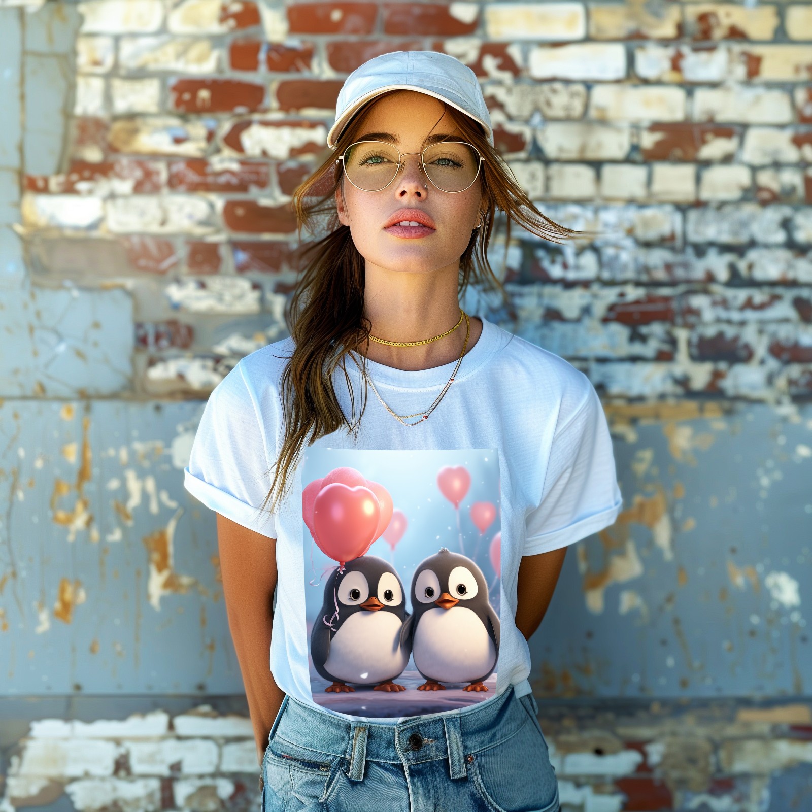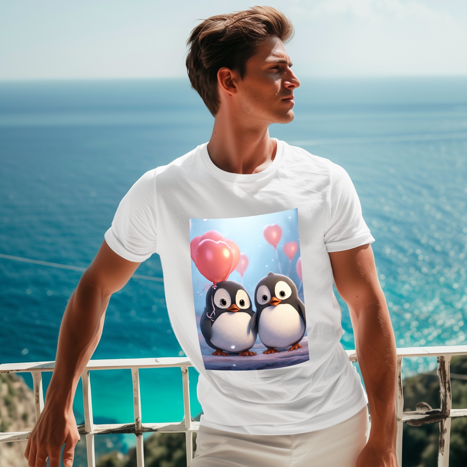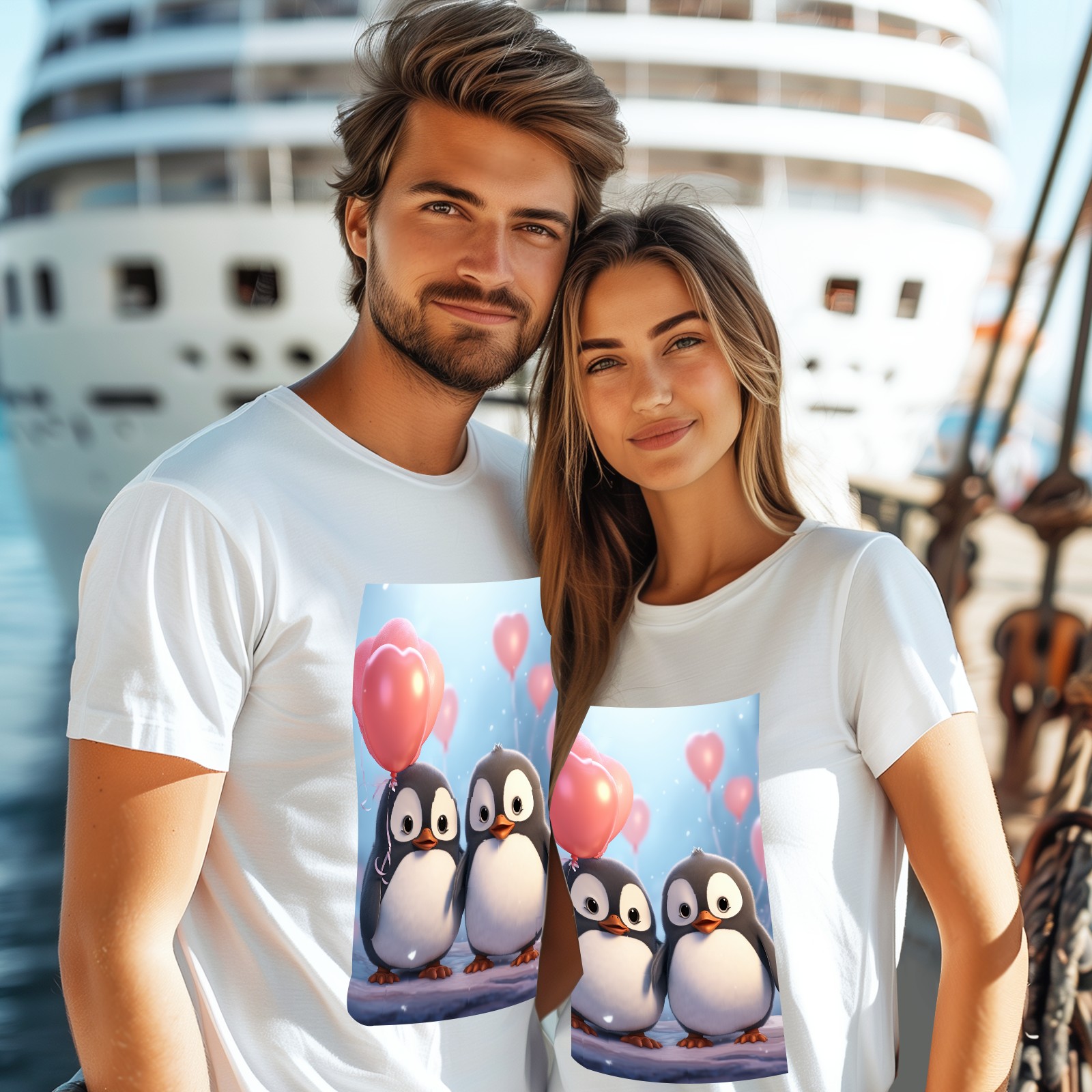 Basic Oversize Tees For WomenCouple Penguins Holding Hearts Balloons (15) Loose Boyfriend Shirts Casual Blouse round neck