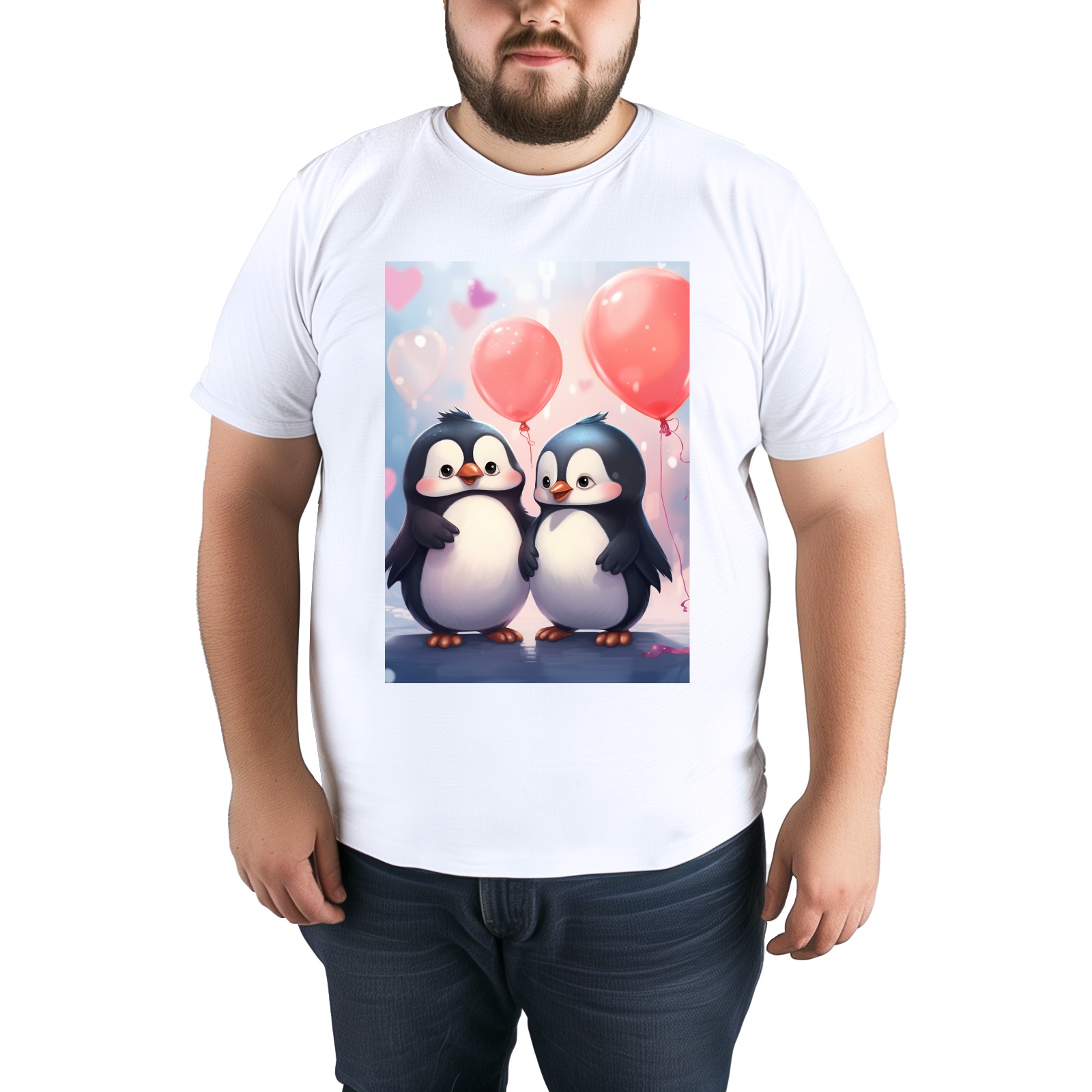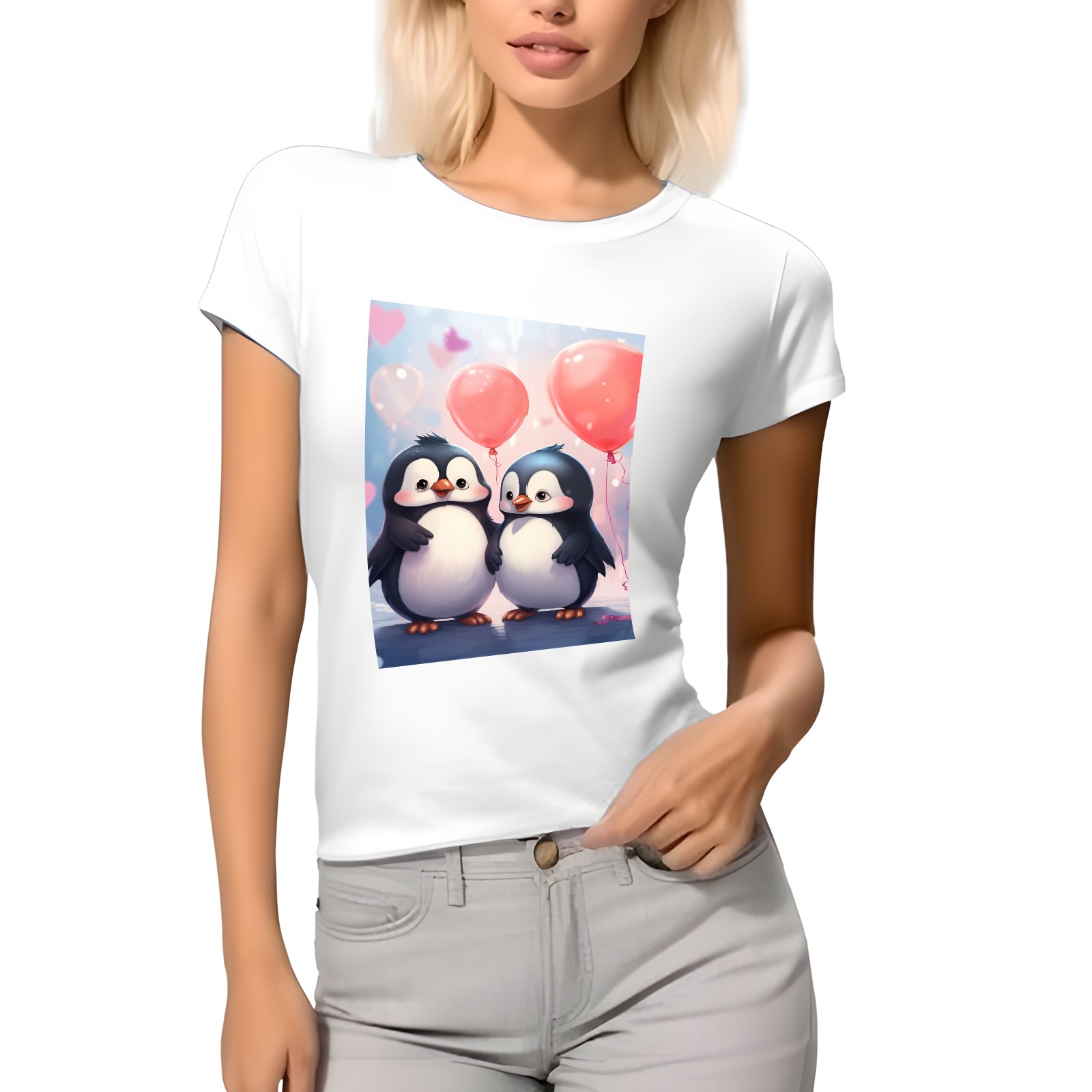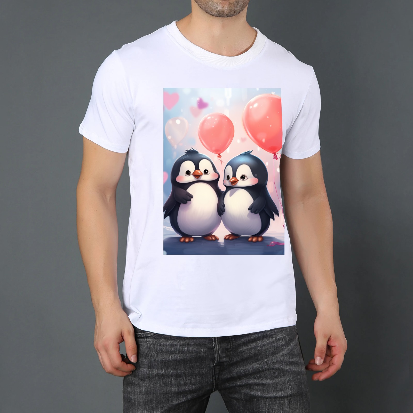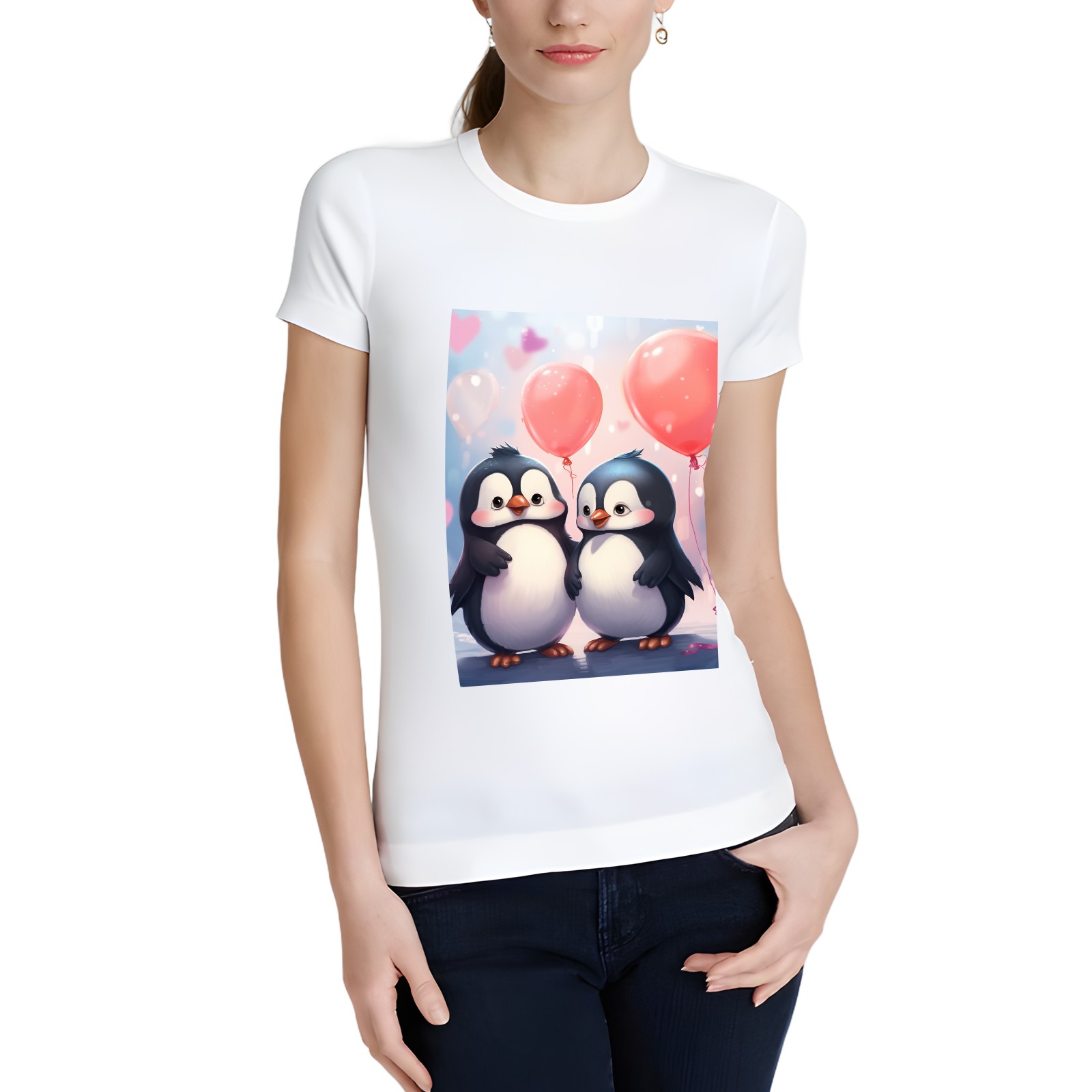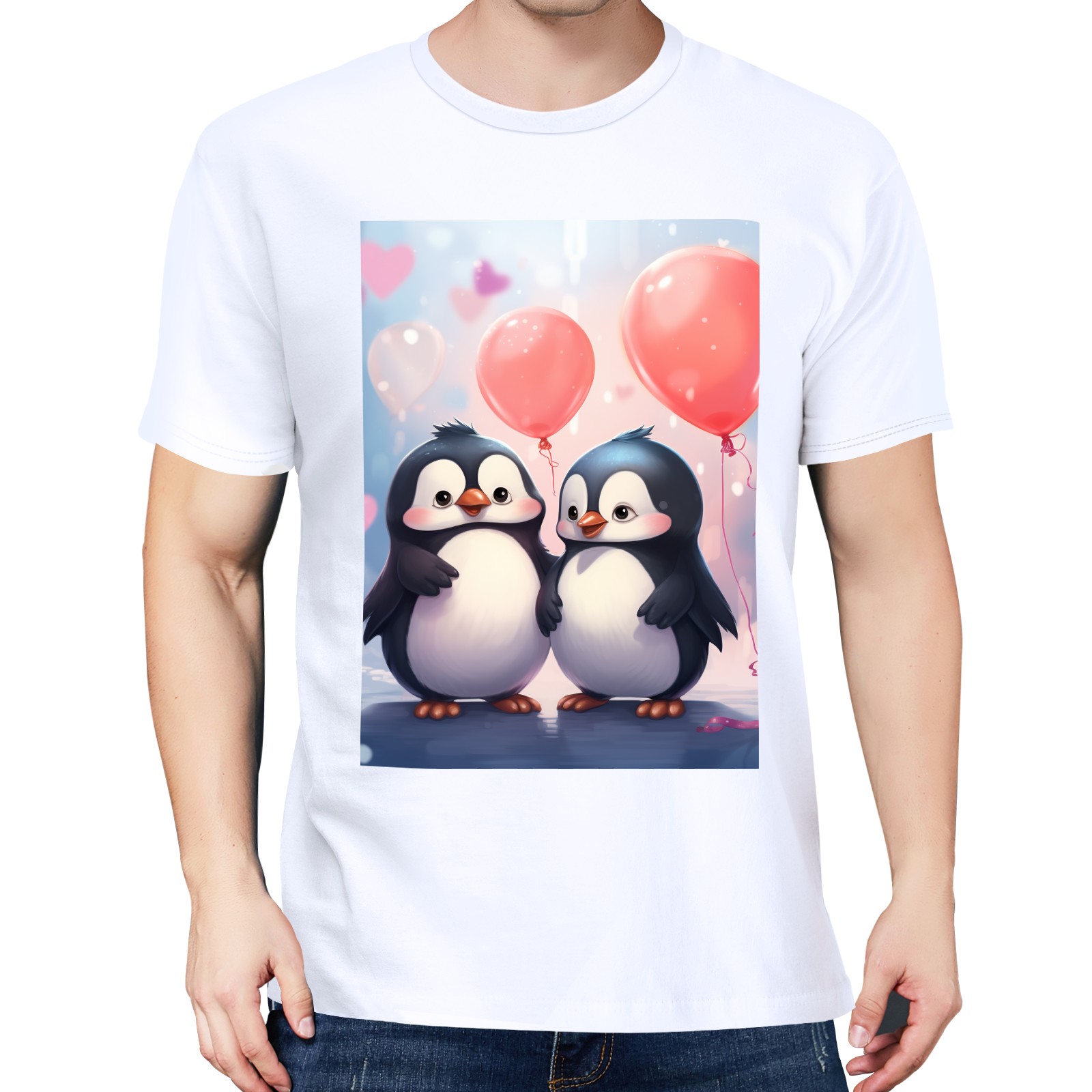 Basic Oversize Tees For WomenCouple Penguins Holding Hearts Balloons (16) Loose Boyfriend Shirts Casual Blouse round neck