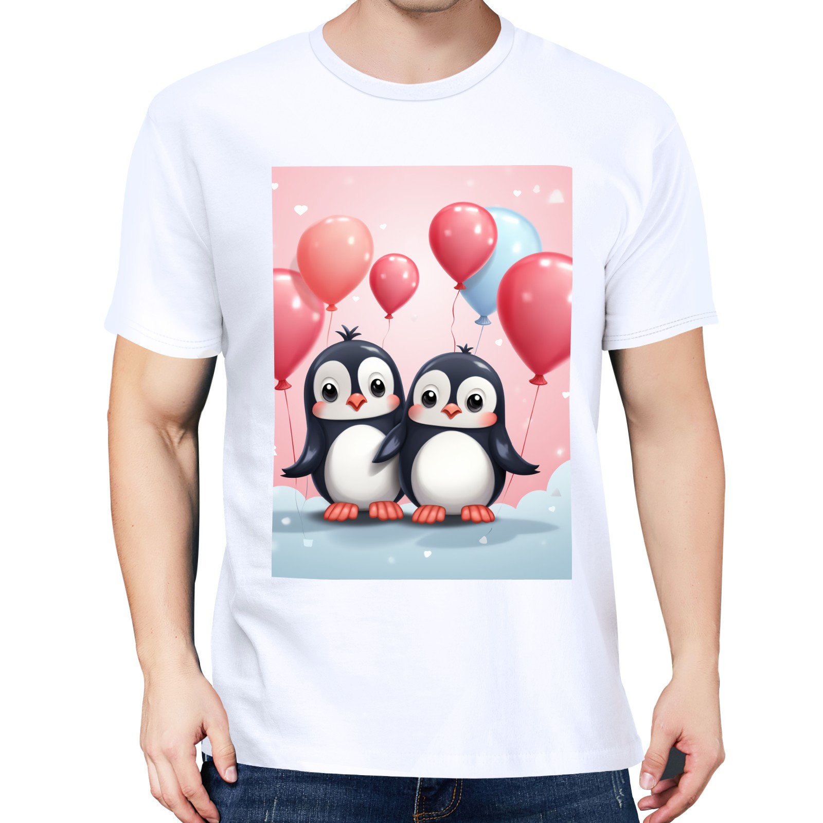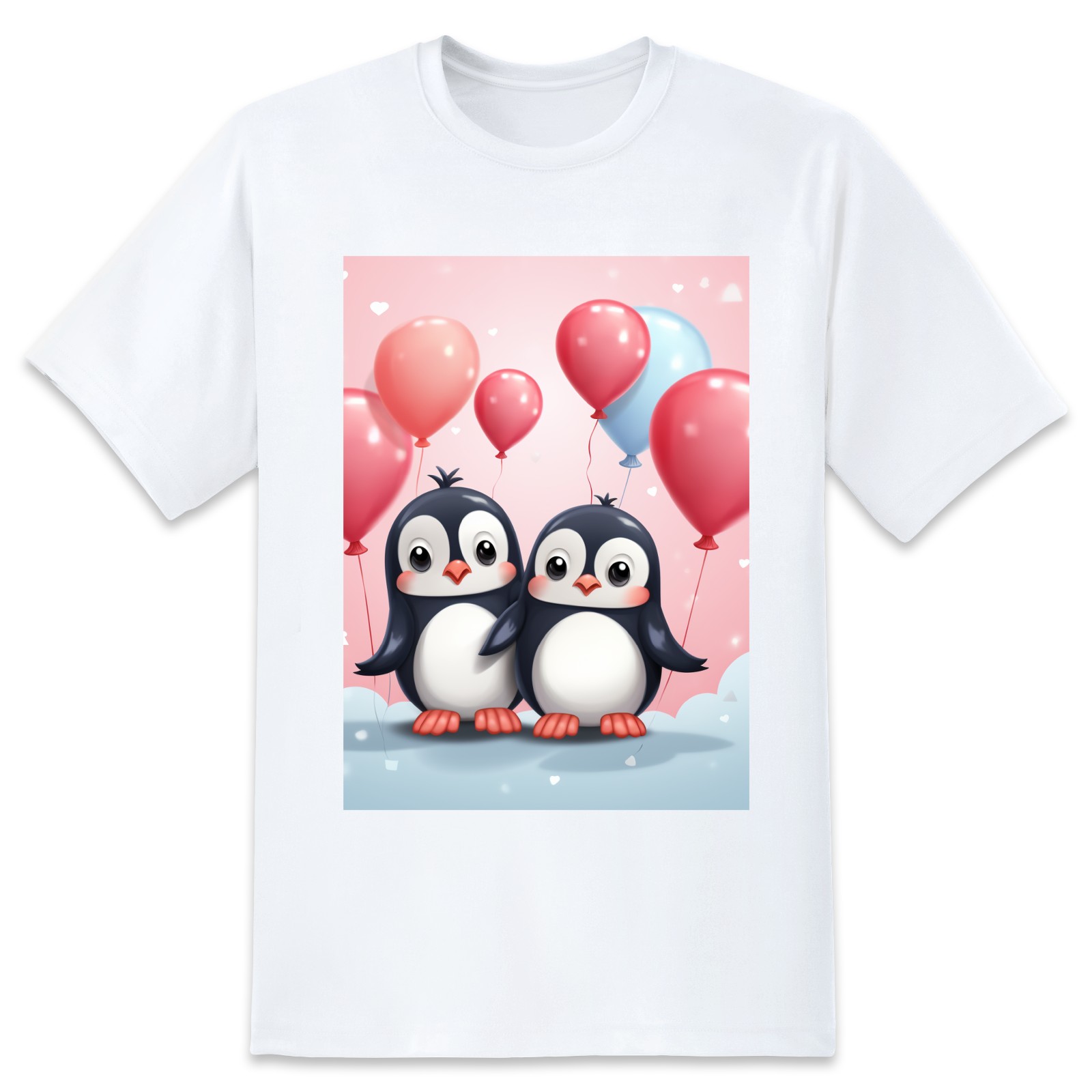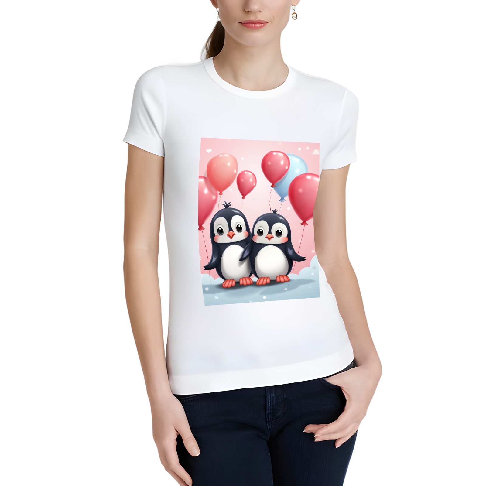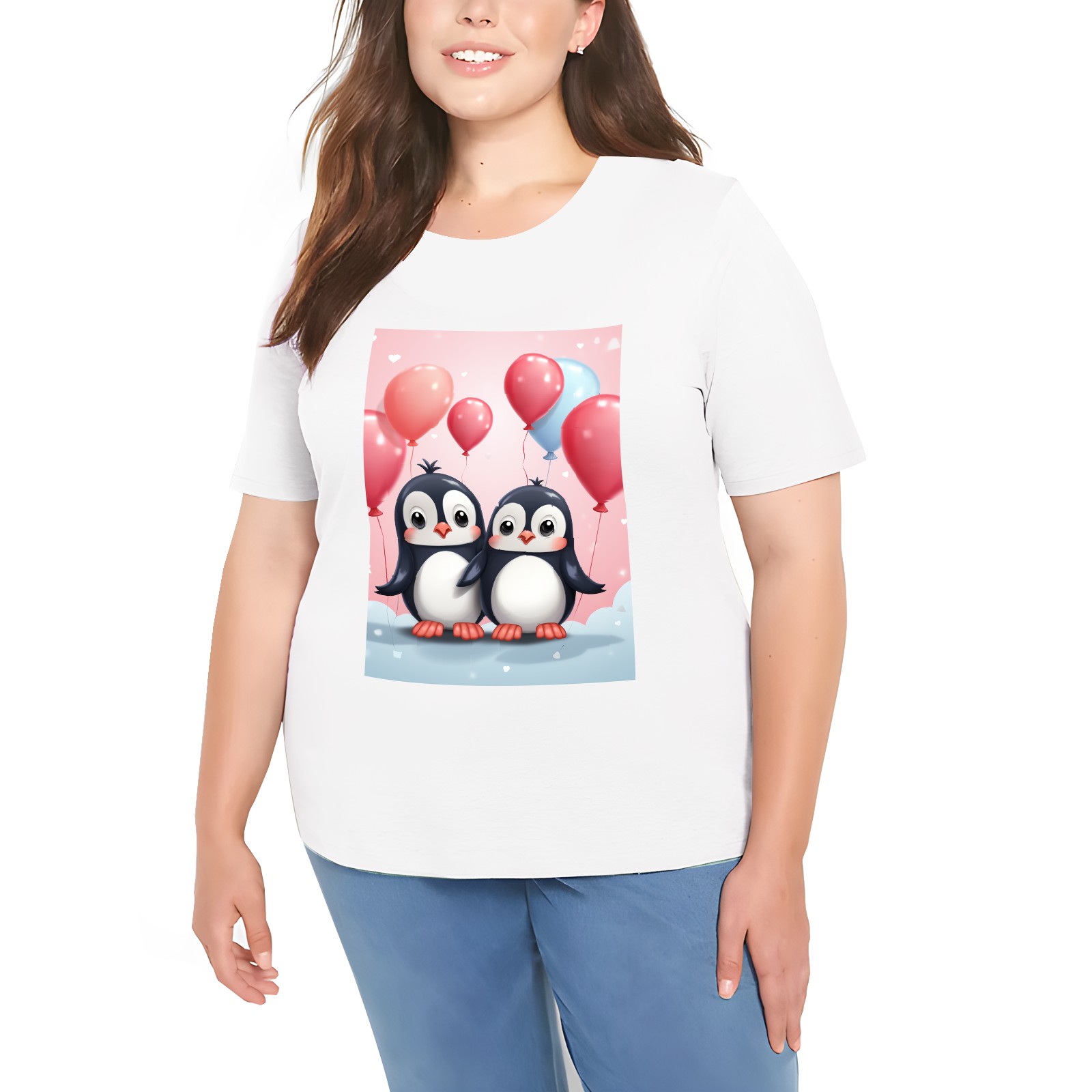Basic Oversize Tees For WomenCouple Penguins Holding Hearts Balloons (14) Loose Boyfriend Shirts Casual Blouse round neck