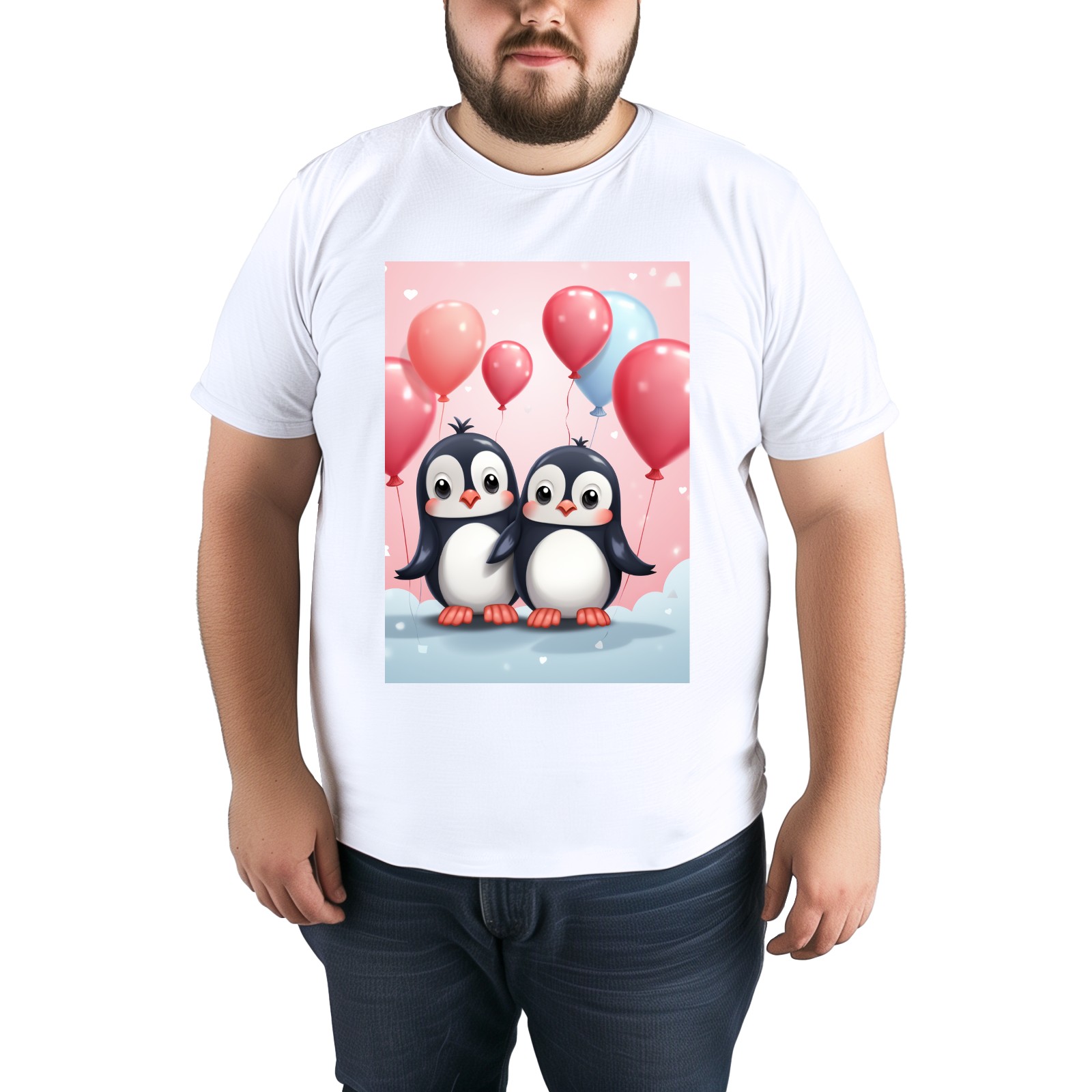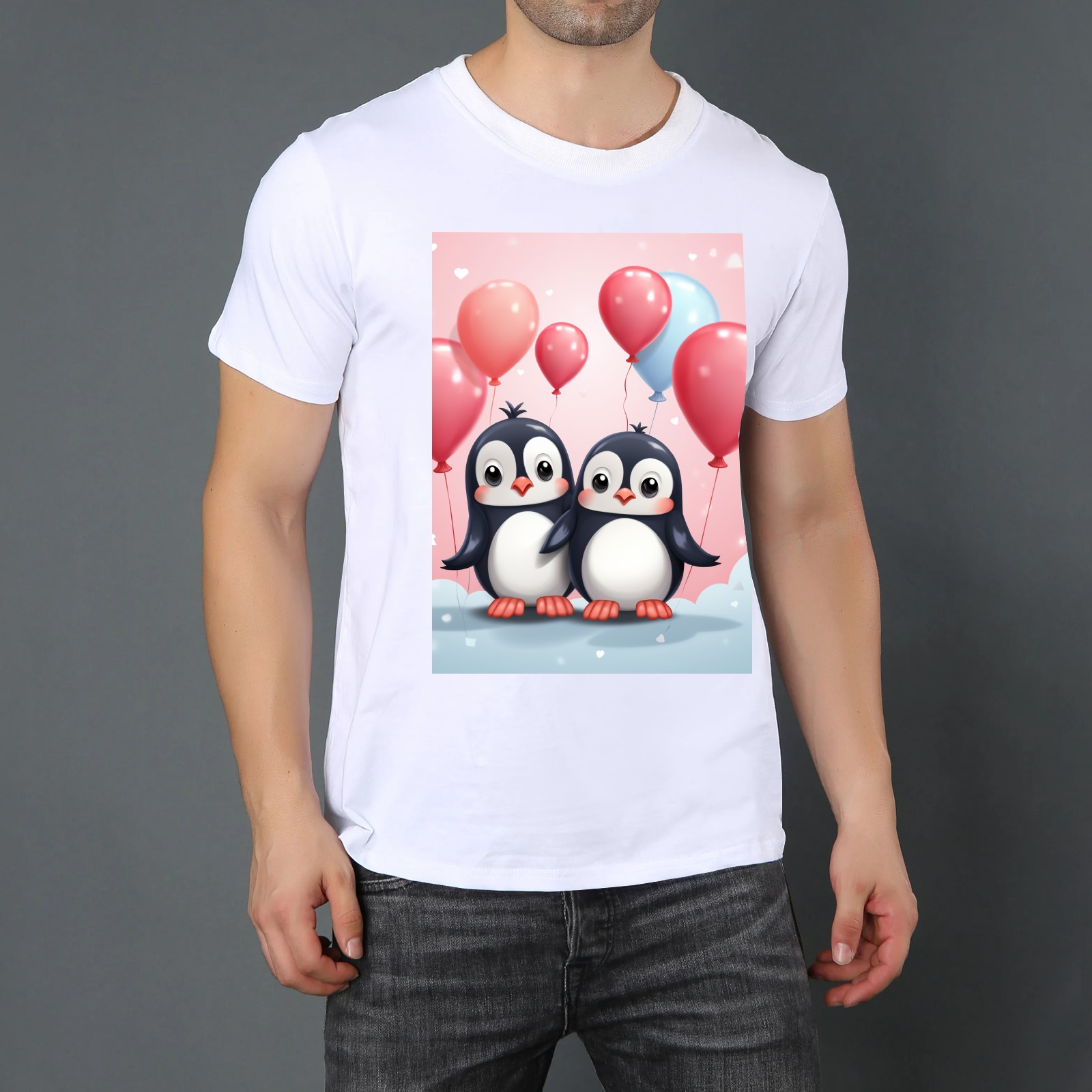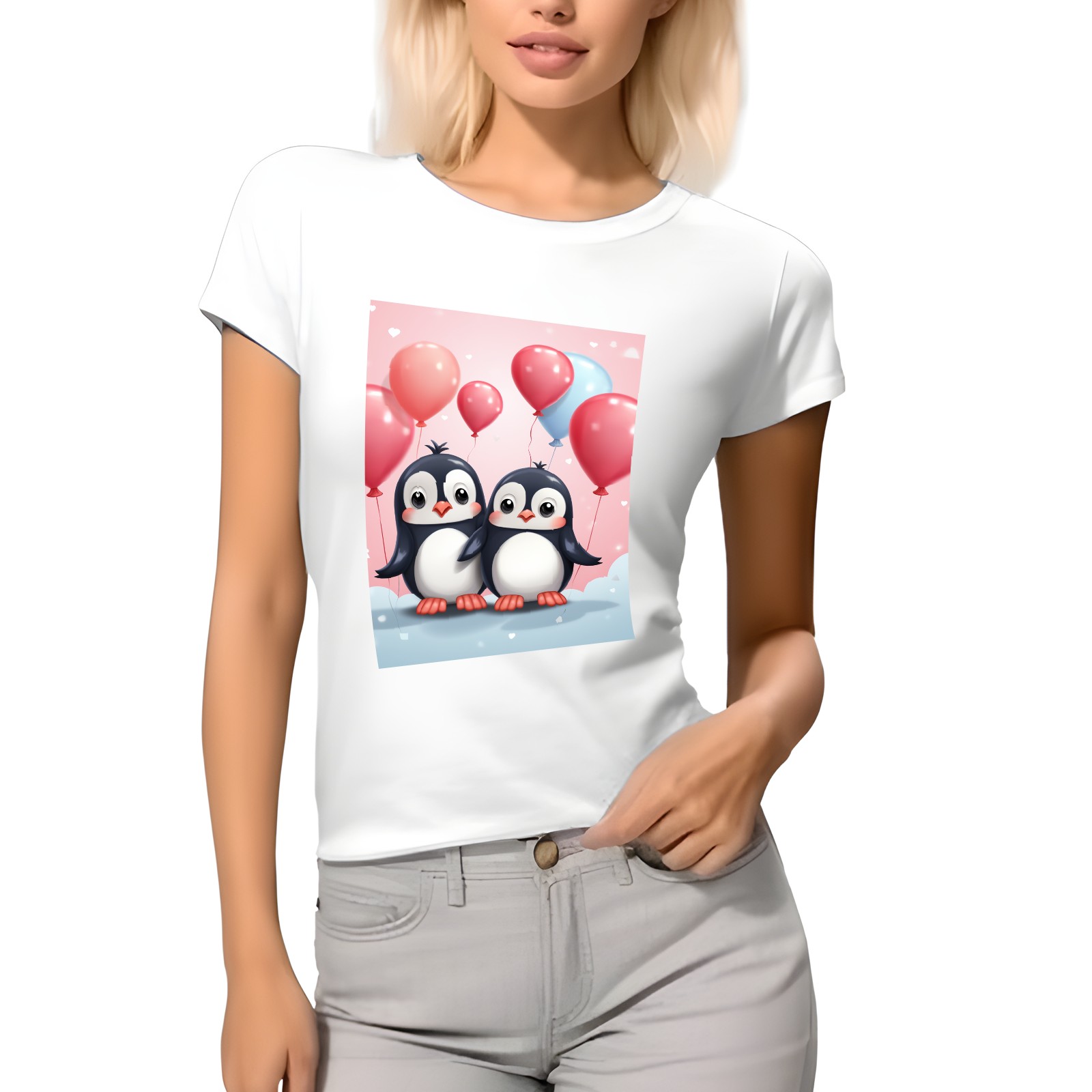 Basic Oversize Tees For WomenCouple Penguins Holding Hearts Balloons (14) Loose Boyfriend Shirts Casual Blouse round neck