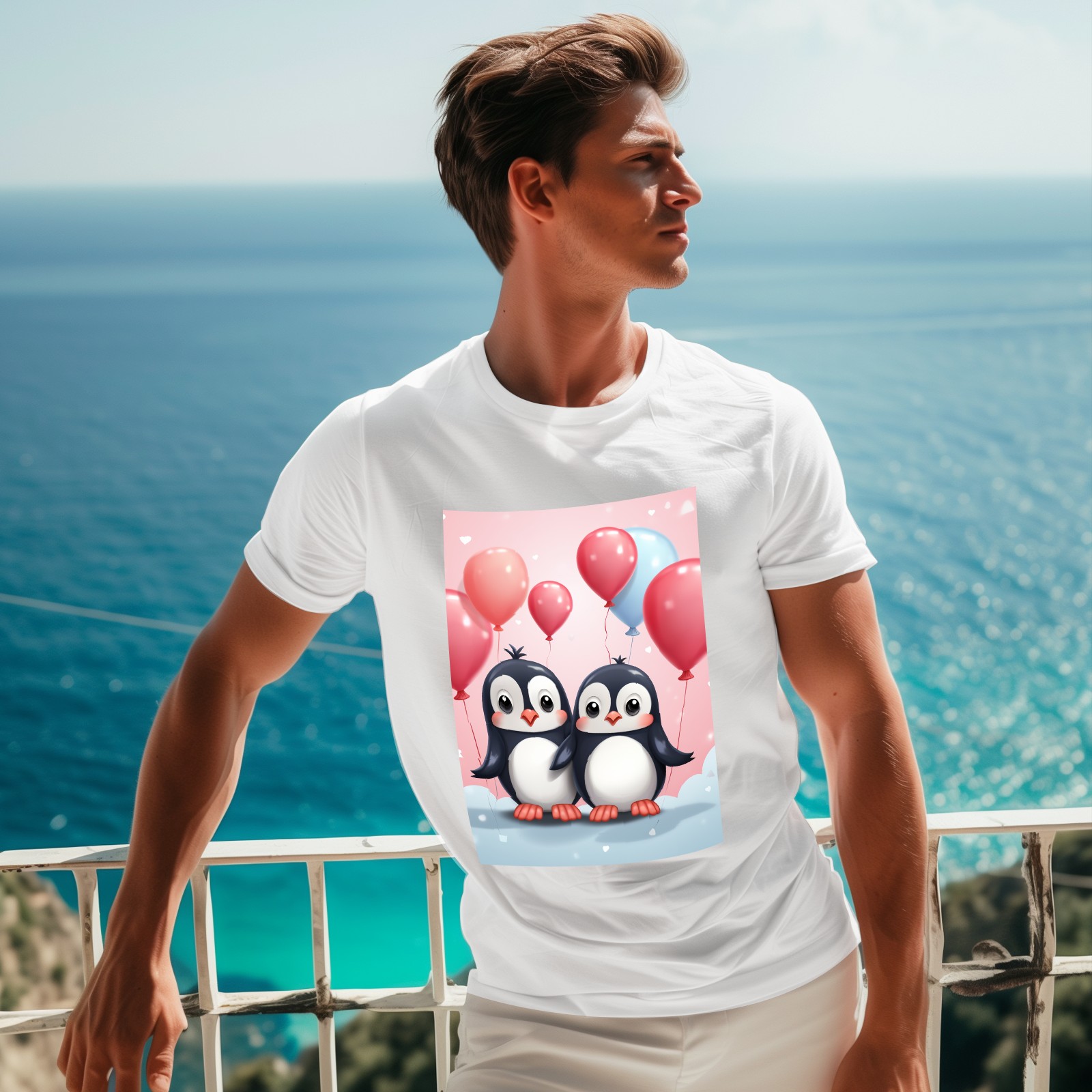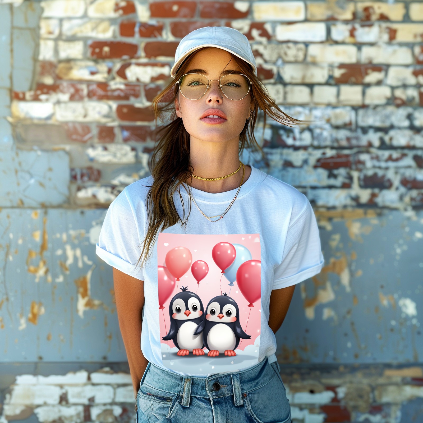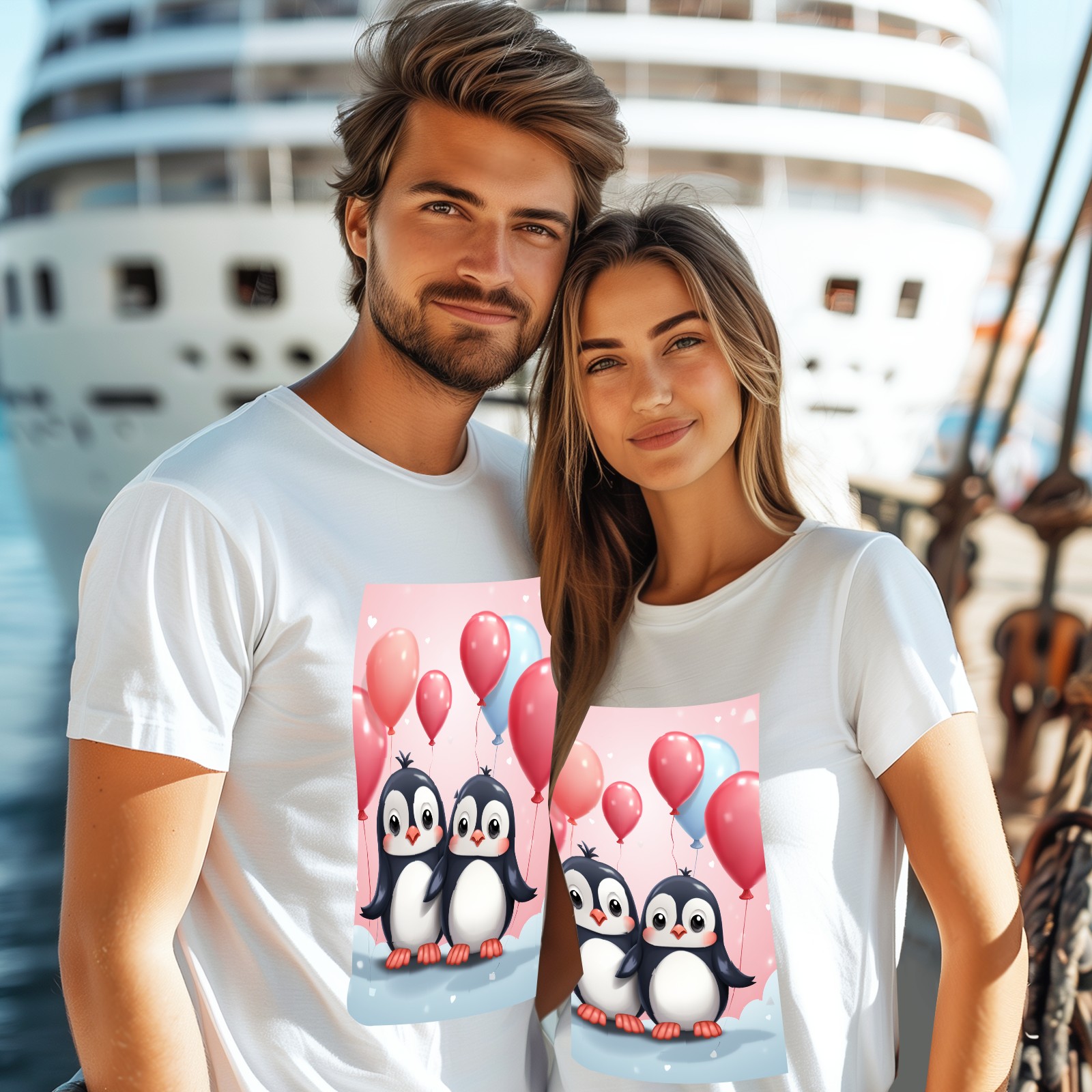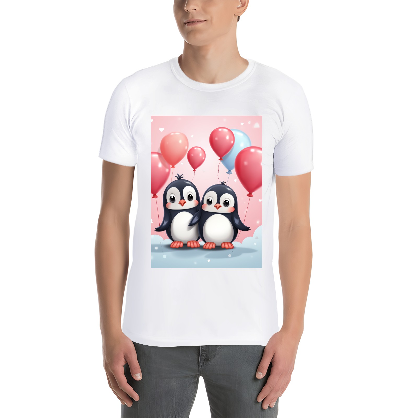 Basic Oversize Tees For WomenCouple Penguins Holding Hearts Balloons (14) Loose Boyfriend Shirts Casual Blouse round neck