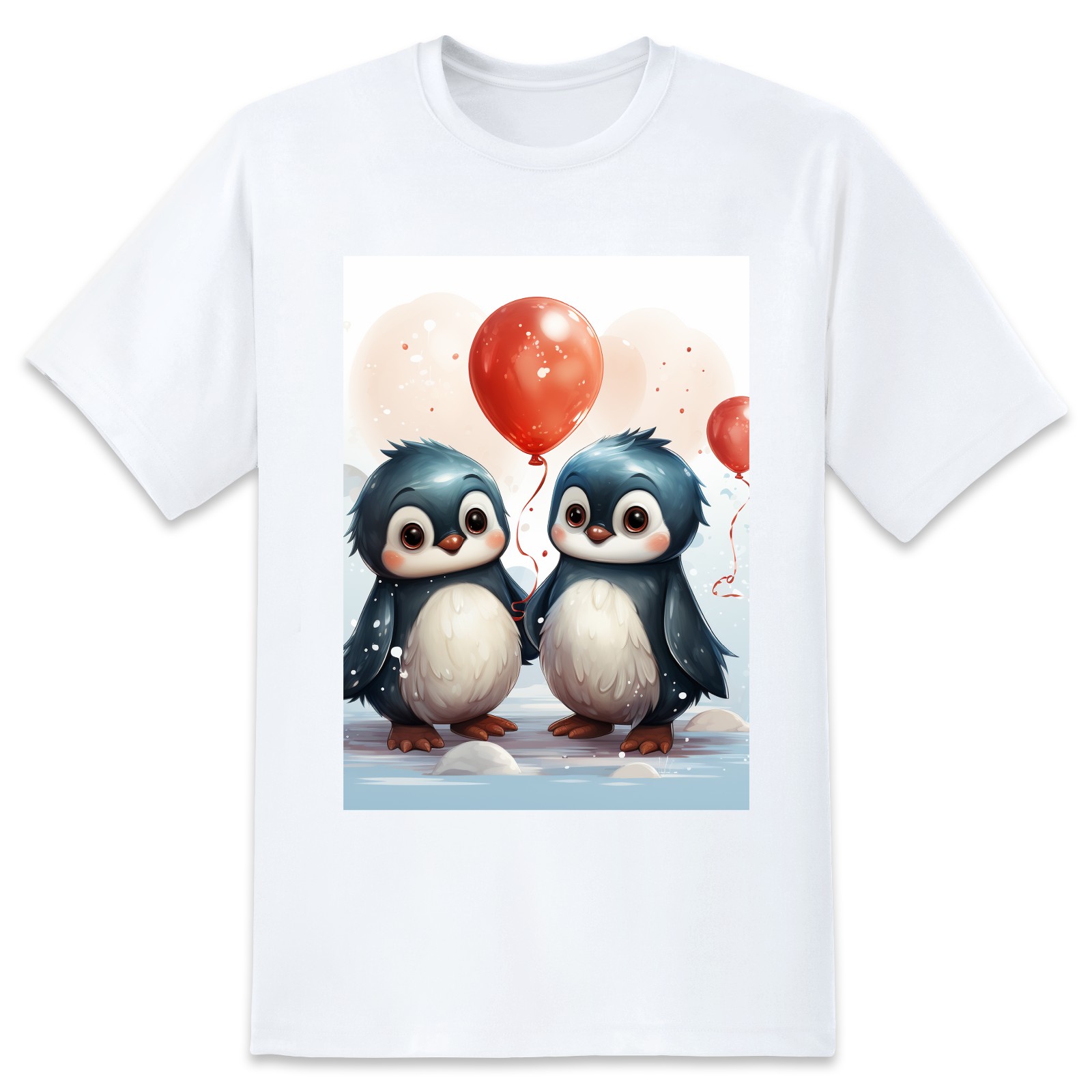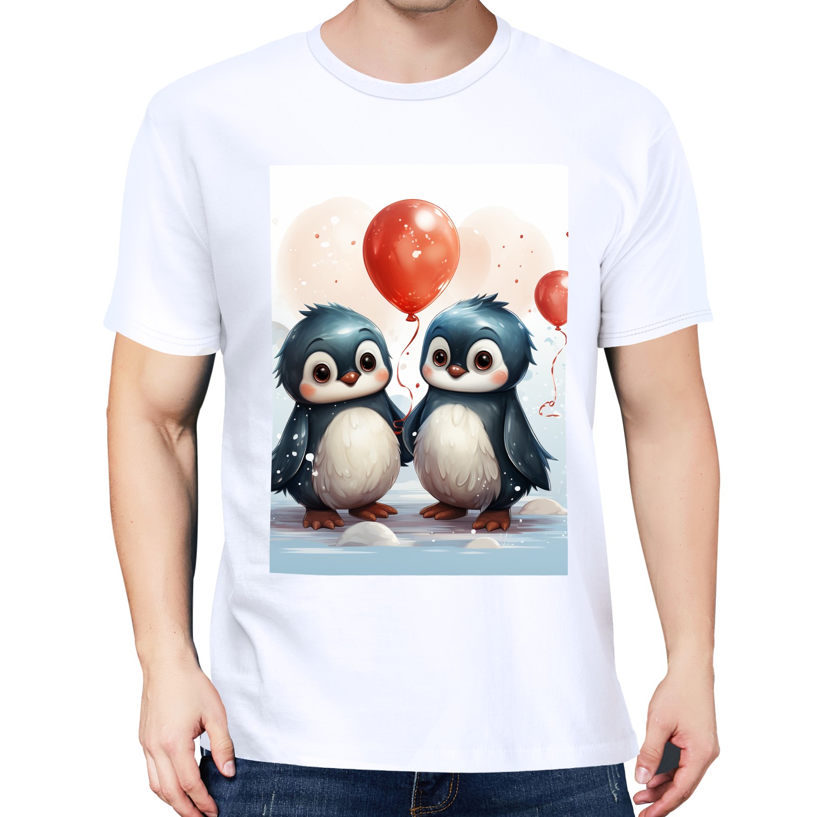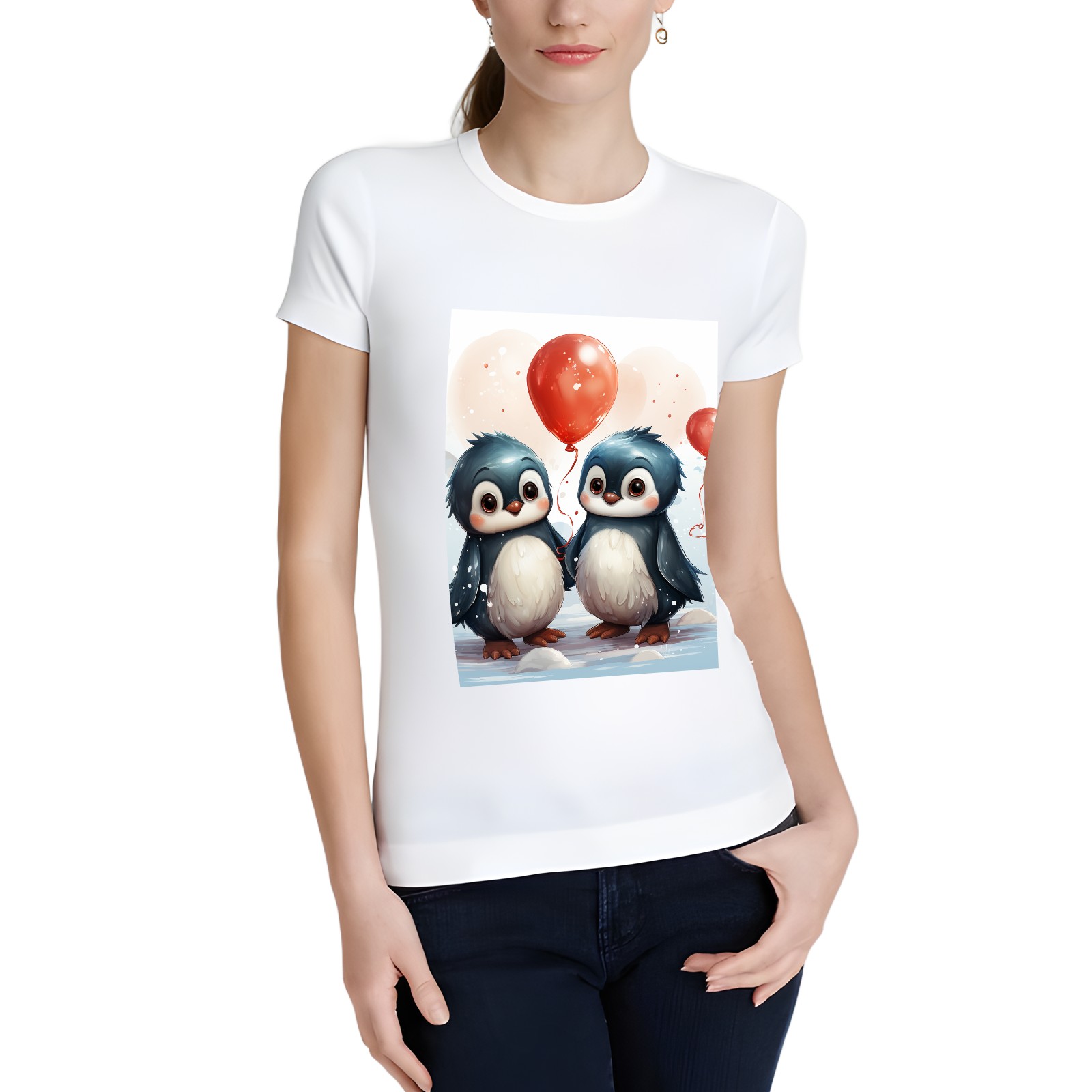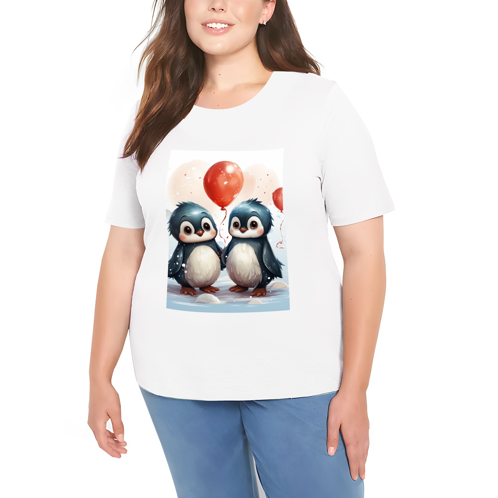 Basic Oversize Tees For WomenCouple Penguins Holding Hearts Balloons (13) Loose Boyfriend Shirts Casual Blouse round neck