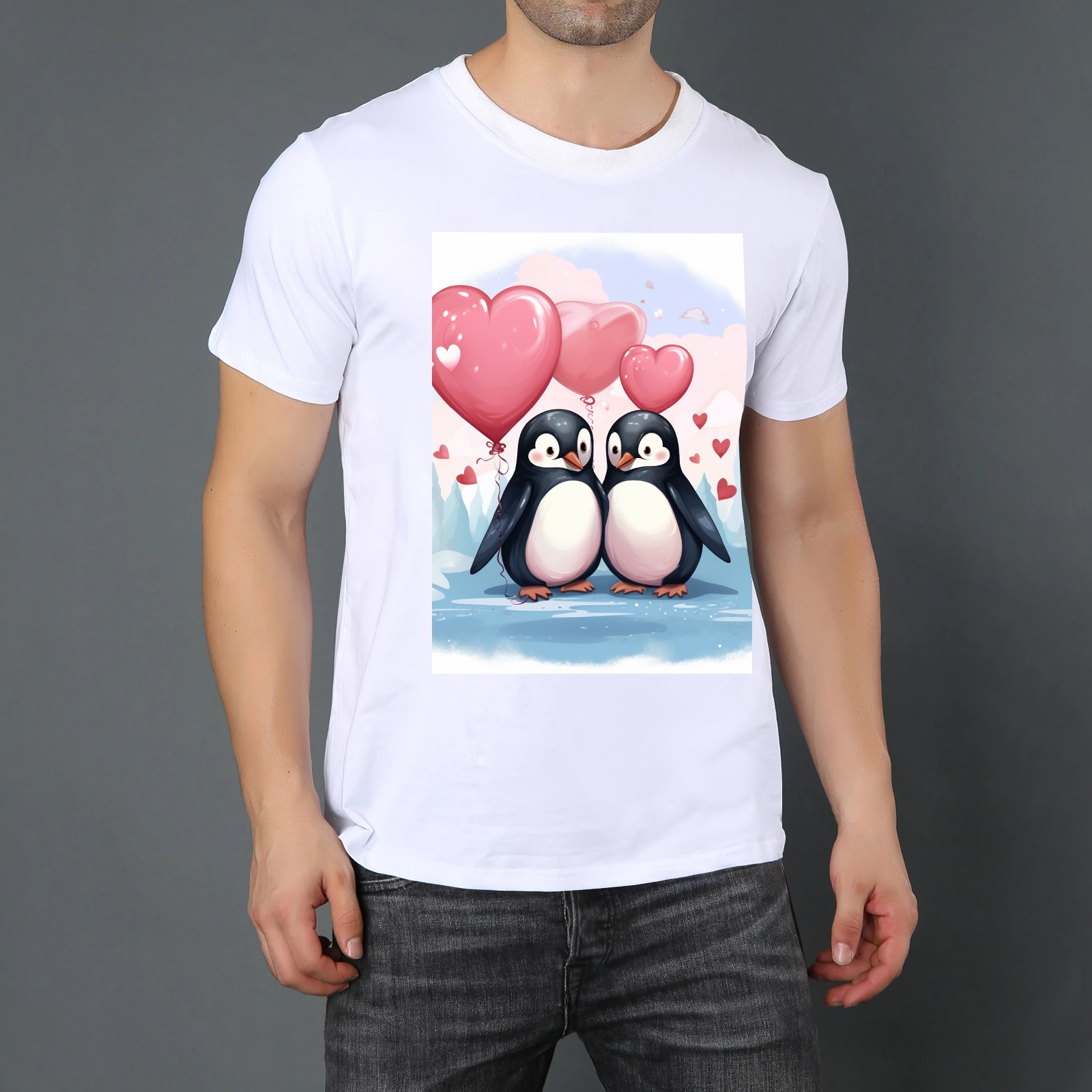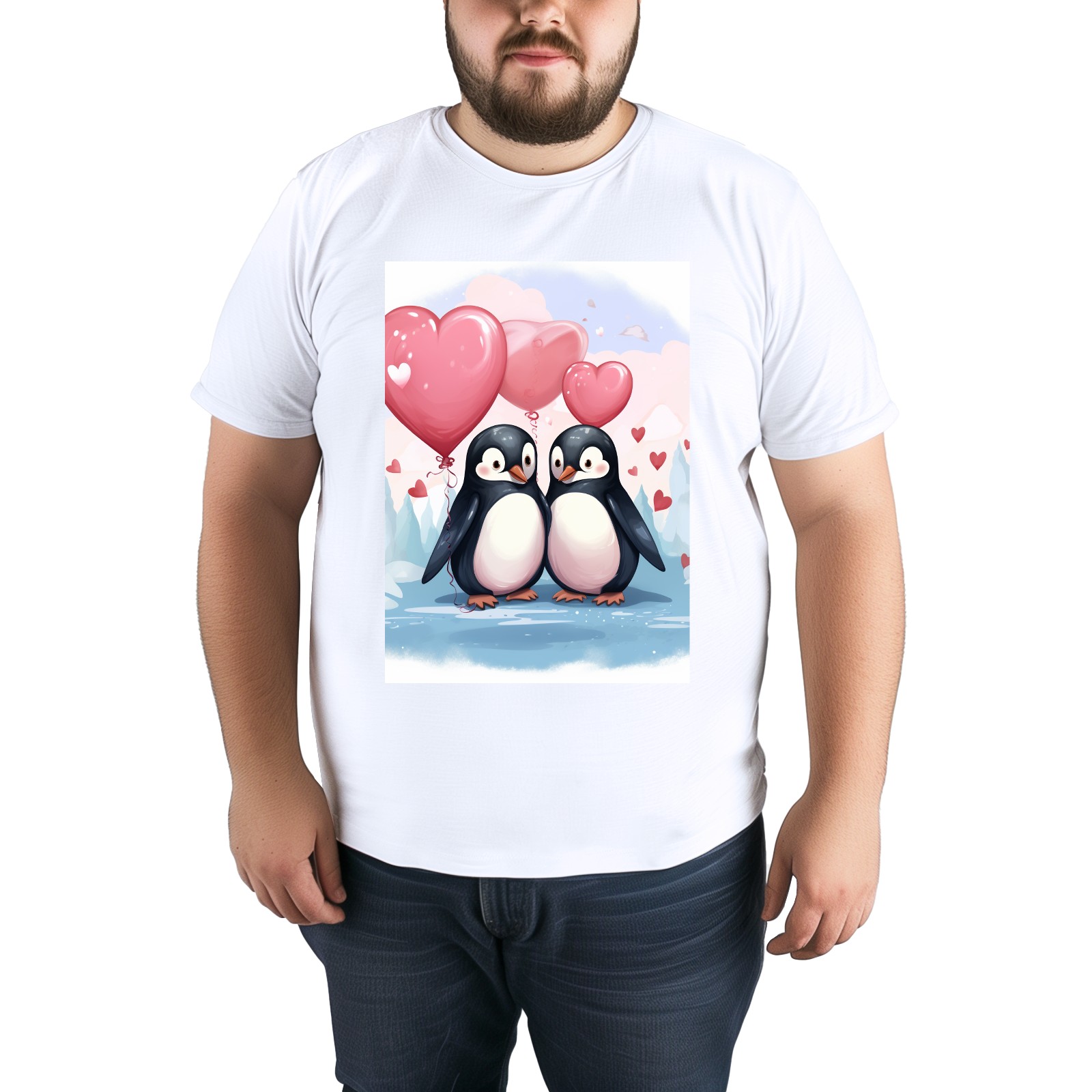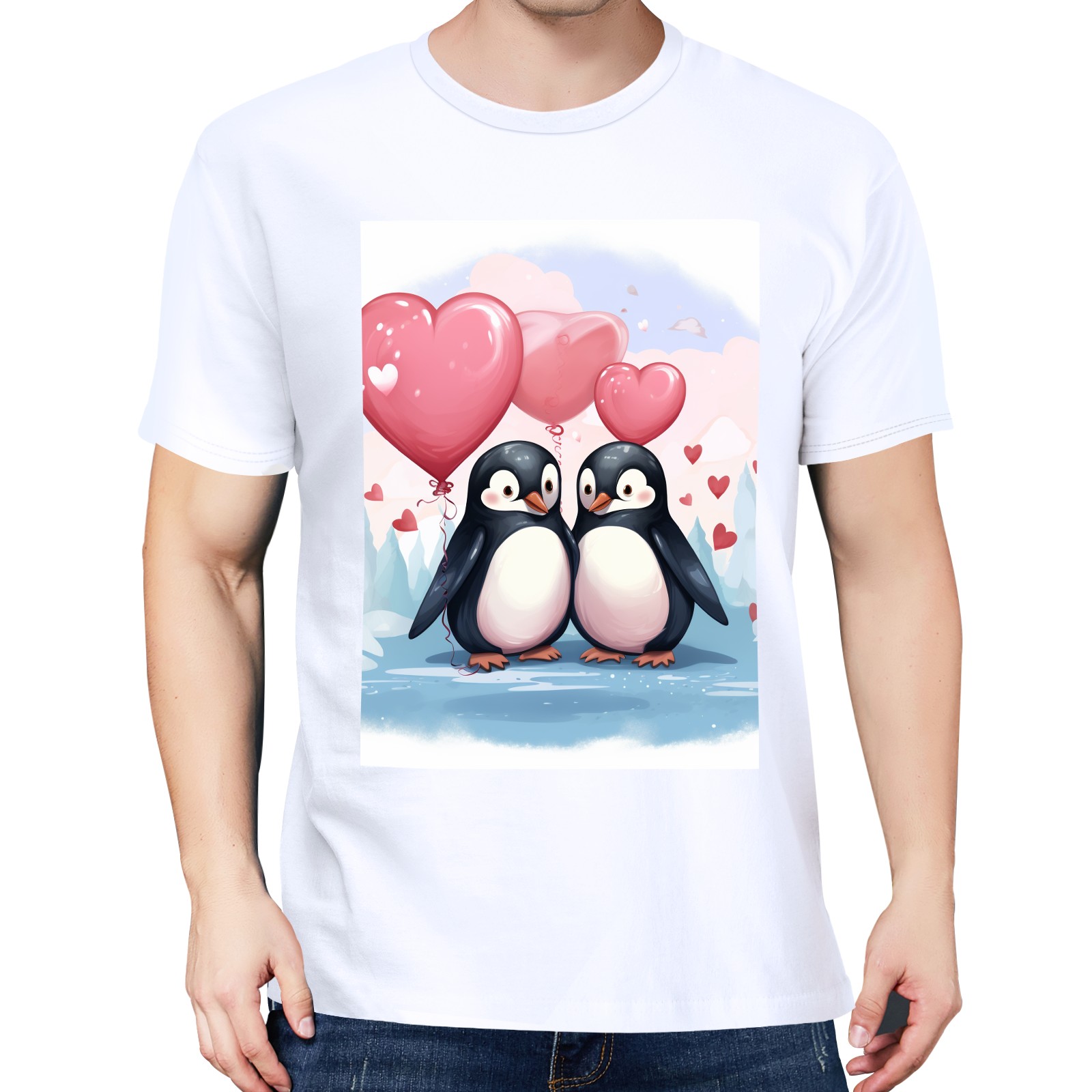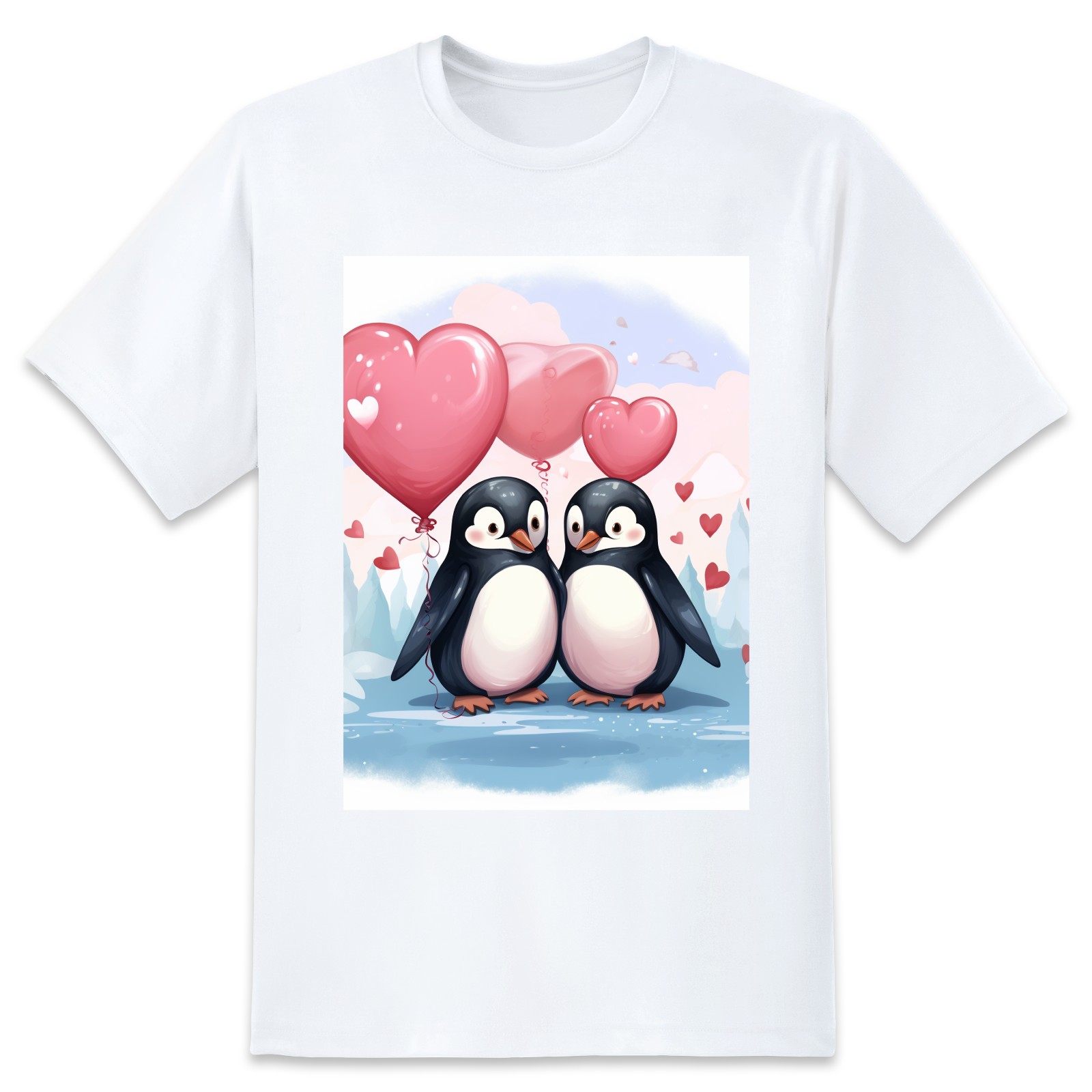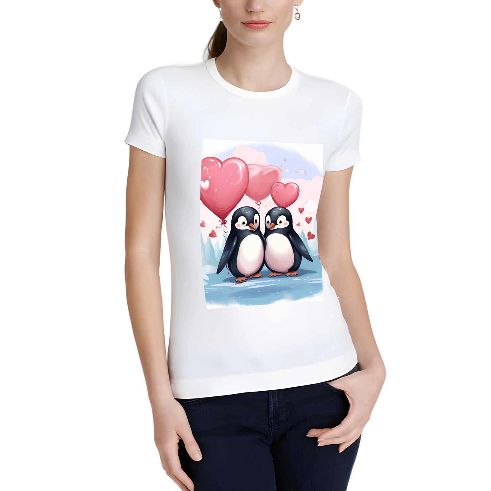 Basic Oversize Tees For WomenCouple Penguins Holding Hearts Balloons (11) Loose Boyfriend Shirts Casual Blouse round neck