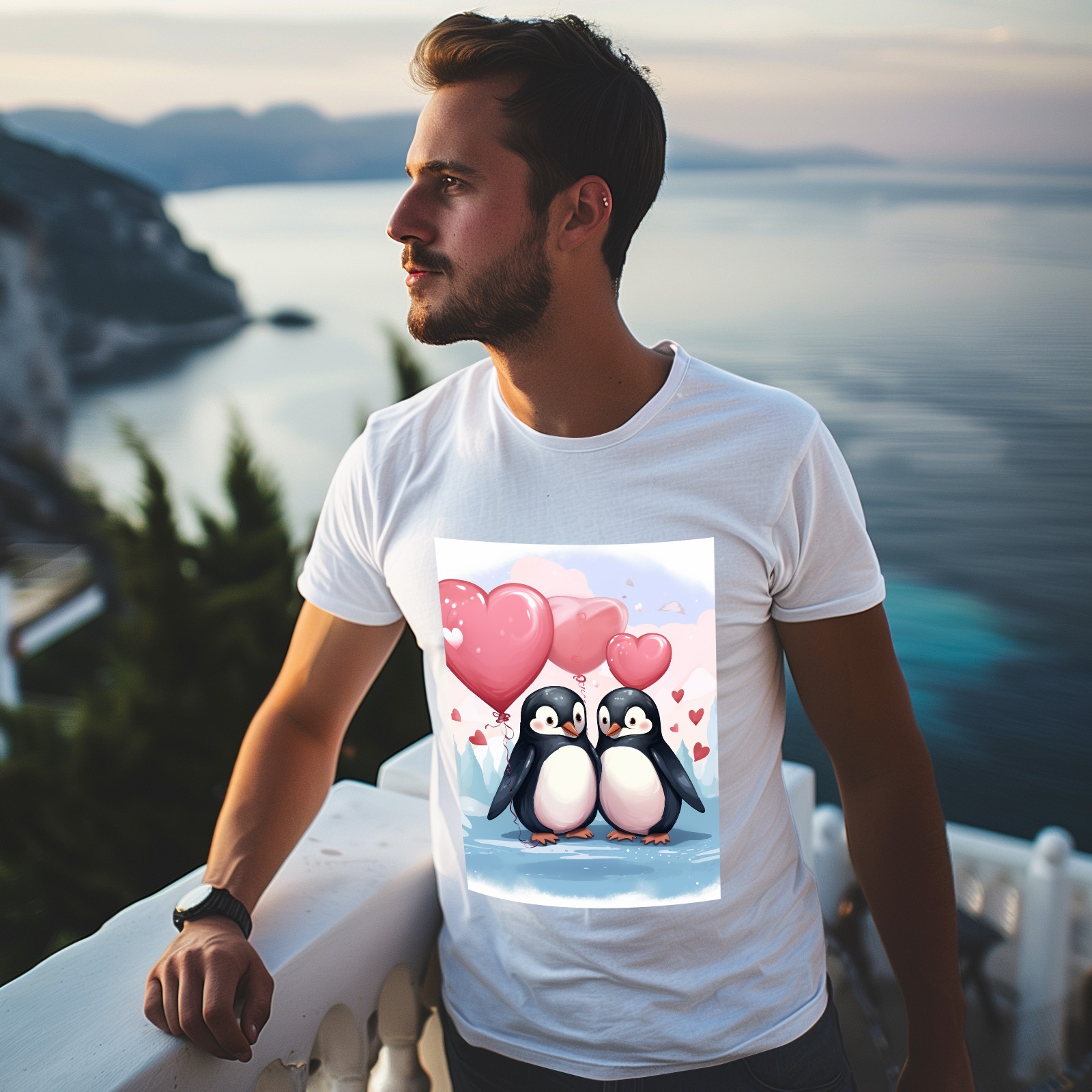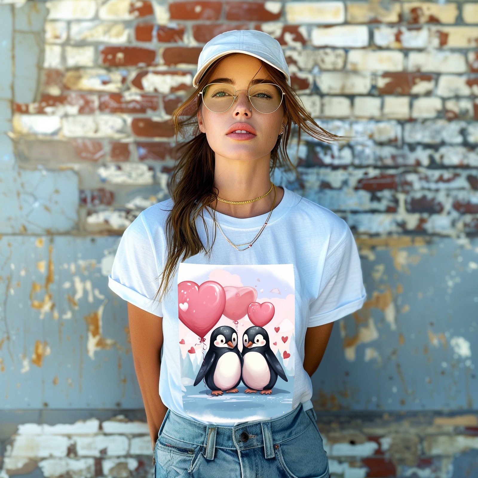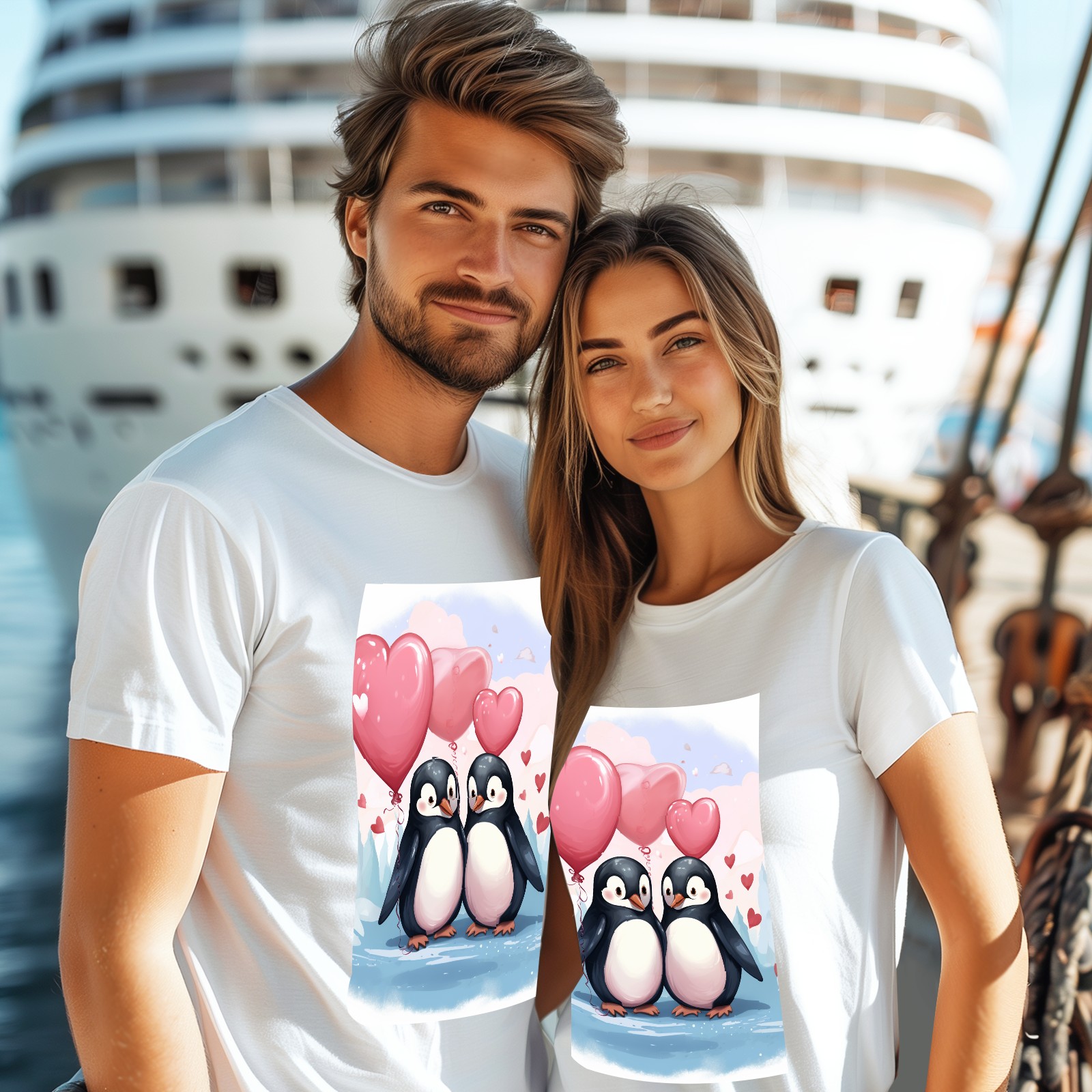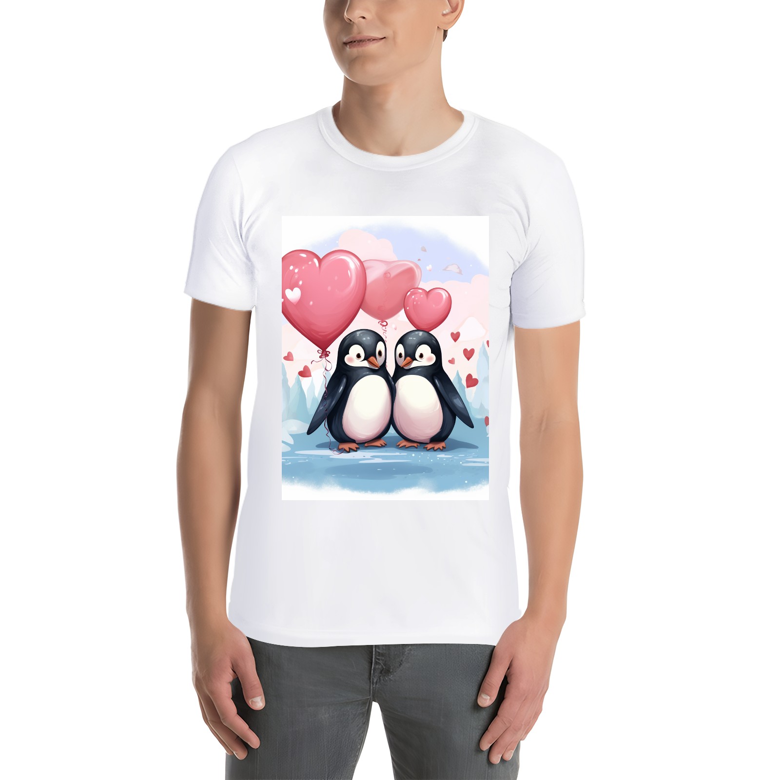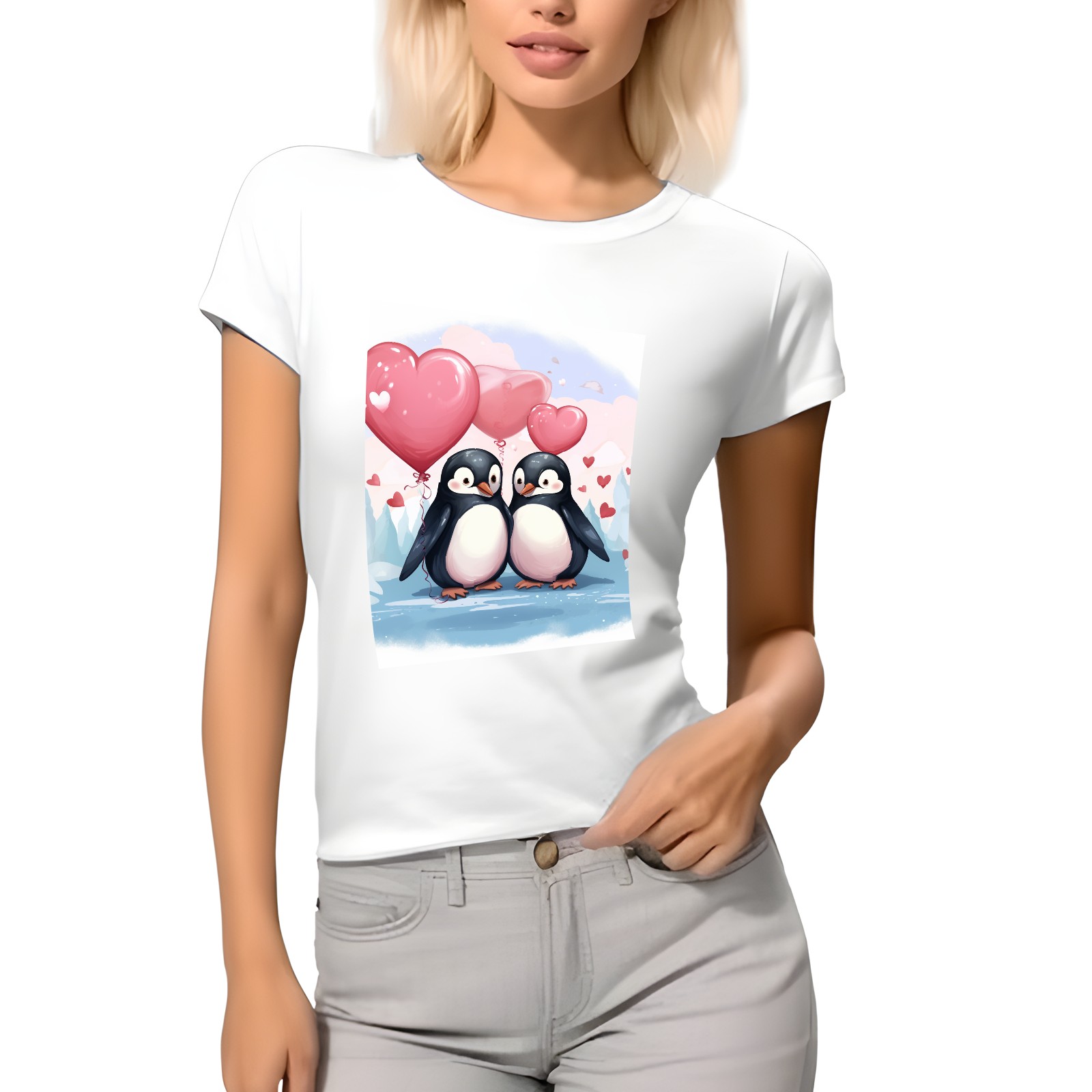 Basic Oversize Tees For WomenCouple Penguins Holding Hearts Balloons (11) Loose Boyfriend Shirts Casual Blouse round neck