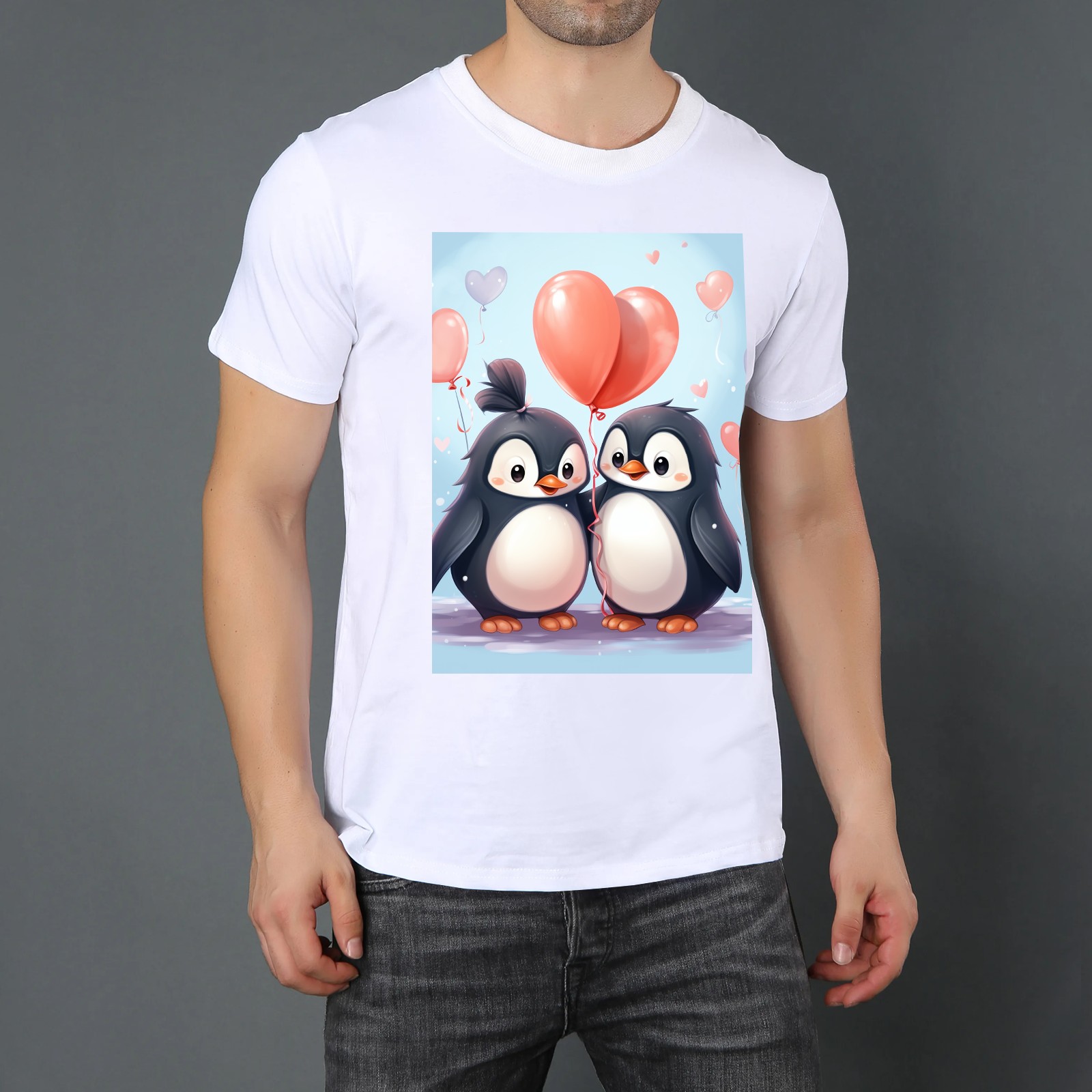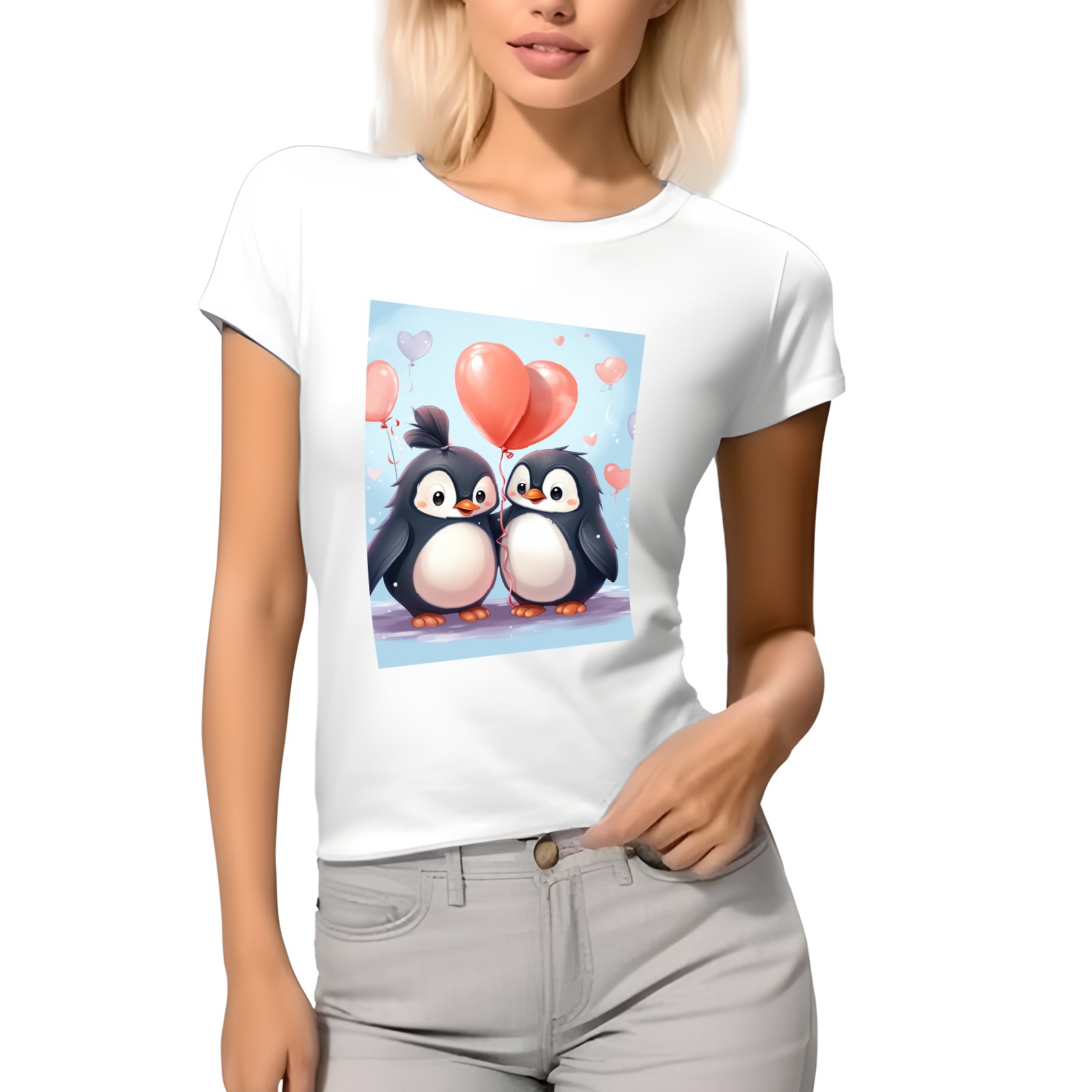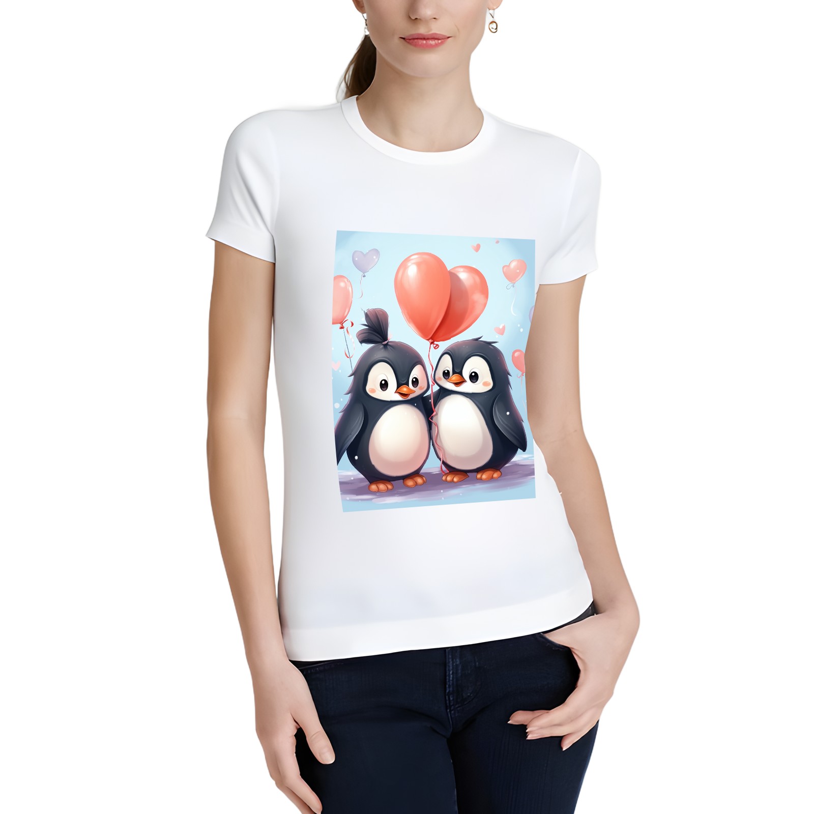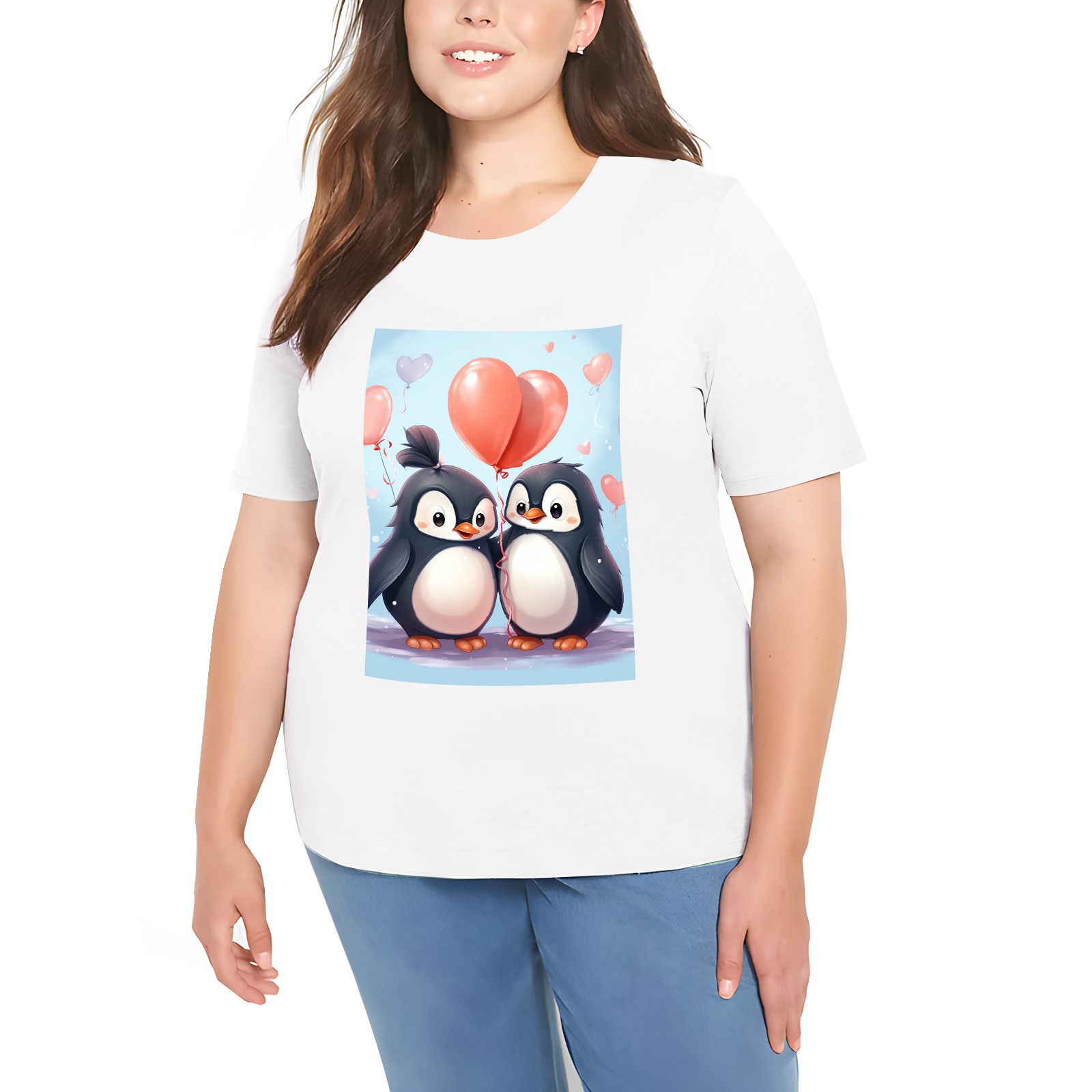 Basic Oversize Tees For WomenCouple Penguins Holding Hearts Balloons (9) Loose Boyfriend Shirts Casual Blouse round neck