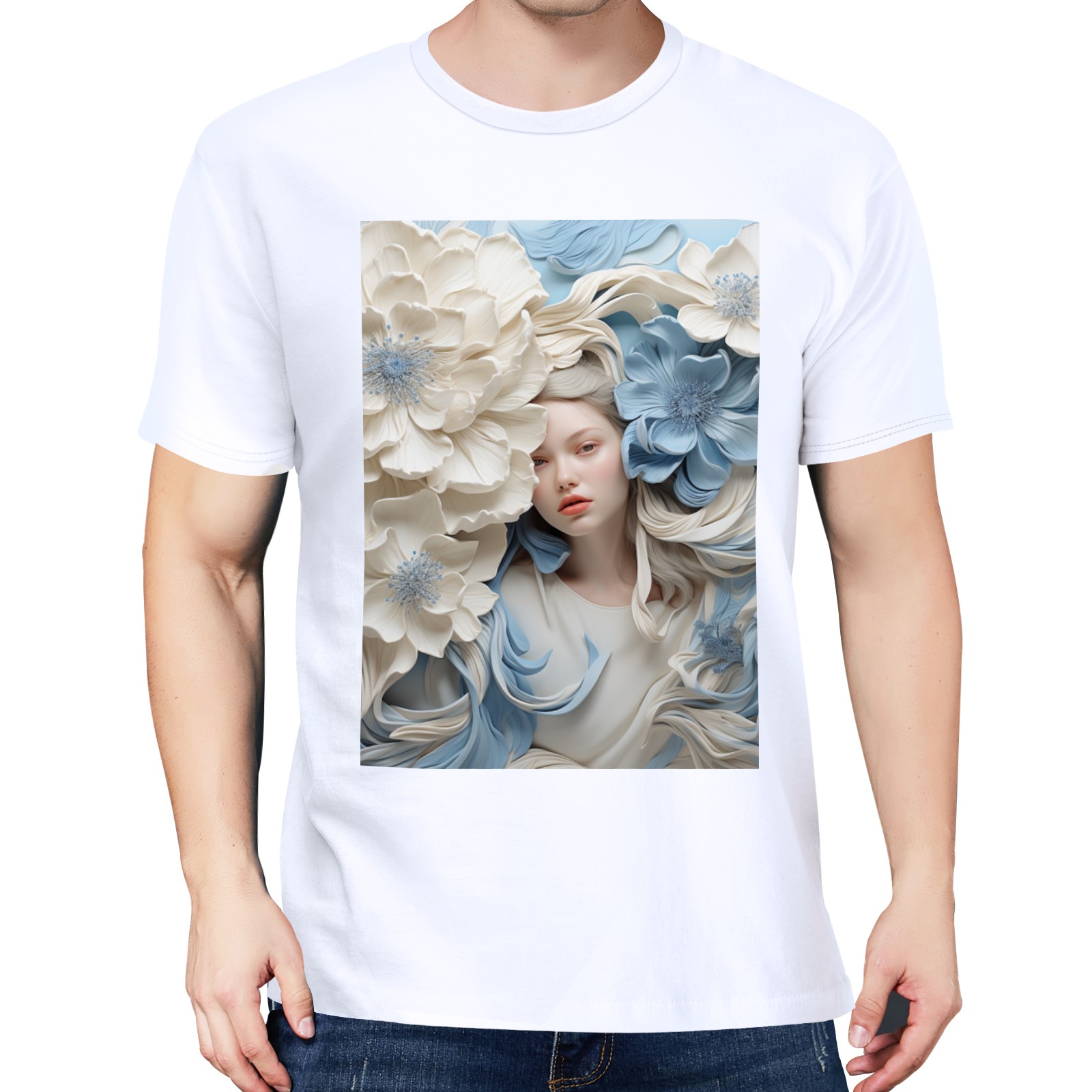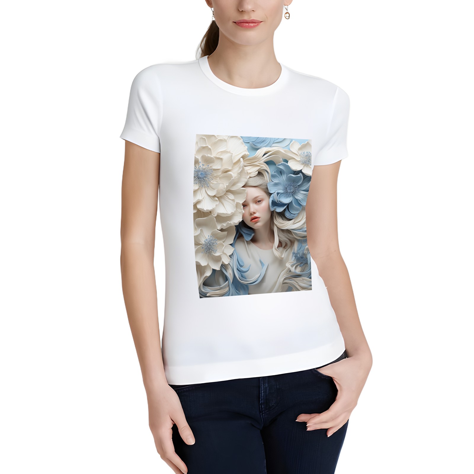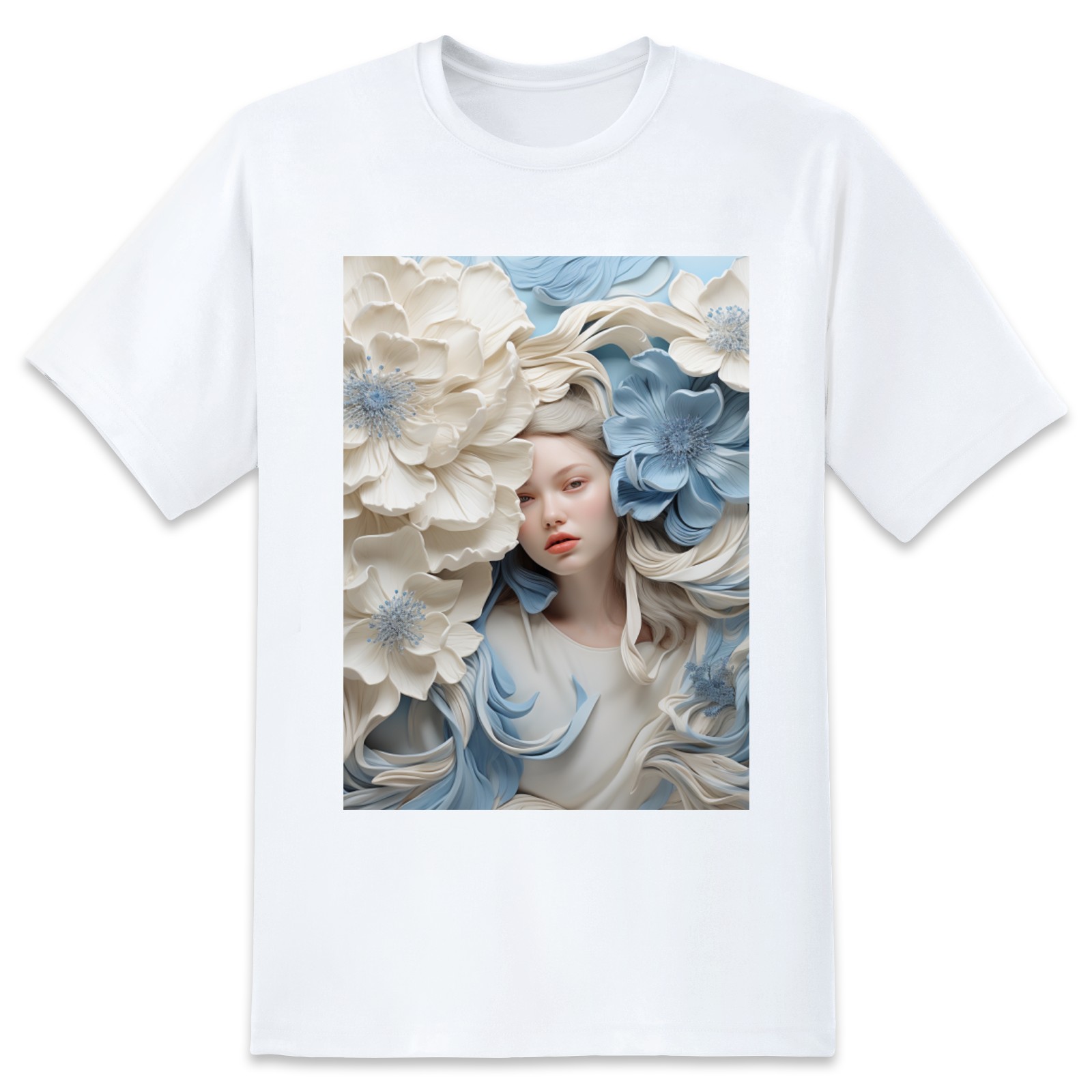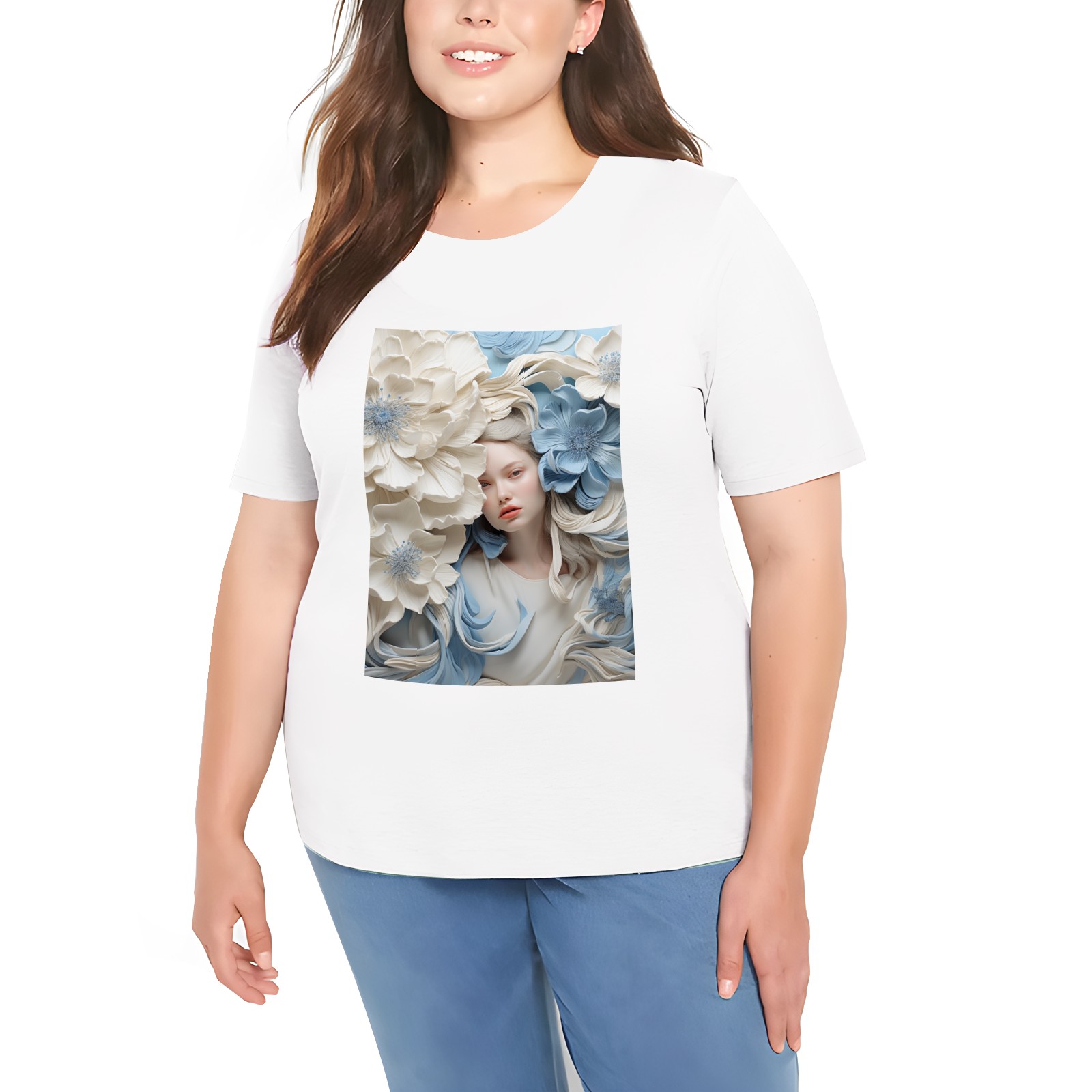 Basic Oversize Tees For WomenBjkj_blue_flower_painting_in_the_style_of_white_and_beige_high_941803d0-59cb-4733-a276-4ecce2d3b0c6 Loose Boyfriend Shirts Casual Blouse round neck