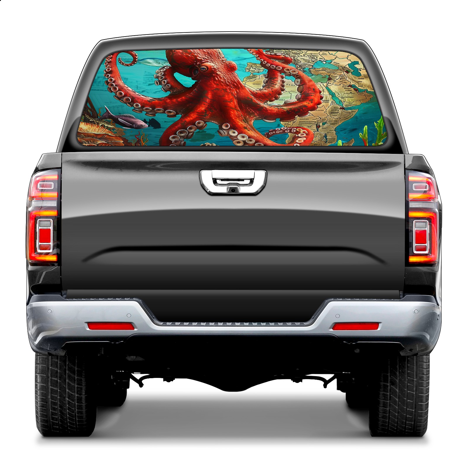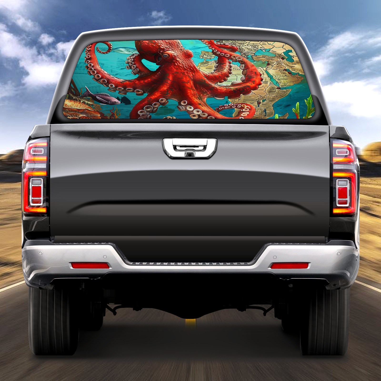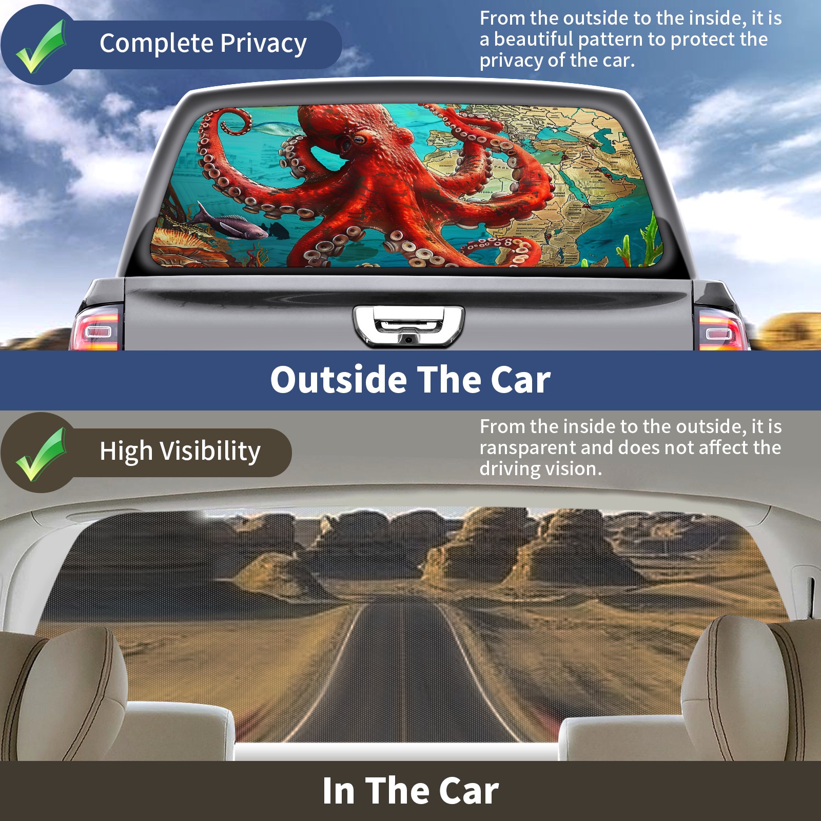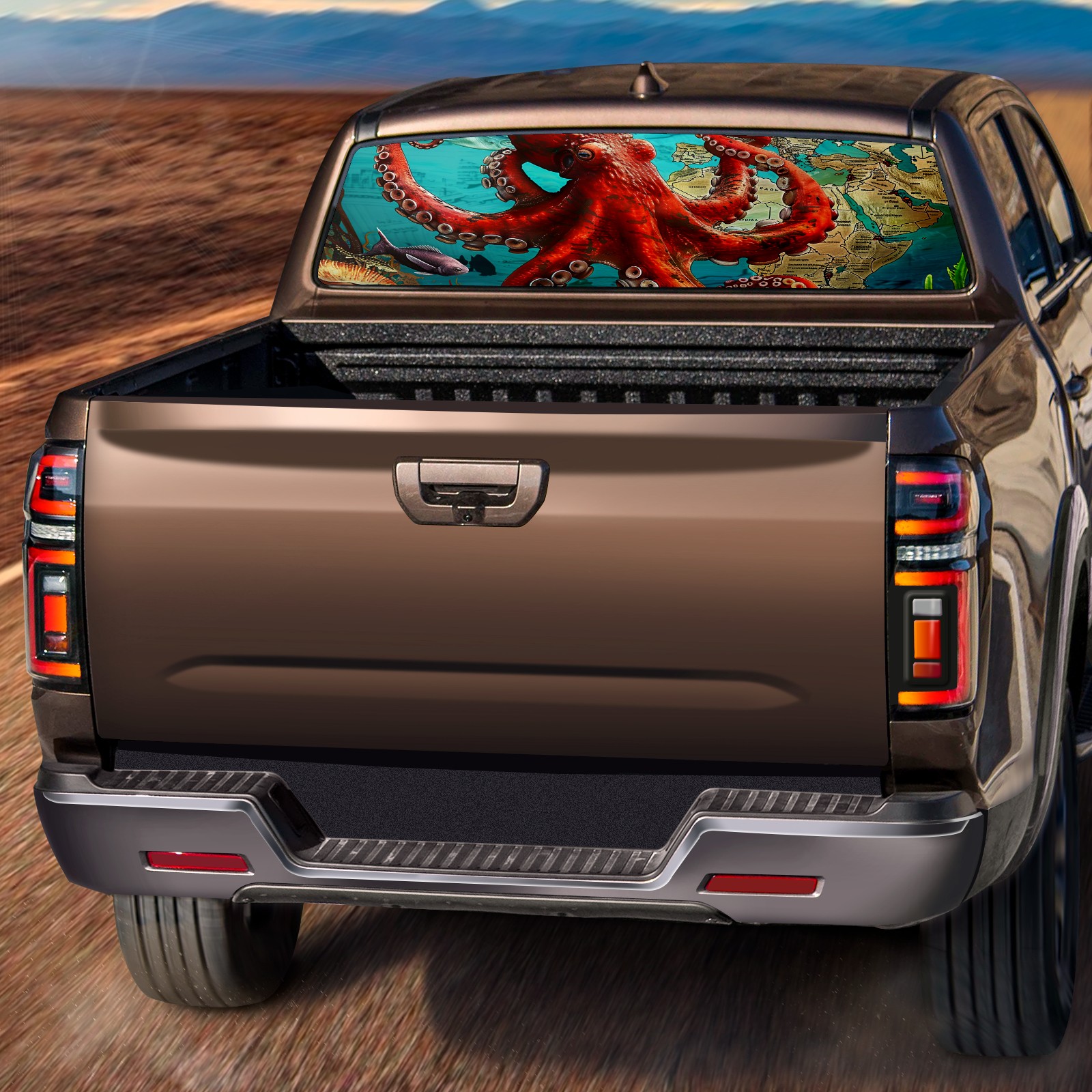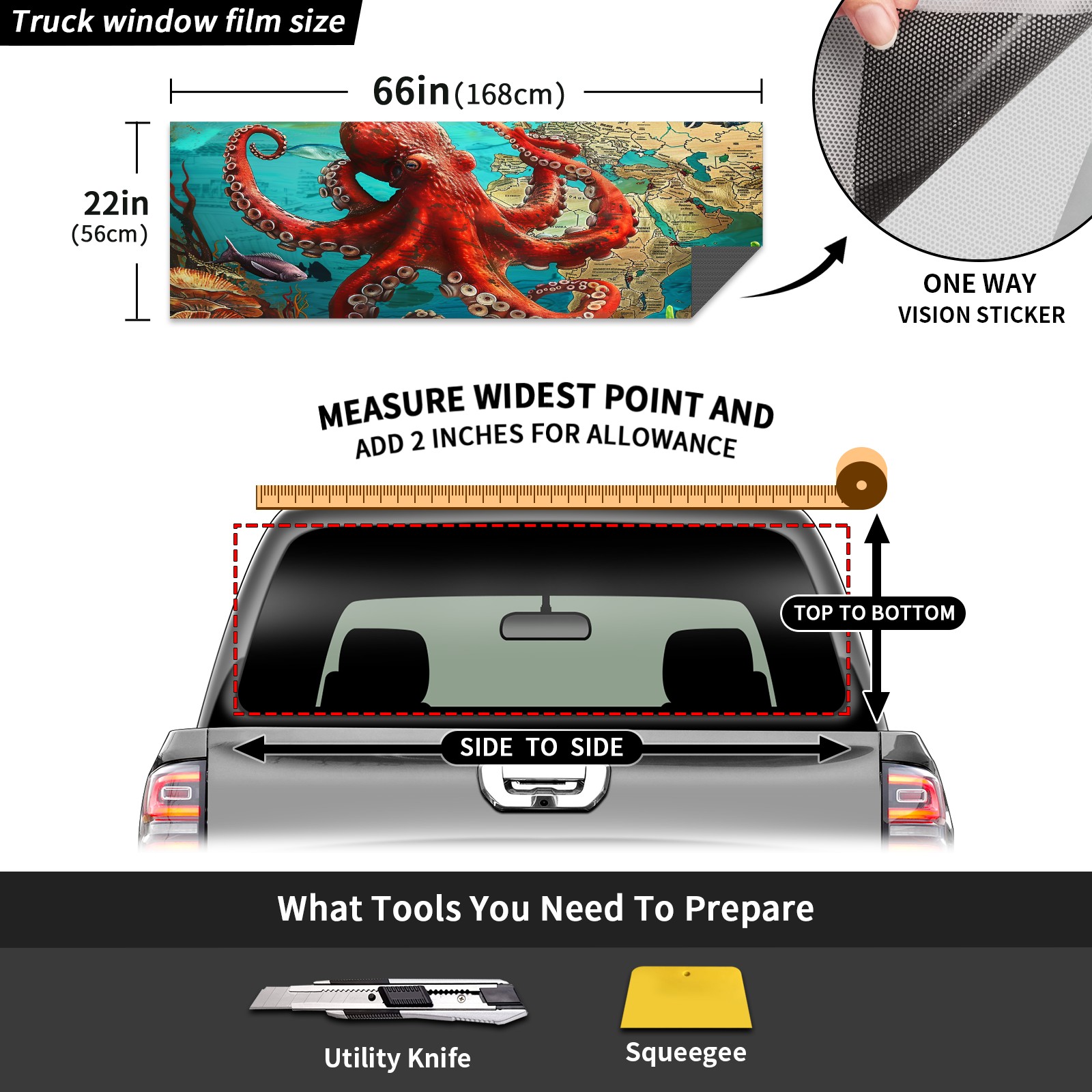 Truck Rear Window Graphic Decals Red Octopus On Retro Map (2) Pickup Car Window Stickers 66" x 22" Truck Back Window Perforated Vinyl Window Film Decal for Trucks SUV