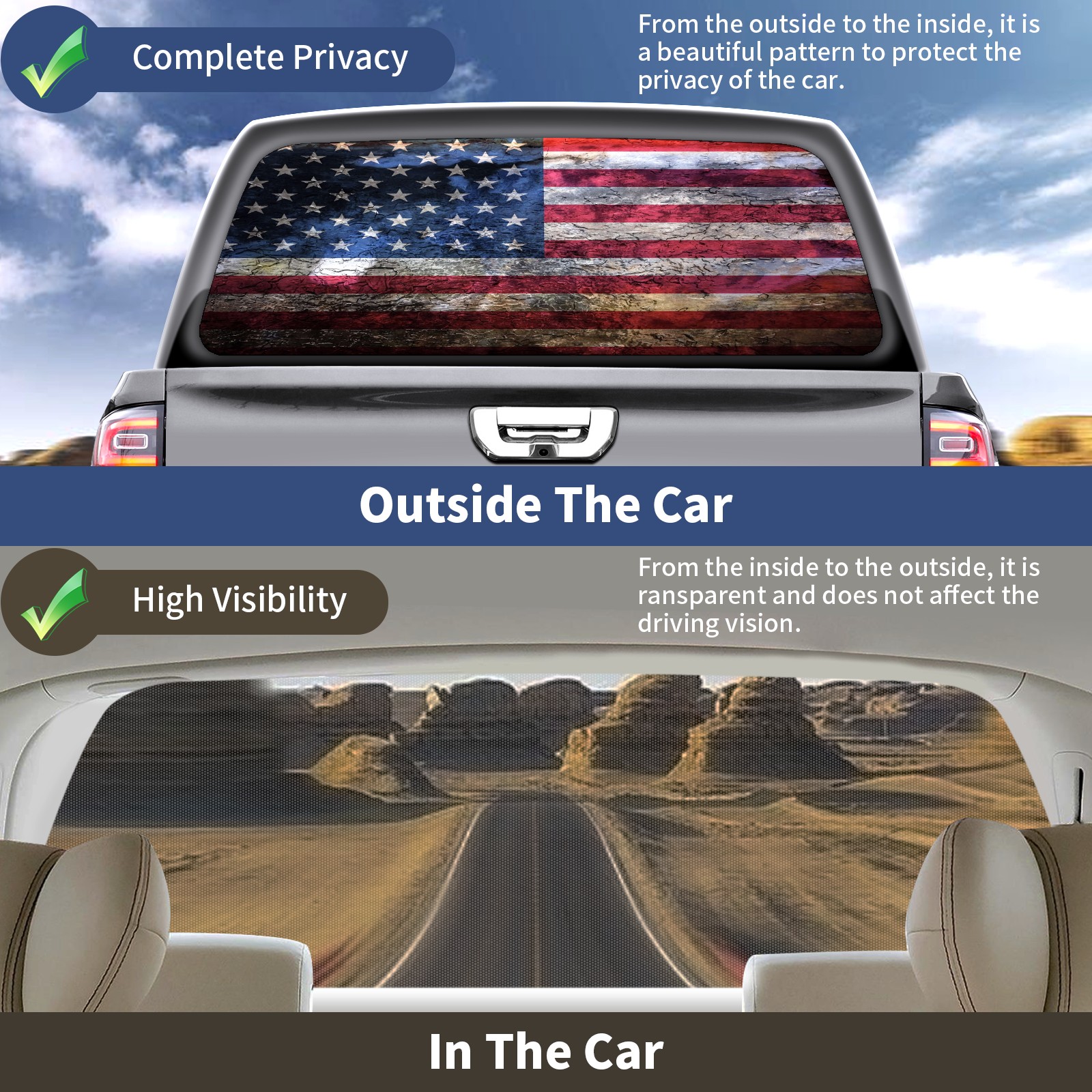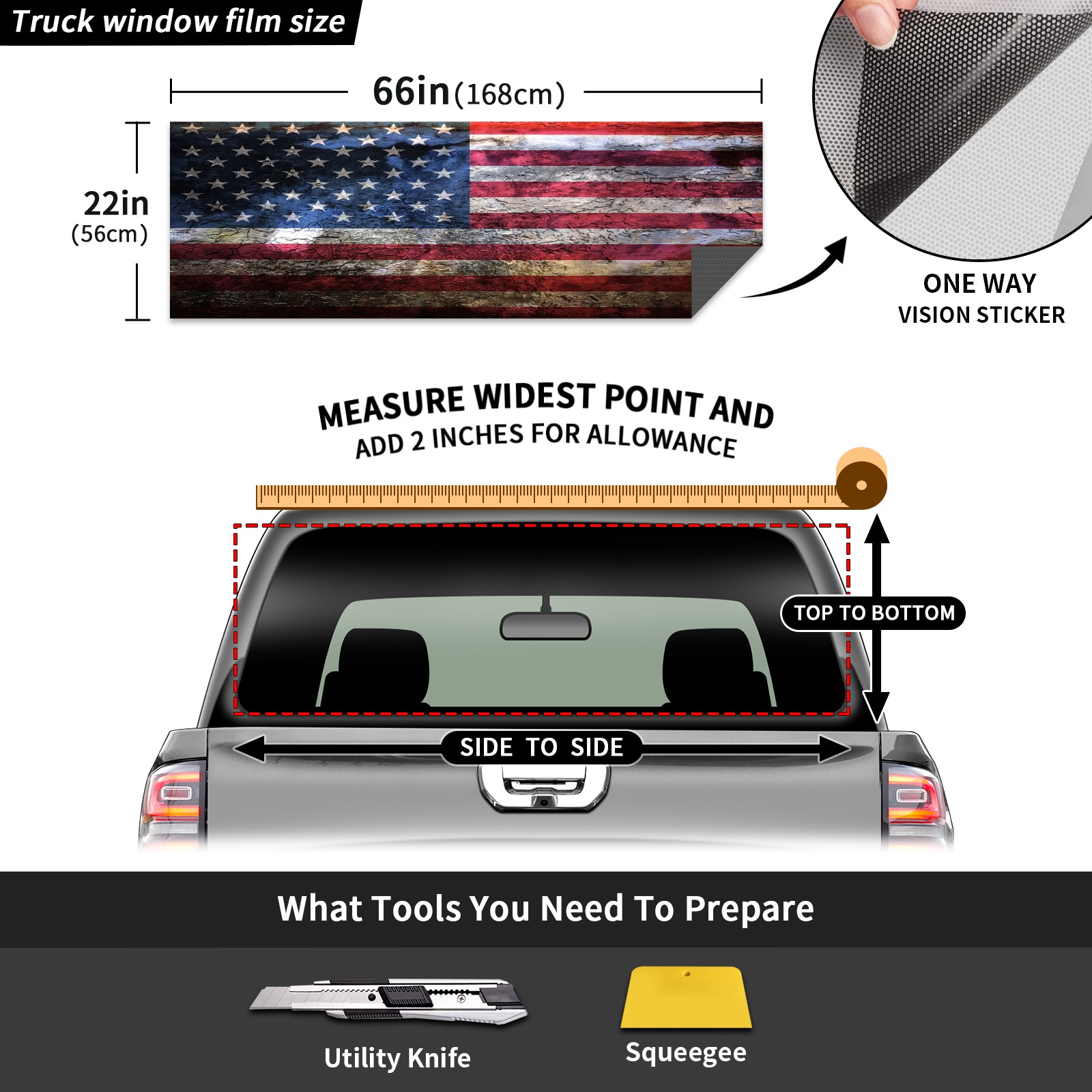 <p><strong>Truck Rear Window Graphics Decals Pickup Trucks Back Window Film Stickers 66" x 22" Perforated Vinyl Wrap Stickers Decorations for Car Rear Window</strong></p><p><strong><br /></strong></p><p><strong>Features :</strong></p><p>- Size of the rear window decals for trucks is 66x22 Inches (168x56cm).</p><p>- High quality perforated vinyl window film, one way vision sticker.</p><p>- Perforated is see through from the inside but not from outside.</p><p>- Clear printing, waterproof and durable.</p><p>- The car back window graphics stickers fits most truck and makes your vehicle more beautiful.&nbsp;</p><p><br /></p><p><strong>【Installation Instructions】</strong></p><p><strong>1. CLEAN SURFACE -</strong> Clean the rear window thoroughly and make sure the surface clean.</p><p><strong>2. STICK THE DECALS -</strong> Tear off the paper on the back and stick the decal on the window.</p><p><strong>3. SCRAPE OFF AIR BUBBLES -</strong> Use a squeegee or other card to scrape off the excess air bubbles.</p><p><strong>4. TRIM THE EXCESS -</strong> Use a knife to cut off the excess stickers of the window, finally complete.</p><p><br /></p><p>1. Please measure the size before purchasing, back window graphics decal for truck can be cut to your desired size.</p><p>2.The graphics stickers for truck back window is a great gift for yourself also can as a birthday / halloween / christmas gift for your friends and family.</p>