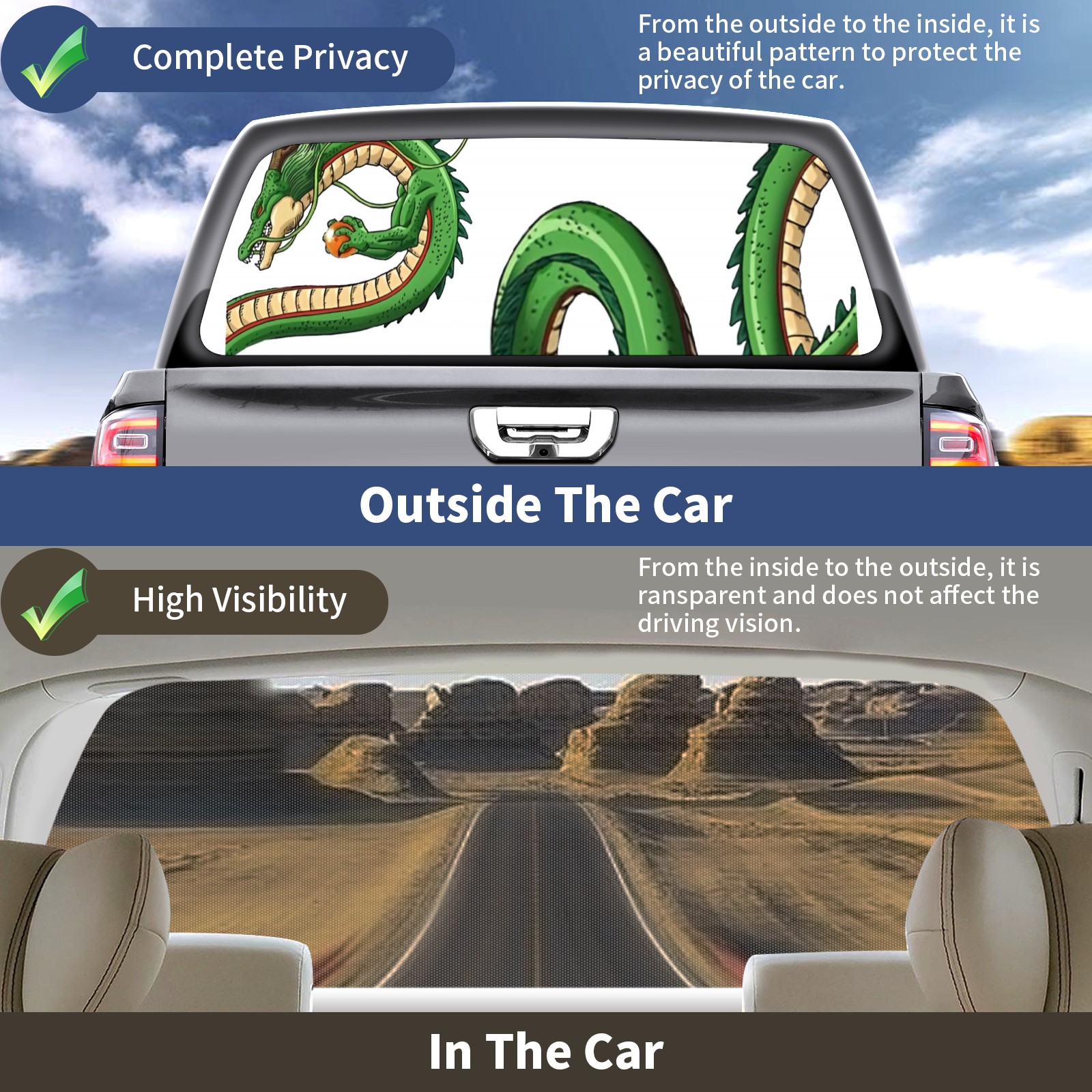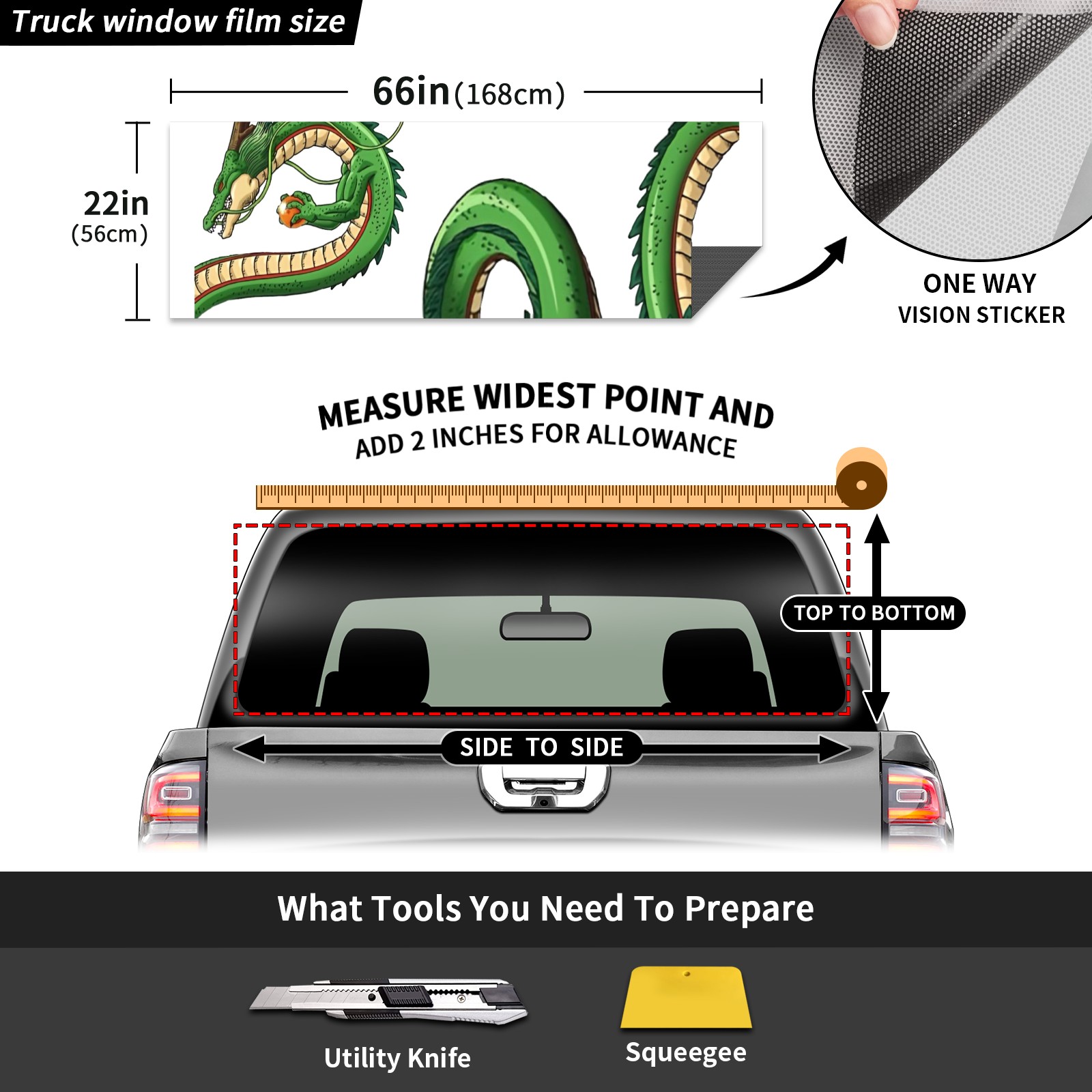 <p><strong>Truck Rear Window Graphics Decals Pickup Trucks Back Window Film Stickers 66" x 22" Perforated Vinyl Wrap Stickers Decorations for Car Rear Window</strong></p><p><strong><br /></strong></p><p><strong>Features :</strong></p><p>- Size of the rear window decals for trucks is 66x22 Inches (168x56cm).</p><p>- High quality perforated vinyl window film, one way vision sticker.</p><p>- Perforated is see through from the inside but not from outside.</p><p>- Clear printing, waterproof and durable.</p><p>- The car back window graphics stickers fits most truck and makes your vehicle more beautiful. </p><p><br /></p><p><strong>【Installation Instructions】</strong></p><p><strong>1. CLEAN SURFACE -</strong> Clean the rear window thoroughly and make sure the surface clean.</p><p><strong>2. STICK THE DECALS -</strong> Tear off the paper on the back and stick the decal on the window.</p><p><strong>3. SCRAPE OFF AIR BUBBLES -</strong> Use a squeegee or other card to scrape off the excess air bubbles.</p><p><strong>4. TRIM THE EXCESS -</strong> Use a knife to cut off the excess stickers of the window, finally complete.</p><p><br /></p><p>1. Please measure the size before purchasing, back window graphics decal for truck can be cut to your desired size.</p><p>2.The graphics stickers for truck back window is a great gift for yourself also can as a birthday / halloween / christmas gift for your friends and family.</p>