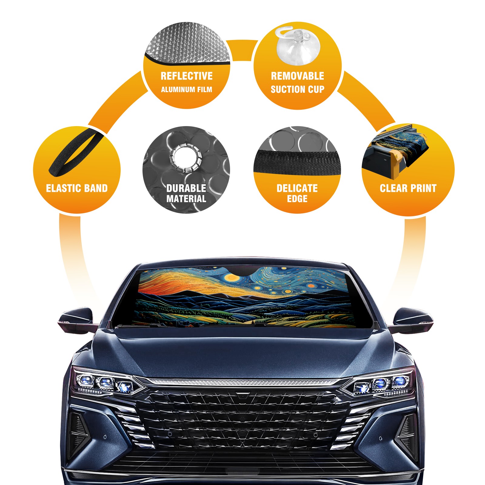 • Diameter /Size 63"L x 33.5"W Made from excellent materials which makes it sturdy and protects the car from the sun. Easy to use and pack. Makes the interior of the car cooler.You can easily stash the sunshade in the storage bag or store long term.It open and closes easy. Also the leather storage bag is durable and easy to put the umbrella back into.This windshield sunshade provides complete coverage and keeps your car interior cool under direct sun. It is easy to open and position under the windshield and around the rear-view mirror. Makes Your Car Easy To Identify, Perfect For Finding Your Car In Crowded Parking Lots And Garages.Great Choice: It Is A Great Gift For Dad, Boyfriend, Brother, Brother And Uncle, Friends, Classmates, Family And So On. Notice: Due To Difference Computer Monitors, The Color Maybe Slightly Different From Picture. As Different Measurement Methods, Measurement Data Will Float Within 2%.I Hope You Understand. If You Have Any Question About The Item Please Do Not Hesitate To Contact Us Immediately And We Will Give You A Satisfactory Reply Within 24 Hours.