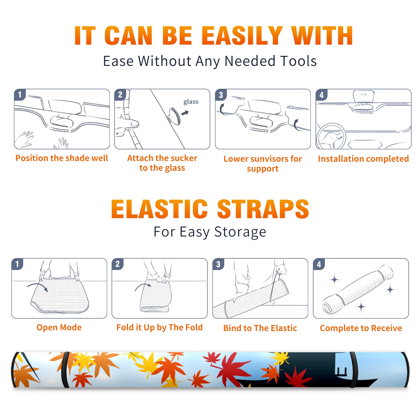 • Diameter /Size 63"L x 33.5"W Made from excellent materials which makes it sturdy and protects the car from the sun. Easy to use and pack. Makes the interior of the car cooler.You can easily stash the sunshade in the storage bag or store long term.It open and closes easy. Also the leather storage bag is durable and easy to put the umbrella back into.This windshield sunshade provides complete coverage and keeps your car interior cool under direct sun. It is easy to open and position under the windshield and around the rear-view mirror. Makes Your Car Easy To Identify, Perfect For Finding Your Car In Crowded Parking Lots And Garages.Great Choice: It Is A Great Gift For Dad, Boyfriend, Brother, Brother And Uncle, Friends, Classmates, Family And So On. Notice: Due To Difference Computer Monitors, The Color Maybe Slightly Different From Picture. As Different Measurement Methods, Measurement Data Will Float Within 2%.I Hope You Understand. If You Have Any Question About The Item Please Do Not Hesitate To Contact Us Immediately And We Will Give You A Satisfactory Reply Within 24 Hours.