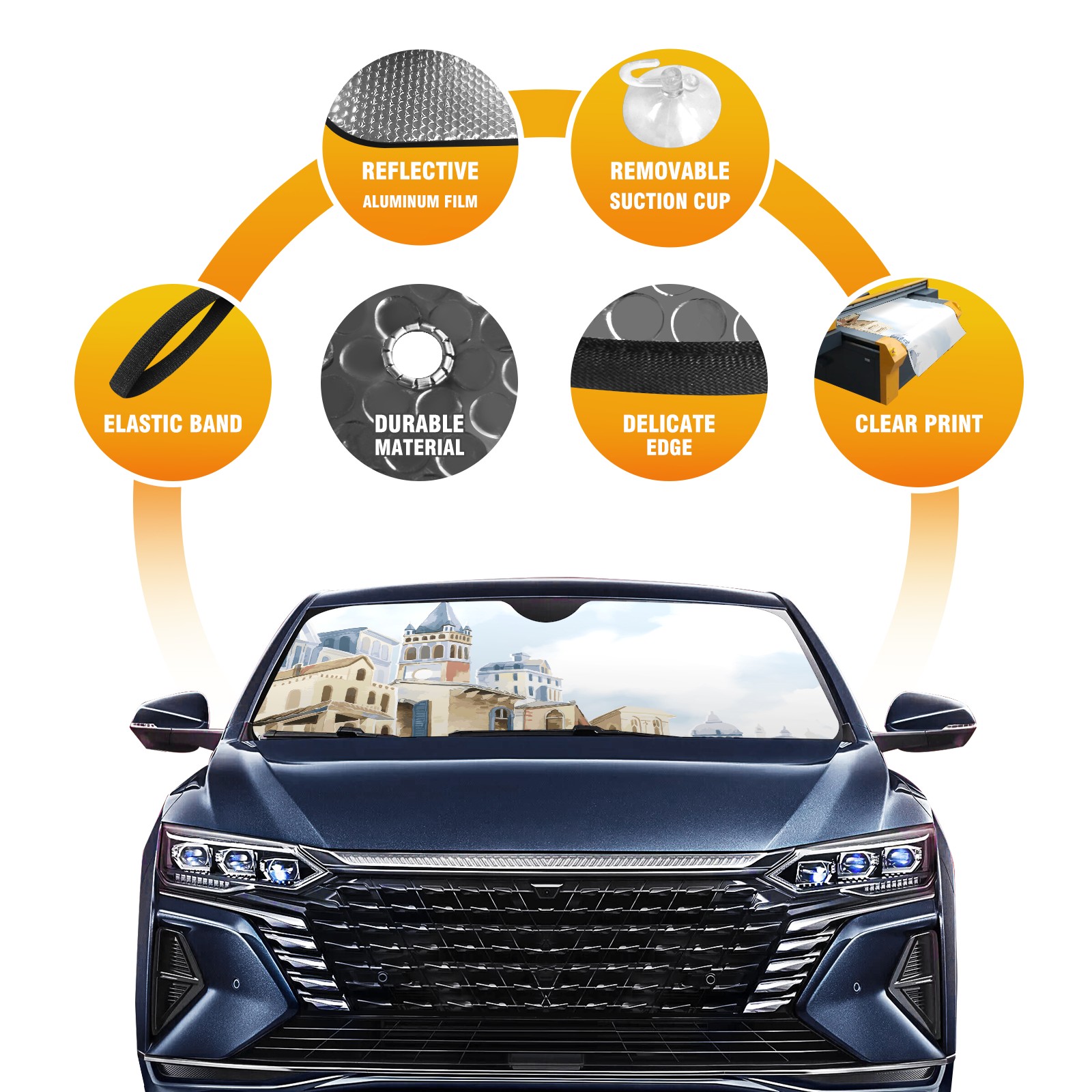 • Diameter /Size 63"L x 33.5"W Made from excellent materials which makes it sturdy and protects the car from the sun. Easy to use and pack. Makes the interior of the car cooler.You can easily stash the sunshade in the storage bag or store long term.It open and closes easy. Also the leather storage bag is durable and easy to put the umbrella back into.This windshield sunshade provides complete coverage and keeps your car interior cool under direct sun. It is easy to open and position under the windshield and around the rear-view mirror. Makes Your Car Easy To Identify, Perfect For Finding Your Car In Crowded Parking Lots And Garages.Great Choice: It Is A Great Gift For Dad, Boyfriend, Brother, Brother And Uncle, Friends, Classmates, Family And So On. Notice: Due To Difference Computer Monitors, The Color Maybe Slightly Different From Picture. As Different Measurement Methods, Measurement Data Will Float Within 2%.I Hope You Understand. If You Have Any Question About The Item Please Do Not Hesitate To Contact Us Immediately And We Will Give You A Satisfactory Reply Within 24 Hours.