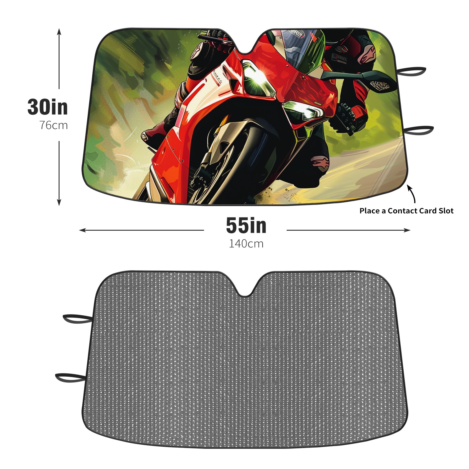 Diameter /Size 63"L x 33.5"W Made from excellent materials which makes it sturdy and protects the car from the sun. Easy to use and pack. Makes the interior of the car cooler.You can easily stash the sunshade in the storage bag or store long term.It open and closes easy. Also the leather storage bag is durable and easy to put the umbrella back into.This windshield sunshade provides complete coverage and keeps your car interior cool under direct sun. It is easy to open and position under the windshield and around the rear-view mirror. Makes Your Car Easy To Identify, Perfect For Finding Your Car In Crowded Parking Lots And Garages.Great Choice: It Is A Great Gift For Dad, Boyfriend, Brother, Brother And Uncle, Friends, Classmates, Family And So On. Notice: Due To Difference Computer Monitors, The Color Maybe Slightly Different From Picture. As Different Measurement Methods, Measurement Data Will Float Within 2%.I Hope You Understand. If You Have Any Question About The Item Please Do Not Hesitate To Contact Us Immediately And We Will Give You A Satisfactory Reply Within 24 Hours.