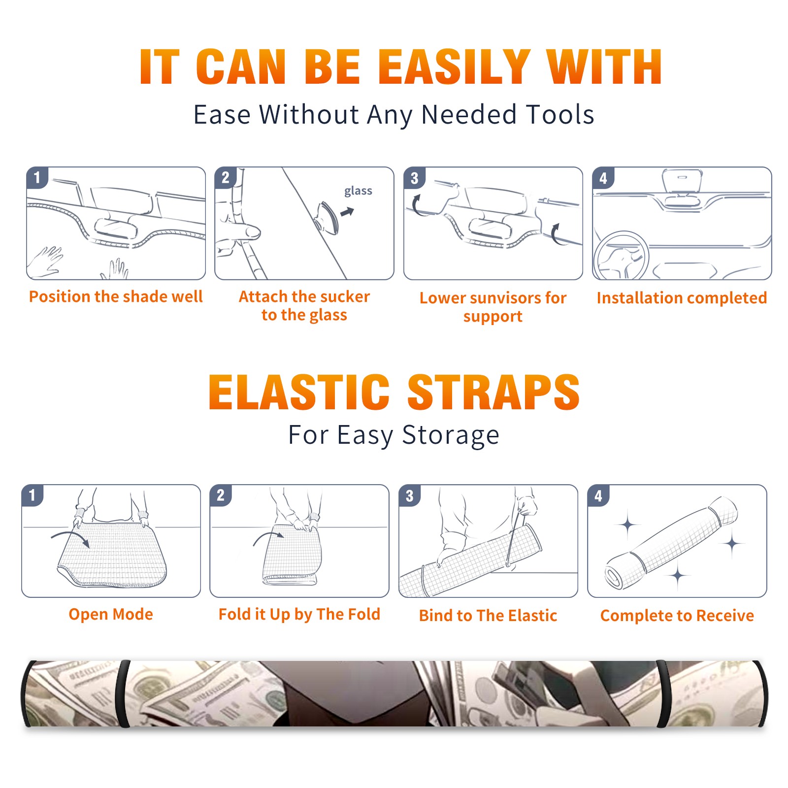 • Diameter /Size 63"L x 33.5"W Made from excellent materials which makes it sturdy and protects the car from the sun. Easy to use and pack. Makes the interior of the car cooler.You can easily stash the sunshade in the storage bag or store long term.It open and closes easy. Also the leather storage bag is durable and easy to put the umbrella back into.This windshield sunshade provides complete coverage and keeps your car interior cool under direct sun. It is easy to open and position under the windshield and around the rear-view mirror. Makes Your Car Easy To Identify, Perfect For Finding Your Car In Crowded Parking Lots And Garages.Great Choice: It Is A Great Gift For Dad, Boyfriend, Brother, Brother And Uncle, Friends, Classmates, Family And So On. Notice: Due To Difference Computer Monitors, The Color Maybe Slightly Different From Picture. As Different Measurement Methods, Measurement Data Will Float Within 2%.I Hope You Understand. If You Have Any Question About The Item Please Do Not Hesitate To Contact Us Immediately And We Will Give You A Satisfactory Reply Within 24 Hours.