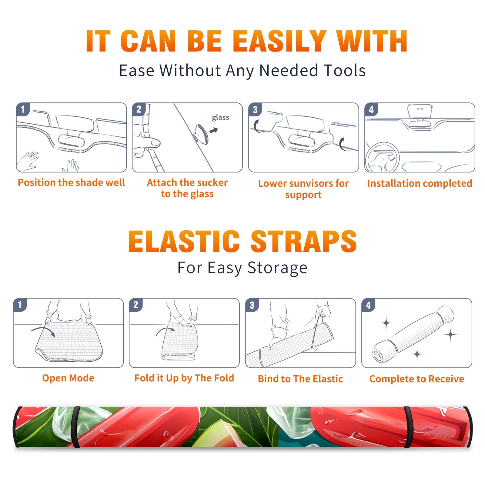 • Diameter /Size 63"L x 33.5"W Made from excellent materials which makes it sturdy and protects the car from the sun. Easy to use and pack. Makes the interior of the car cooler.You can easily stash the sunshade in the storage bag or store long term.It open and closes easy. Also the leather storage bag is durable and easy to put the umbrella back into.This windshield sunshade provides complete coverage and keeps your car interior cool under direct sun. It is easy to open and position under the windshield and around the rear-view mirror. Makes Your Car Easy To Identify, Perfect For Finding Your Car In Crowded Parking Lots And Garages.Great Choice: It Is A Great Gift For Dad, Boyfriend, Brother, Brother And Uncle, Friends, Classmates, Family And So On. Notice: Due To Difference Computer Monitors, The Color Maybe Slightly Different From Picture. As Different Measurement Methods, Measurement Data Will Float Within 2%.I Hope You Understand. If You Have Any Question About The Item Please Do Not Hesitate To Contact Us Immediately And We Will Give You A Satisfactory Reply Within 24 Hours.
