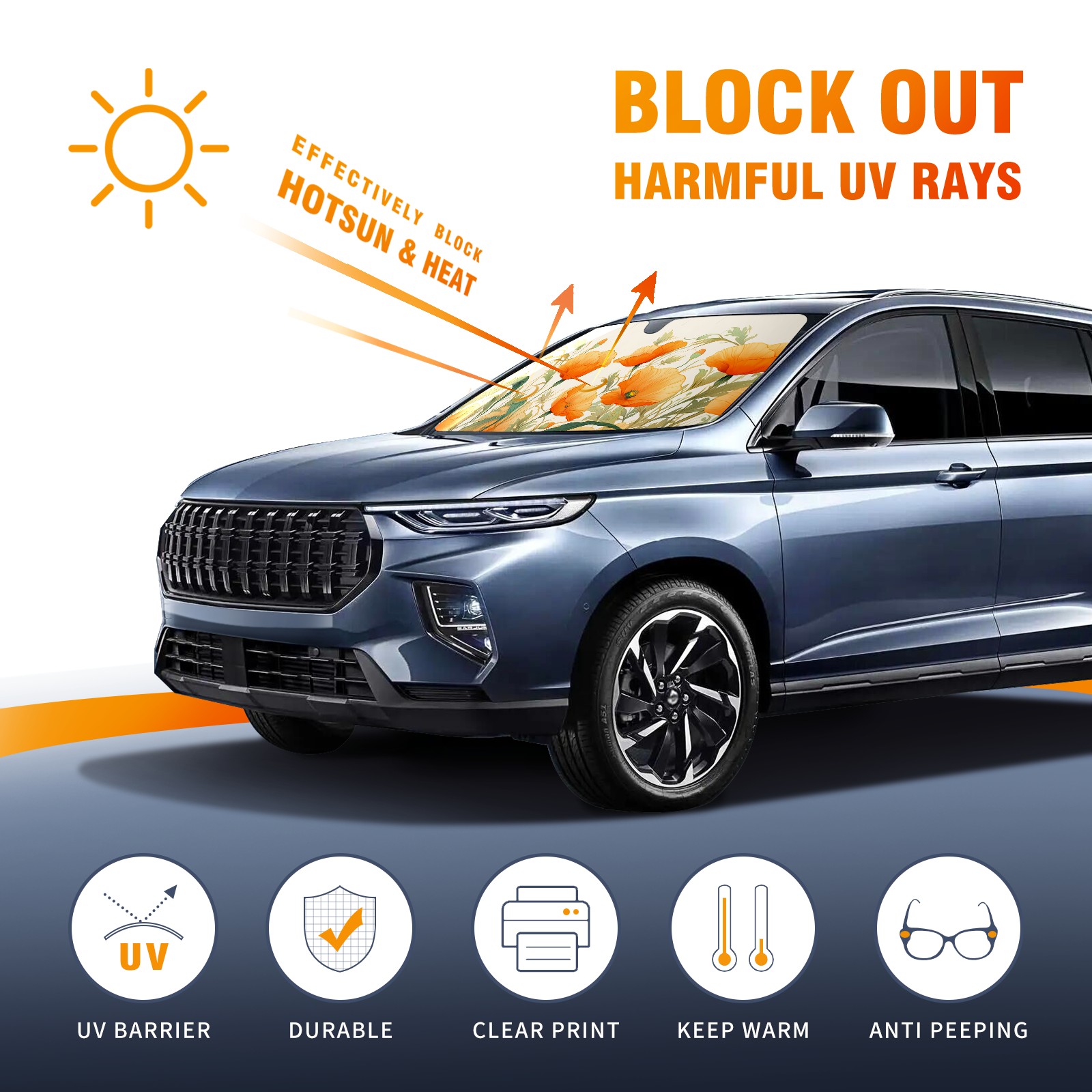 Car Windshield Sun Shade For Front Window Orange Poppies With Watercolor Foldable Vehicle Windshield Car Sun Visor Covers Automotive Window Protector Car Camping Privacy Sun Blocker