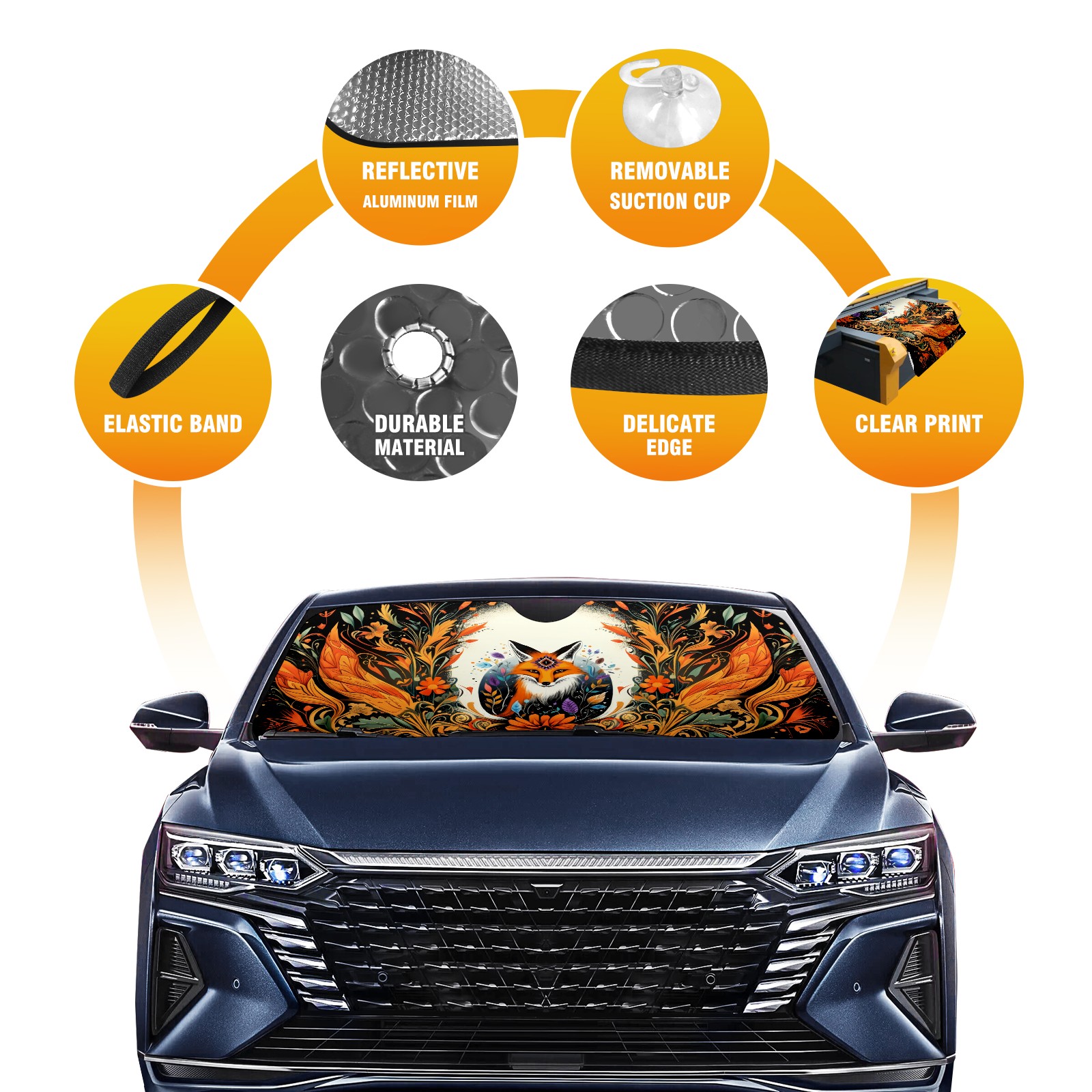 • Diameter /Size 63"L x 33.5"W Made from excellent materials which makes it sturdy and protects the car from the sun. Easy to use and pack. Makes the interior of the car cooler.You can easily stash the sunshade in the storage bag or store long term.It open and closes easy. Also the leather storage bag is durable and easy to put the umbrella back into.This windshield sunshade provides complete coverage and keeps your car interior cool under direct sun. It is easy to open and position under the windshield and around the rear-view mirror. Makes Your Car Easy To Identify, Perfect For Finding Your Car In Crowded Parking Lots And Garages.Great Choice: It Is A Great Gift For Dad, Boyfriend, Brother, Brother And Uncle, Friends, Classmates, Family And So On. Notice: Due To Difference Computer Monitors, The Color Maybe Slightly Different From Picture. As Different Measurement Methods, Measurement Data Will Float Within 2%.I Hope You Understand. If You Have Any Question About The Item Please Do Not Hesitate To Contact Us Immediately And We Will Give You A Satisfactory Reply Within 24 Hours.