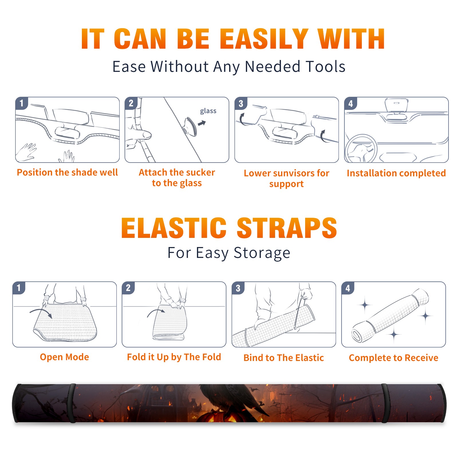 • Diameter /Size 63"L x 33.5"W Made from excellent materials which makes it sturdy and protects the car from the sun. Easy to use and pack. Makes the interior of the car cooler.You can easily stash the sunshade in the storage bag or store long term.It open and closes easy. Also the leather storage bag is durable and easy to put the umbrella back into.This windshield sunshade provides complete coverage and keeps your car interior cool under direct sun. It is easy to open and position under the windshield and around the rear-view mirror. Makes Your Car Easy To Identify, Perfect For Finding Your Car In Crowded Parking Lots And Garages.Great Choice: It Is A Great Gift For Dad, Boyfriend, Brother, Brother And Uncle, Friends, Classmates, Family And So On. Notice: Due To Difference Computer Monitors, The Color Maybe Slightly Different From Picture. As Different Measurement Methods, Measurement Data Will Float Within 2%.I Hope You Understand. If You Have Any Question About The Item Please Do Not Hesitate To Contact Us Immediately And We Will Give You A Satisfactory Reply Within 24 Hours.