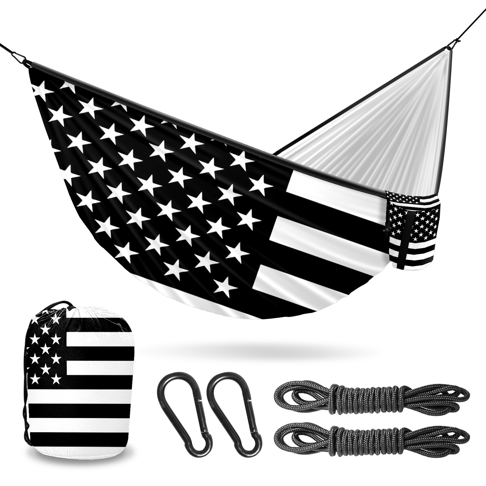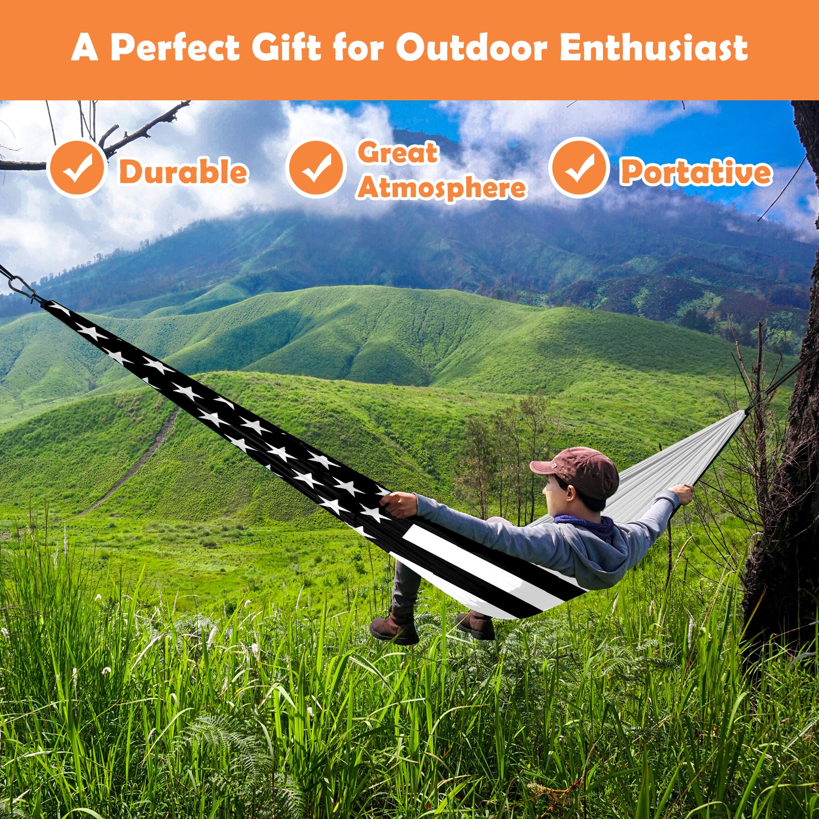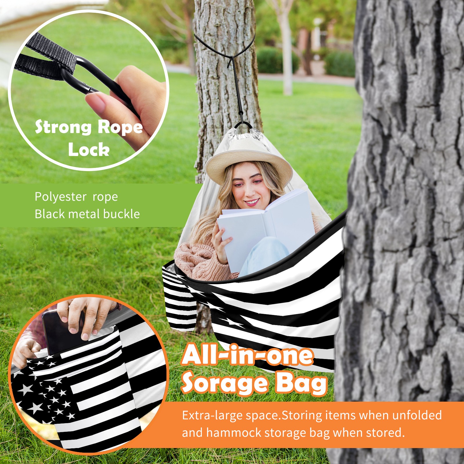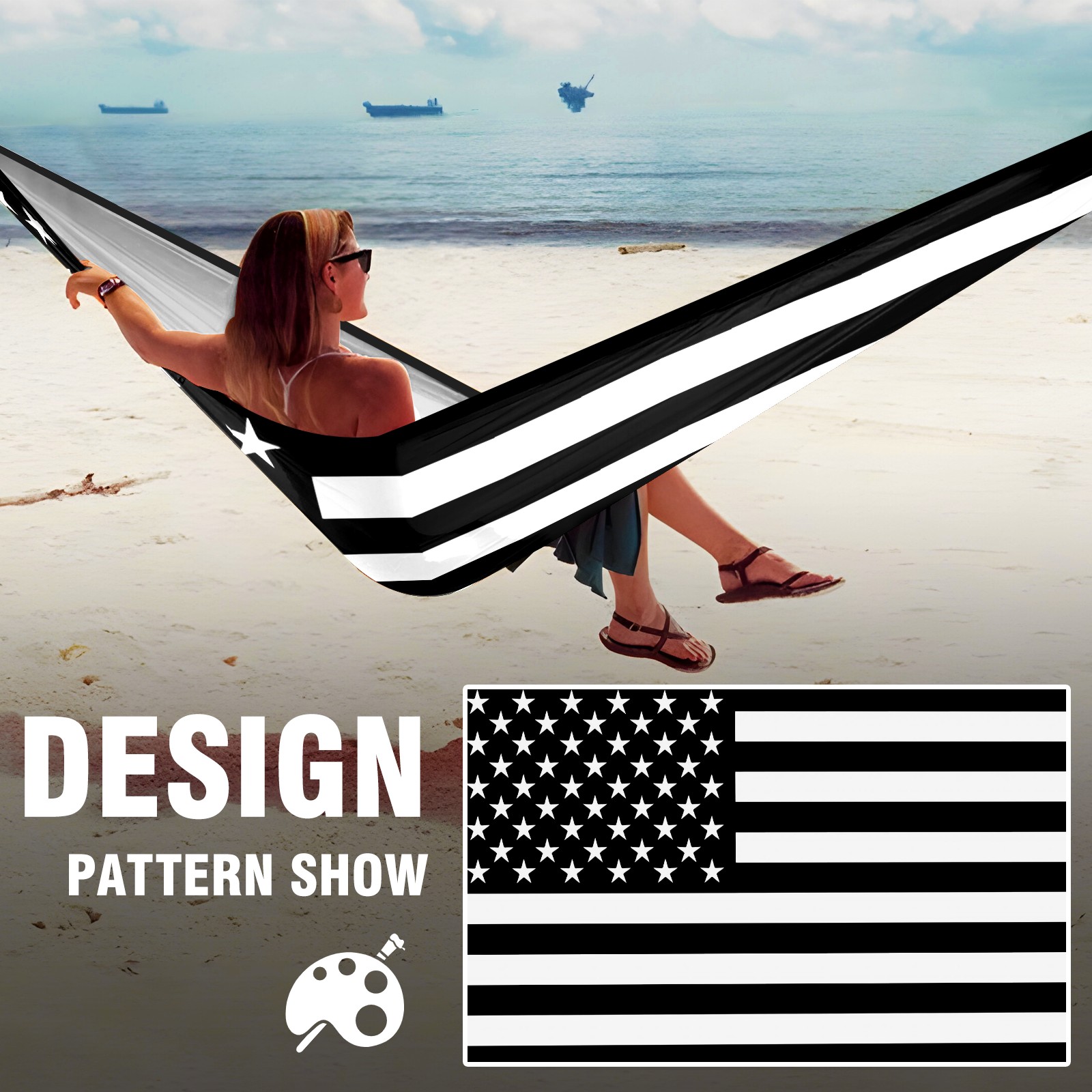 Outdoor Camping Hammock Black White American Flag Double Single Hammocks with 2 Tree Straps, Lightweight Portable Heavy Duty Nylon Hammocks for Backpacking, Travel, Beach, Backyard, Patio, Hiking
