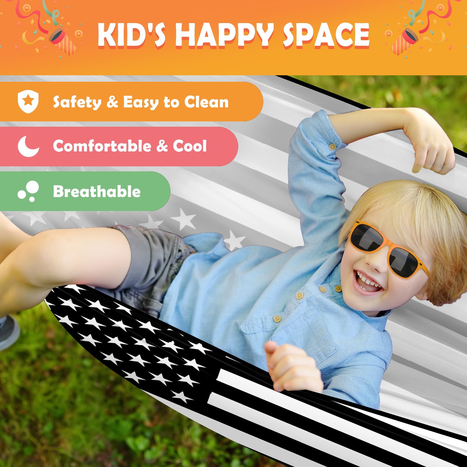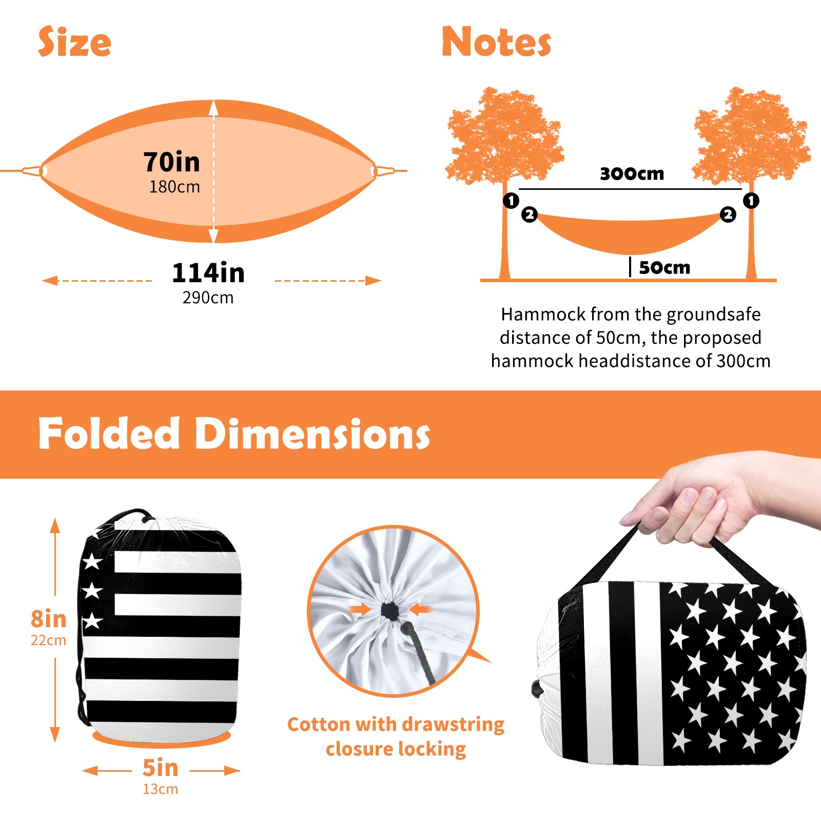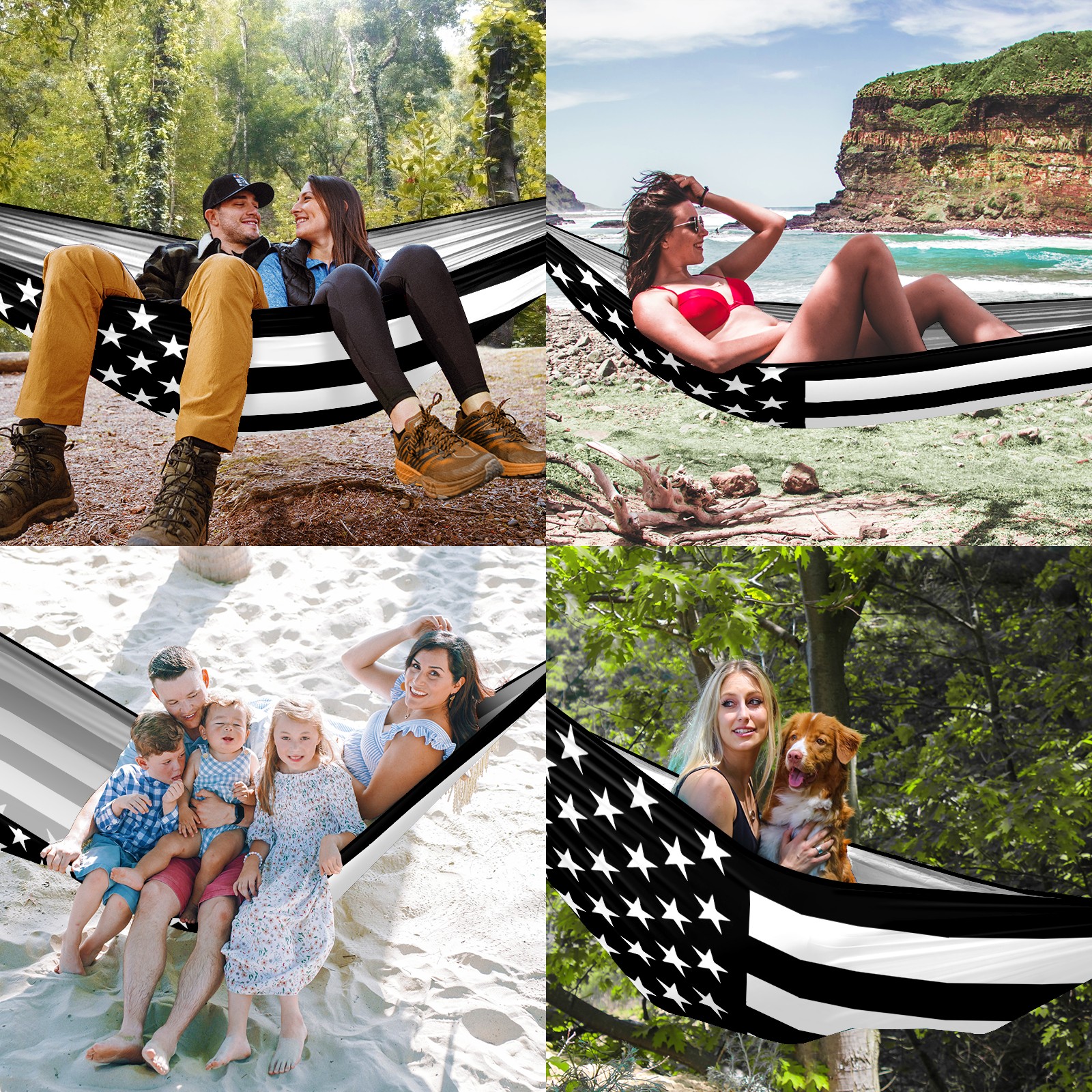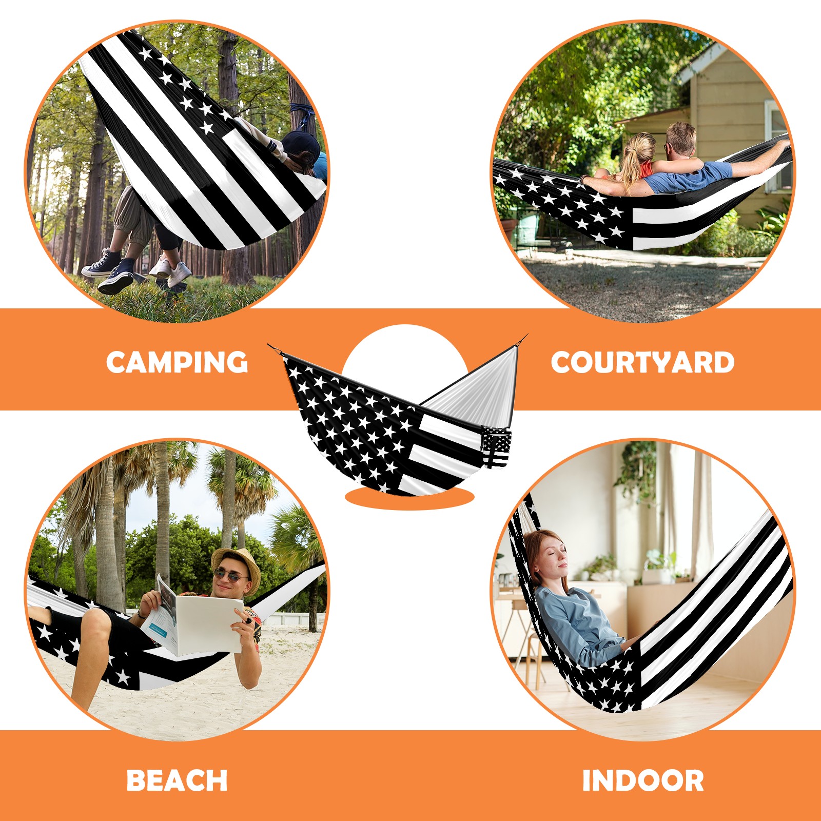Outdoor Camping Hammock Black White American Flag Double Single Hammocks with 2 Tree Straps, Lightweight Portable Heavy Duty Nylon Hammocks for Backpacking, Travel, Beach, Backyard, Patio, Hiking