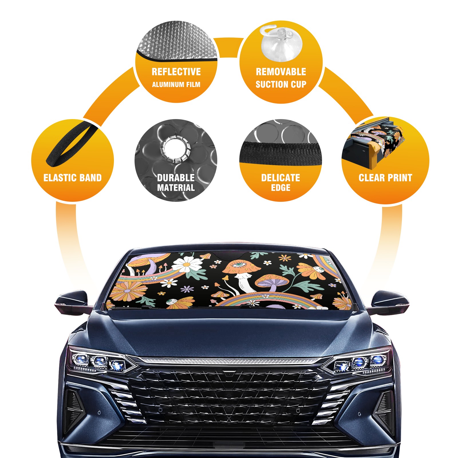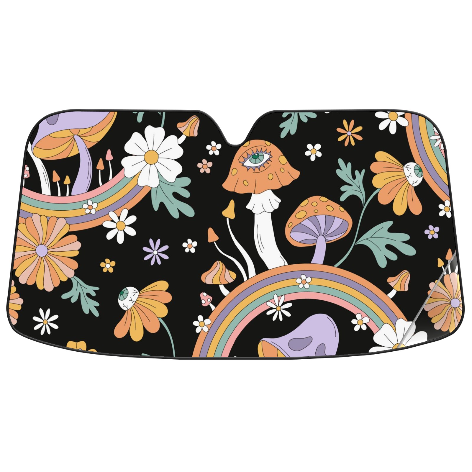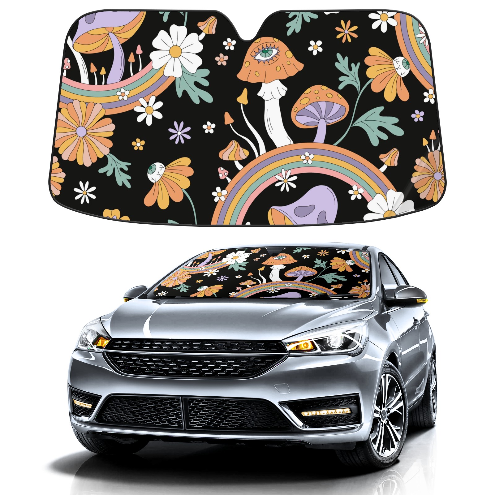 Car Windshield Sun Shade For Front Window Boho Mushroom Rainbow Floral Foldable Vehicle Windshield Car Sun Visor Covers Automotive Window Protector Car Camping Privacy Sun Blocker