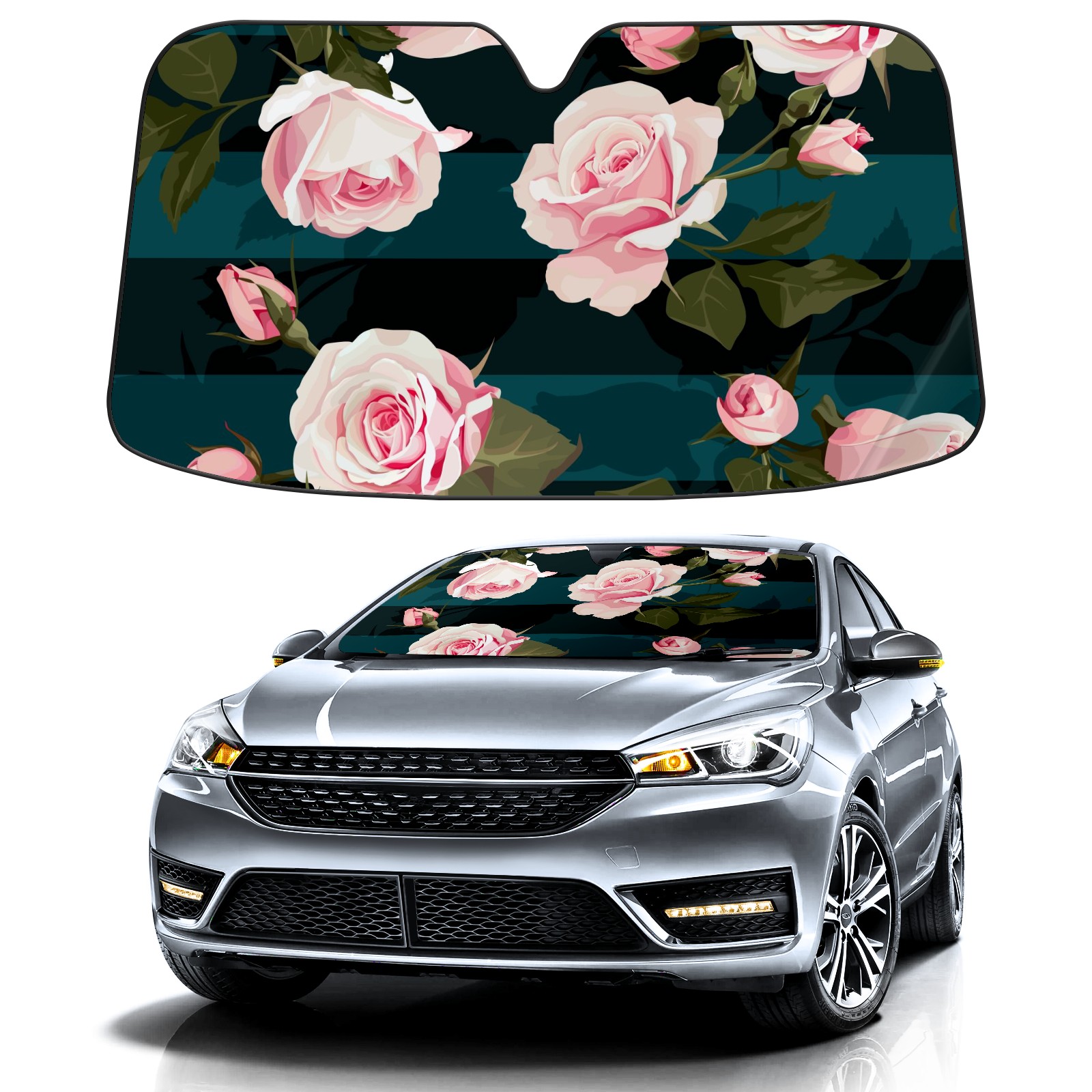 Car Windshield Sun Shade For Front Window Pink Rose Flower On Stripe Background Foldable Vehicle Windshield Car Sun Visor Covers Automotive Window Protector Car Camping Privacy Sun Blocker