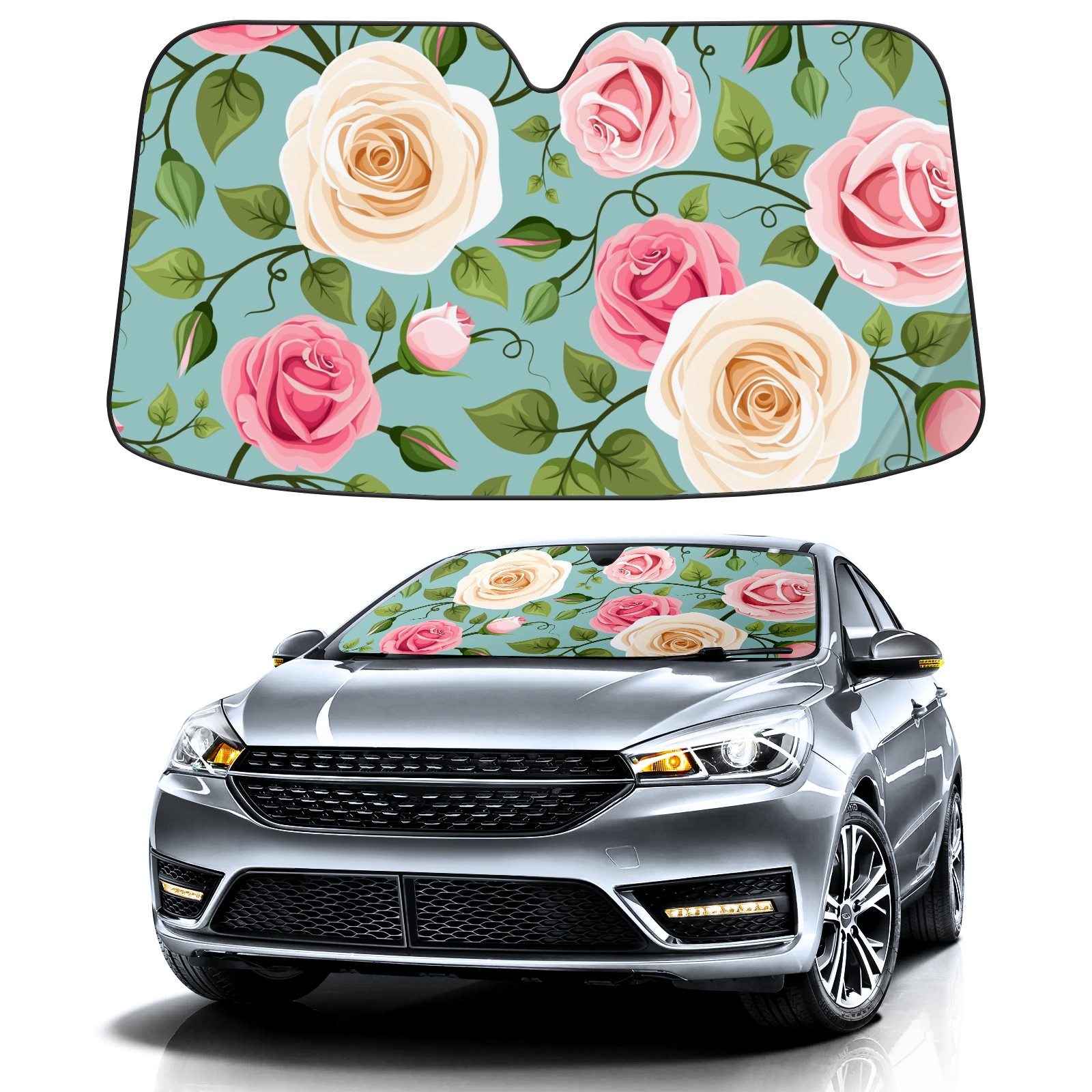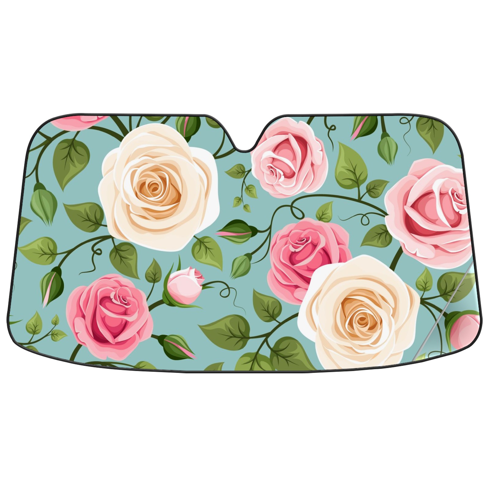 Car Windshield Sun Shade For Front Window Pink And White Rose Flowers On Celadon Background Foldable Vehicle Windshield Car Sun Visor Covers Automotive Window Protector Car Camping Privacy Sun Blocker