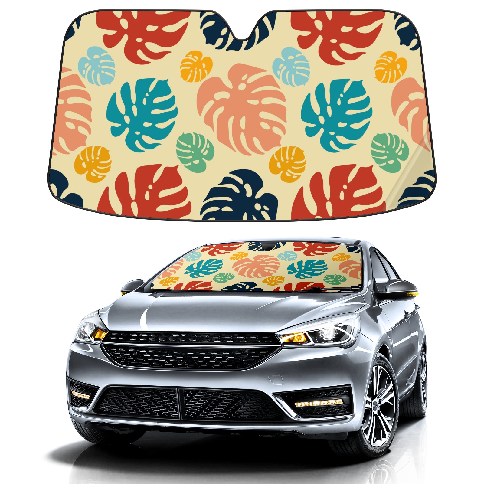 Car Windshield Sun Shade For Front Window Colorful Monstera Leaves Foldable Vehicle Windshield Car Sun Visor Covers Automotive Window Protector Car Camping Privacy Sun Blocker