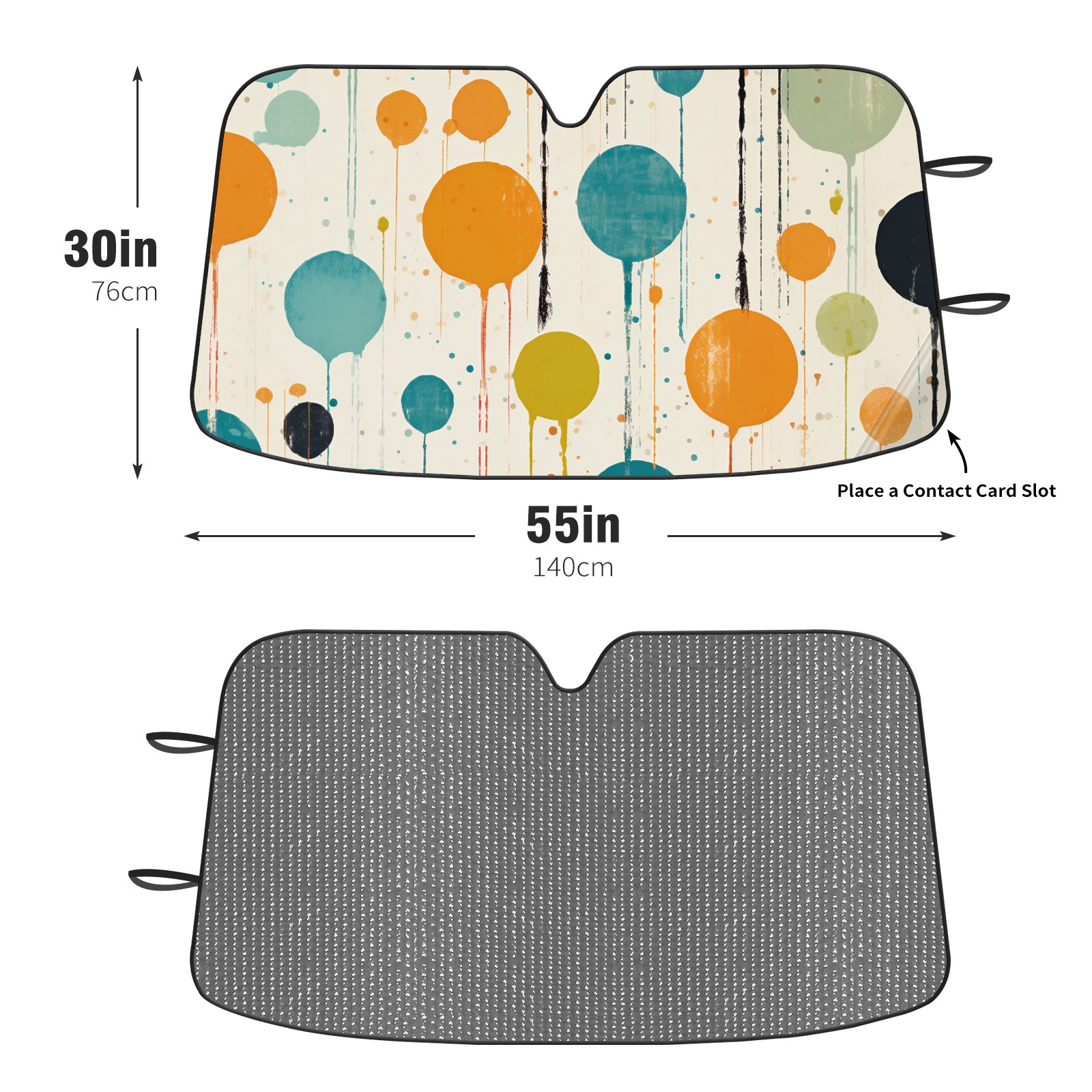 Diameter /Size 63"L x 33.5"W Made from excellent materials which makes it sturdy and protects the car from the sun. Easy to use and pack. Makes the interior of the car cooler.You can easily stash the sunshade in the storage bag or store long term.It open and closes easy. Also the leather storage bag is durable and easy to put the umbrella back into.This windshield sunshade provides complete coverage and keeps your car interior cool under direct sun. It is easy to open and position under the windshield and around the rear-view mirror. Makes Your Car Easy To Identify, Perfect For Finding Your Car In Crowded Parking Lots And Garages.Great Choice: It Is A Great Gift For Dad, Boyfriend, Brother, Brother And Uncle, Friends, Classmates, Family And So On. Notice: Due To Difference Computer Monitors, The Color Maybe Slightly Different From Picture. As Different Measurement Methods, Measurement Data Will Float Within 2%.I Hope You Understand. If You Have Any Question About The Item Please Do Not Hesitate To Contact Us Immediately And We Will Give You A Satisfactory Reply Within 24 Hours.