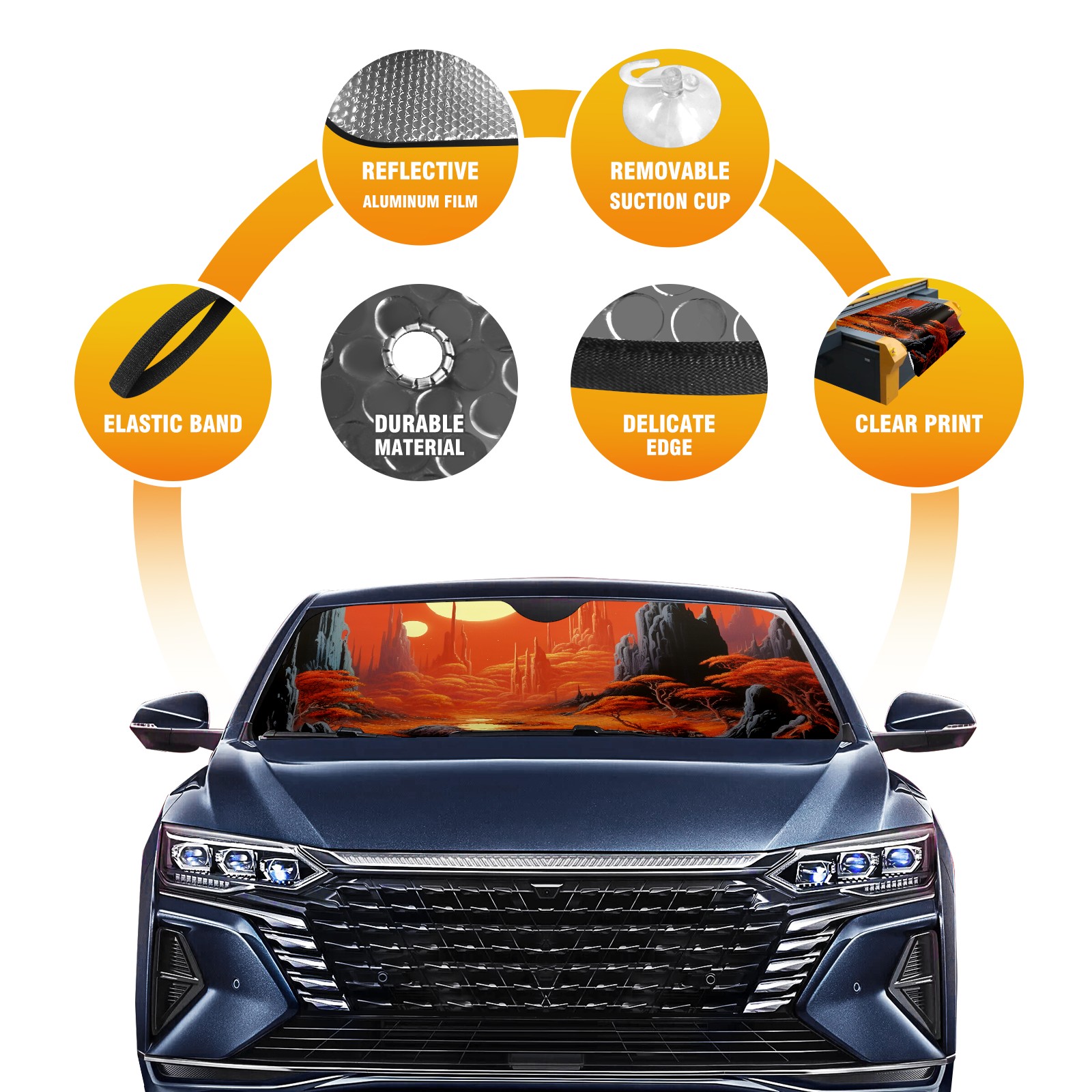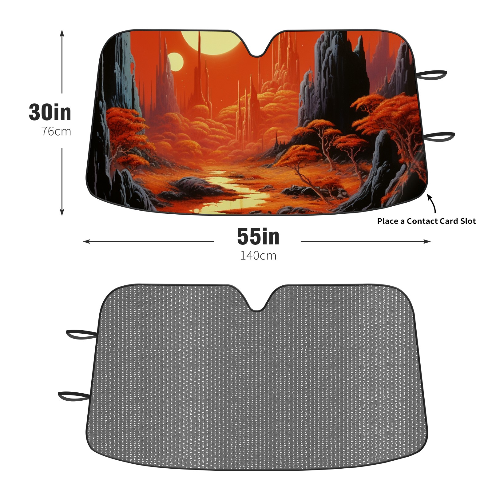 Diameter /Size 63"L x 33.5"W Made from excellent materials which makes it sturdy and protects the car from the sun. Easy to use and pack. Makes the interior of the car cooler.You can easily stash the sunshade in the storage bag or store long term.It open and closes easy. Also the leather storage bag is durable and easy to put the umbrella back into.This windshield sunshade provides complete coverage and keeps your car interior cool under direct sun. It is easy to open and position under the windshield and around the rear-view mirror. Makes Your Car Easy To Identify, Perfect For Finding Your Car In Crowded Parking Lots And Garages.Great Choice: It Is A Great Gift For Dad, Boyfriend, Brother, Brother And Uncle, Friends, Classmates, Family And So On. Notice: Due To Difference Computer Monitors, The Color Maybe Slightly Different From Picture. As Different Measurement Methods, Measurement Data Will Float Within 2%.I Hope You Understand. If You Have Any Question About The Item Please Do Not Hesitate To Contact Us Immediately And We Will Give You A Satisfactory Reply Within 24 Hours.