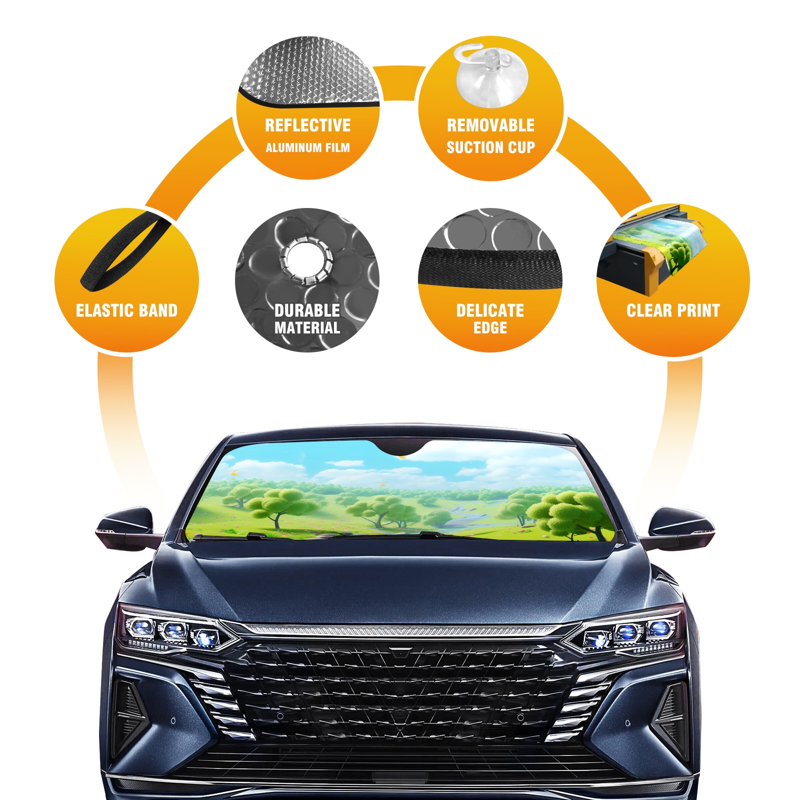 • Diameter /Size 63"L x 33.5"W Made from excellent materials which makes it sturdy and protects the car from the sun. Easy to use and pack. Makes the interior of the car cooler.You can easily stash the sunshade in the storage bag or store long term.It open and closes easy. Also the leather storage bag is durable and easy to put the umbrella back into.This windshield sunshade provides complete coverage and keeps your car interior cool under direct sun. It is easy to open and position under the windshield and around the rear-view mirror. Makes Your Car Easy To Identify, Perfect For Finding Your Car In Crowded Parking Lots And Garages.Great Choice: It Is A Great Gift For Dad, Boyfriend, Brother, Brother And Uncle, Friends, Classmates, Family And So On. Notice: Due To Difference Computer Monitors, The Color Maybe Slightly Different From Picture. As Different Measurement Methods, Measurement Data Will Float Within 2%.I Hope You Understand. If You Have Any Question About The Item Please Do Not Hesitate To Contact Us Immediately And We Will Give You A Satisfactory Reply Within 24 Hours.