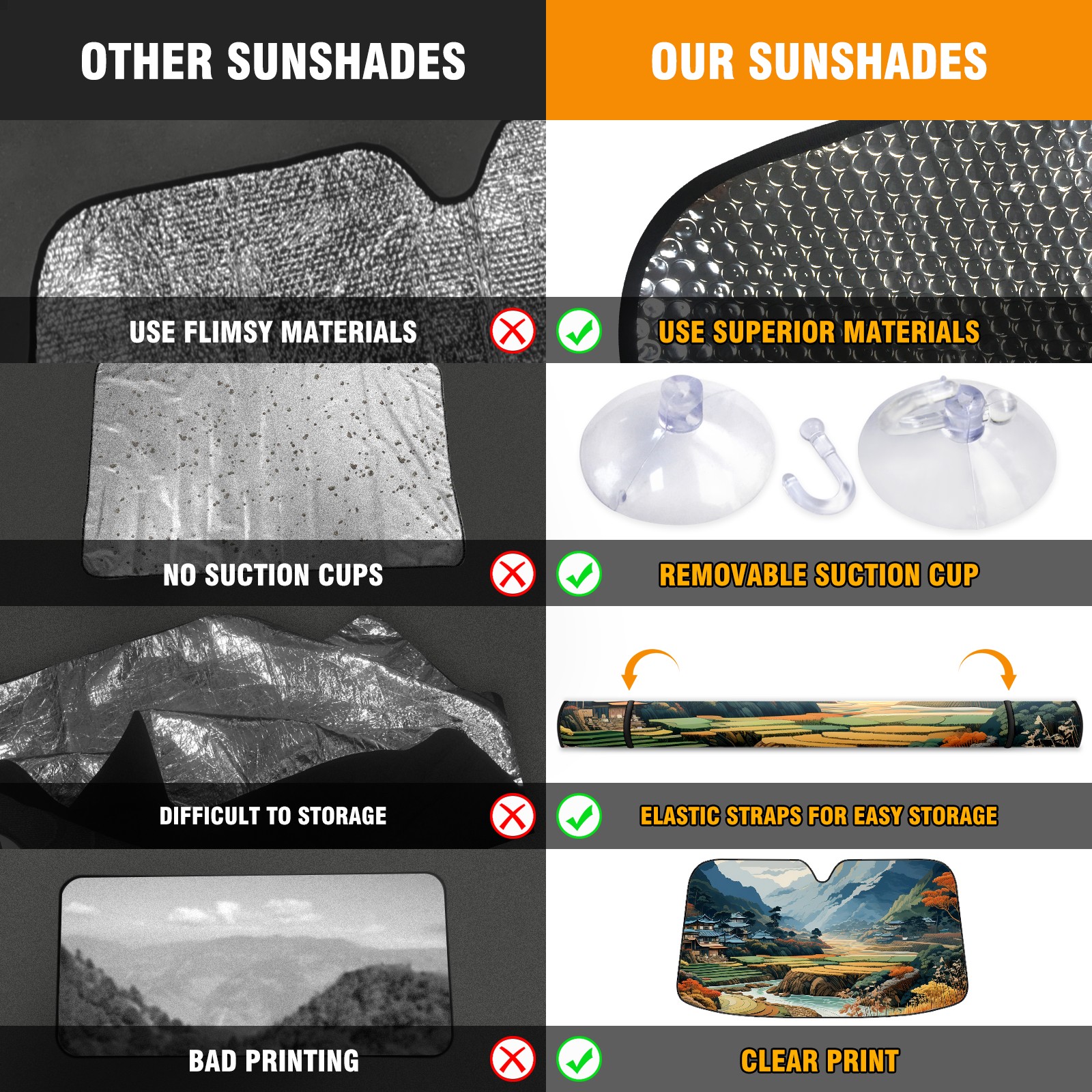 • Diameter /Size 63"L x 33.5"W Made from excellent materials which makes it sturdy and protects the car from the sun. Easy to use and pack. Makes the interior of the car cooler.You can easily stash the sunshade in the storage bag or store long term.It open and closes easy. Also the leather storage bag is durable and easy to put the umbrella back into.This windshield sunshade provides complete coverage and keeps your car interior cool under direct sun. It is easy to open and position under the windshield and around the rear-view mirror. Makes Your Car Easy To Identify, Perfect For Finding Your Car In Crowded Parking Lots And Garages.Great Choice: It Is A Great Gift For Dad, Boyfriend, Brother, Brother And Uncle, Friends, Classmates, Family And So On. Notice: Due To Difference Computer Monitors, The Color Maybe Slightly Different From Picture. As Different Measurement Methods, Measurement Data Will Float Within 2%.I Hope You Understand. If You Have Any Question About The Item Please Do Not Hesitate To Contact Us Immediately And We Will Give You A Satisfactory Reply Within 24 Hours.