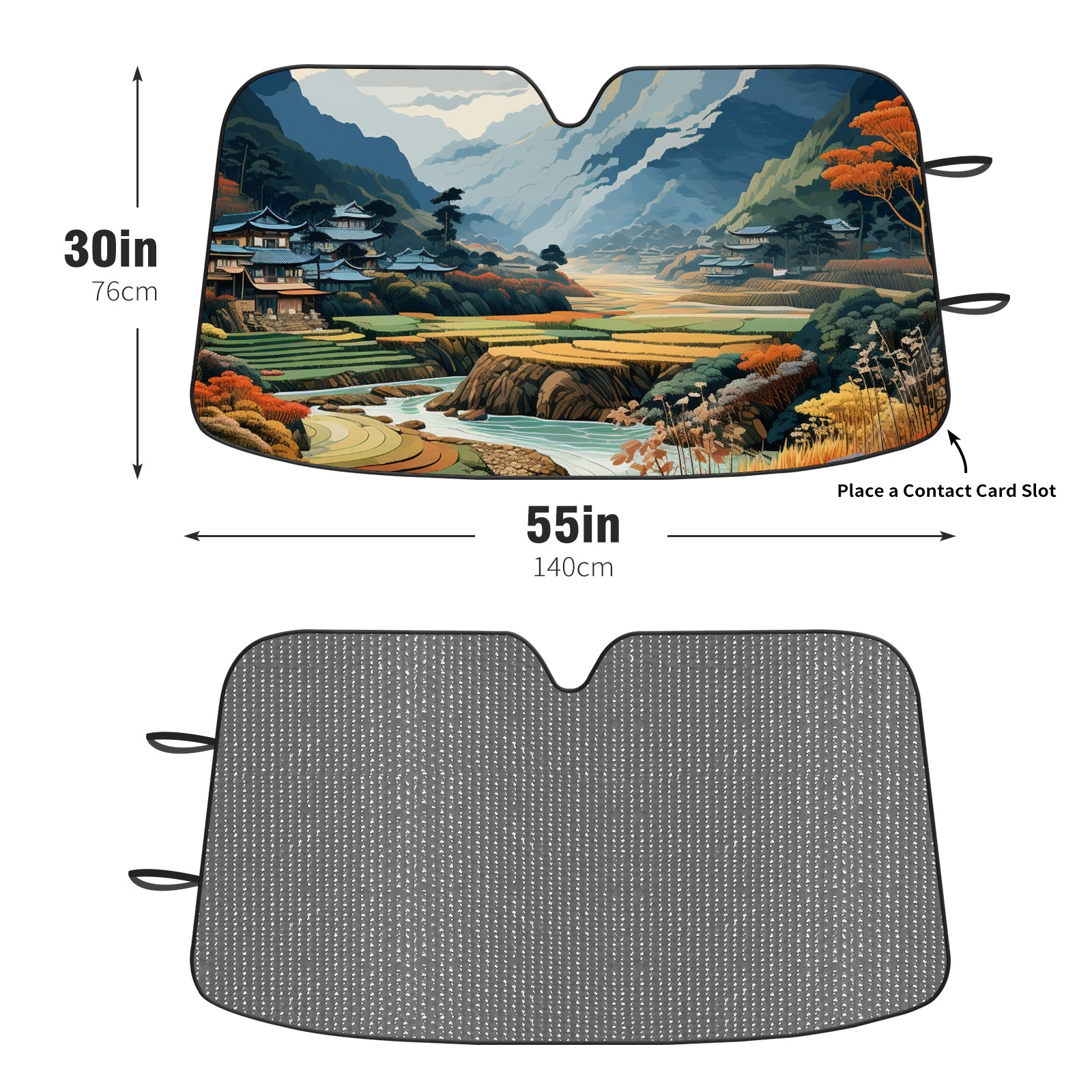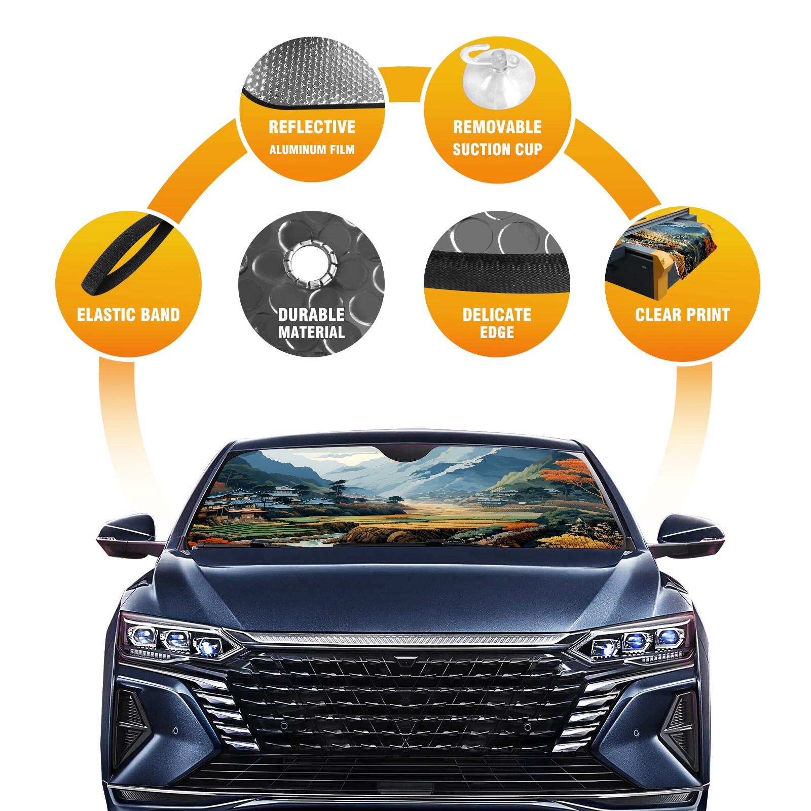 Diameter /Size 63"L x 33.5"W Made from excellent materials which makes it sturdy and protects the car from the sun. Easy to use and pack. Makes the interior of the car cooler.You can easily stash the sunshade in the storage bag or store long term.It open and closes easy. Also the leather storage bag is durable and easy to put the umbrella back into.This windshield sunshade provides complete coverage and keeps your car interior cool under direct sun. It is easy to open and position under the windshield and around the rear-view mirror. Makes Your Car Easy To Identify, Perfect For Finding Your Car In Crowded Parking Lots And Garages.Great Choice: It Is A Great Gift For Dad, Boyfriend, Brother, Brother And Uncle, Friends, Classmates, Family And So On. Notice: Due To Difference Computer Monitors, The Color Maybe Slightly Different From Picture. As Different Measurement Methods, Measurement Data Will Float Within 2%.I Hope You Understand. If You Have Any Question About The Item Please Do Not Hesitate To Contact Us Immediately And We Will Give You A Satisfactory Reply Within 24 Hours.
