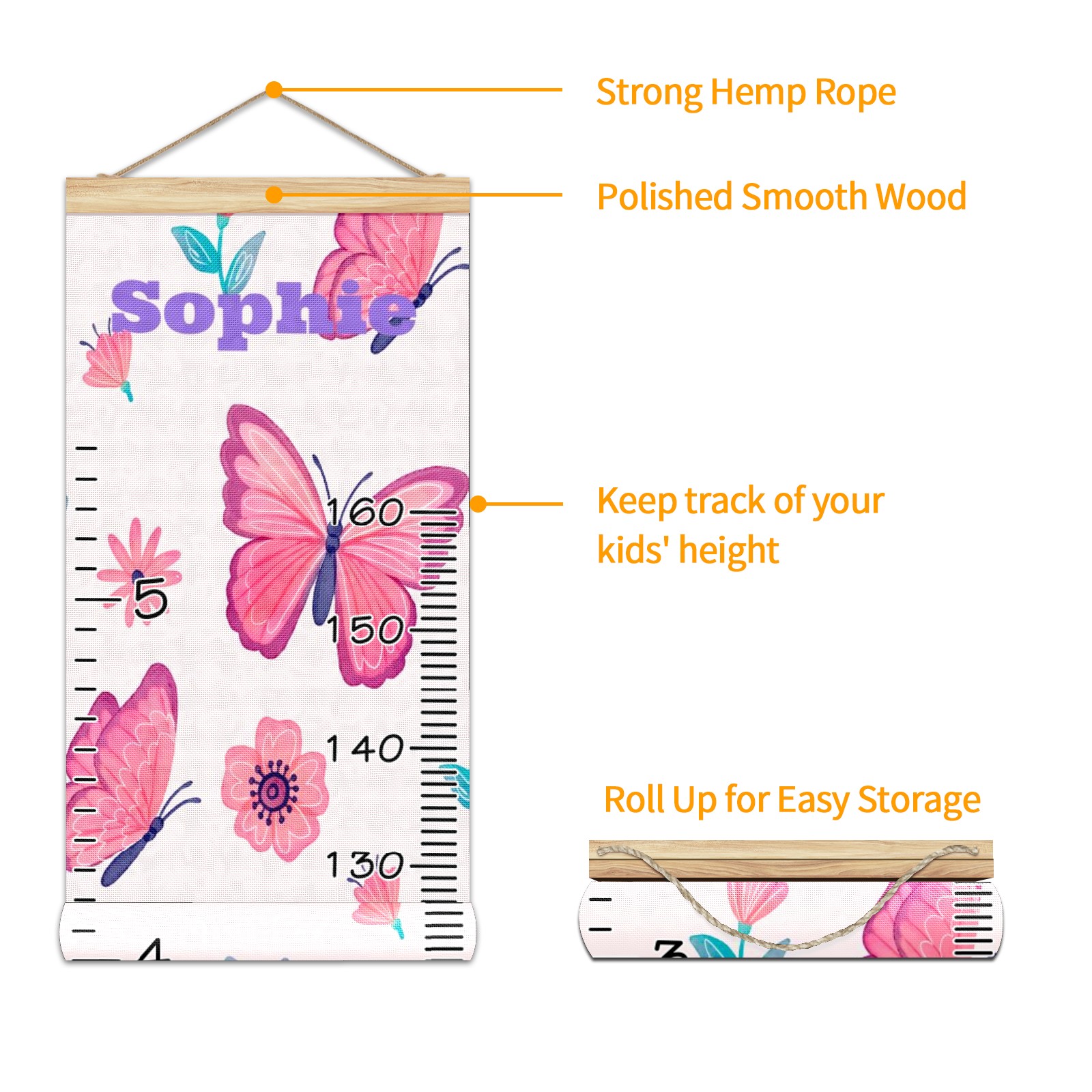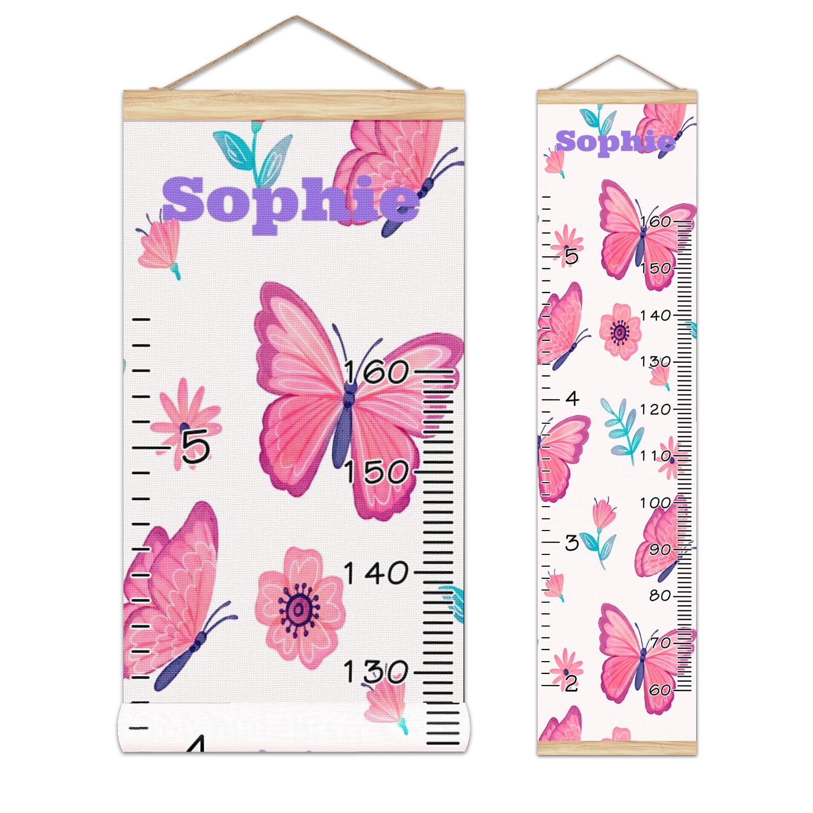 Personalized Kids Name Growth Chart Ruler for Wall Wood Frame Height Measure Chart 13.4x56 in Linen Hanging Height Growth Chart Pink Butterfly & Flower3.18 Kids Room Decor
