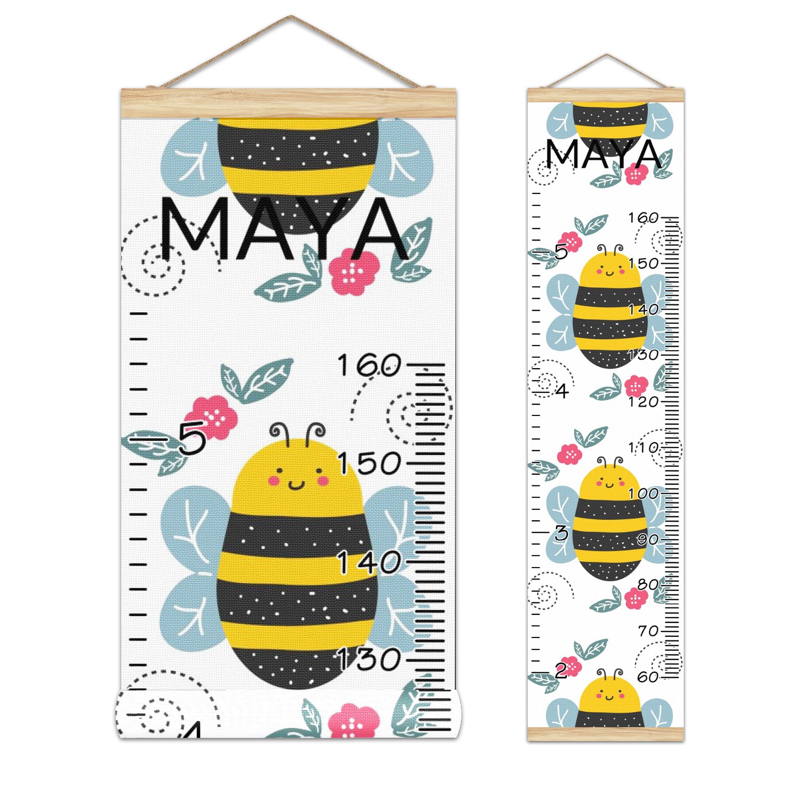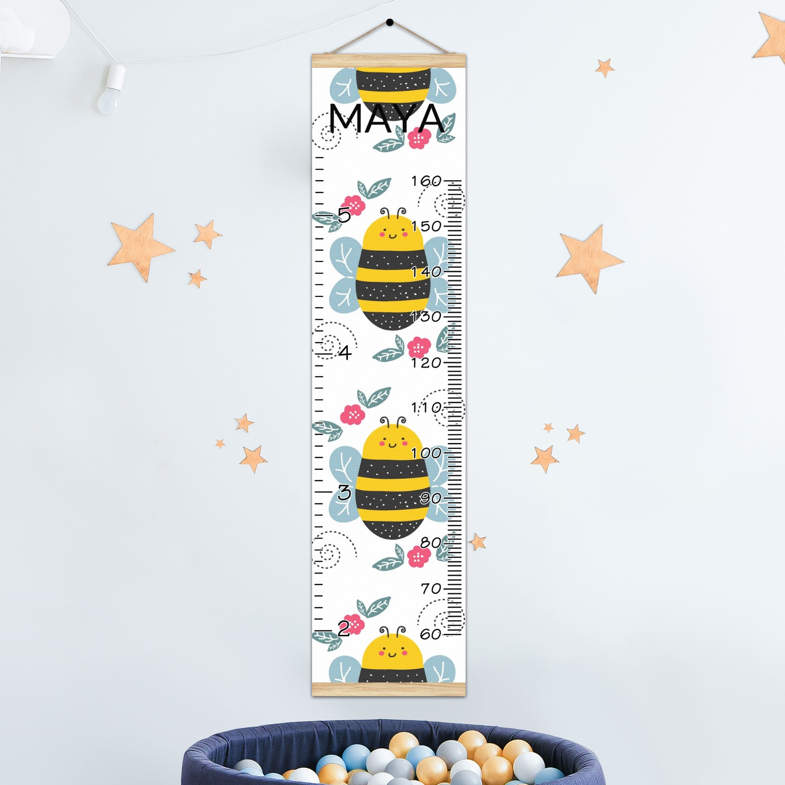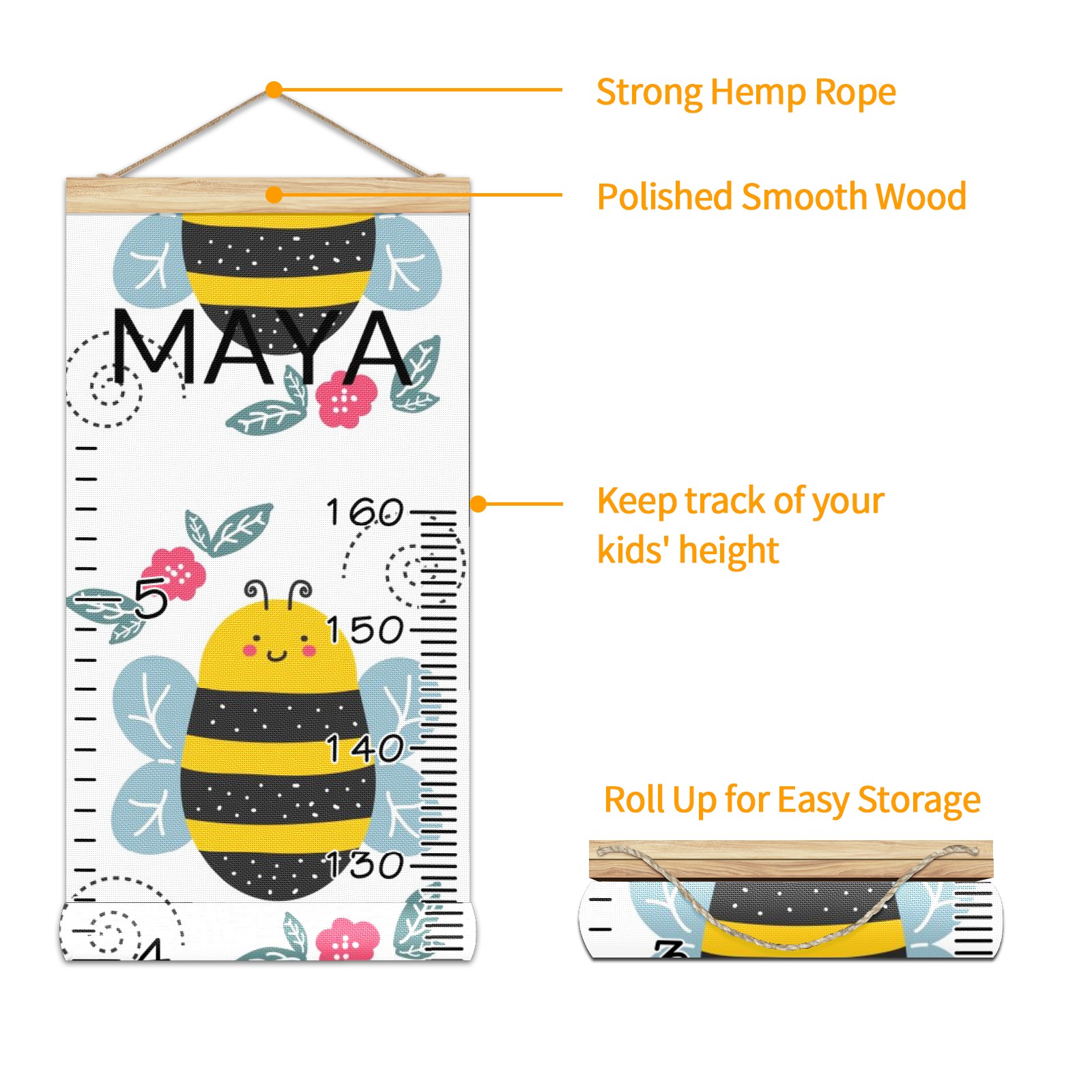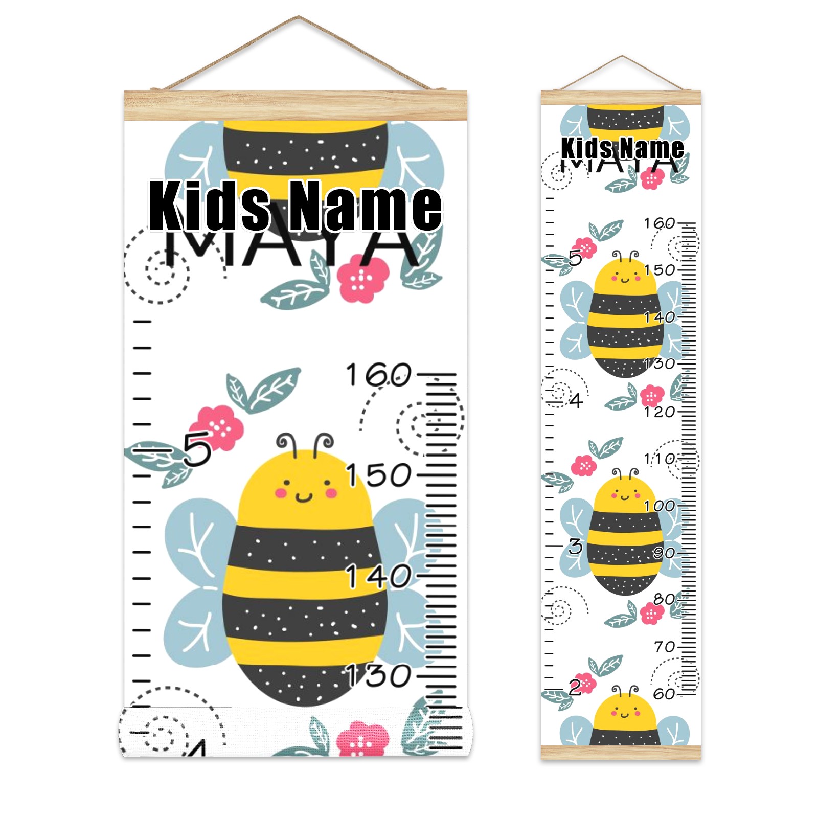 Personalized Kids Name Growth Chart Ruler for Wall Wood Frame Height Measure Chart 13.4x56 in Linen Hanging Height Growth Chart Cute Cartoon Bee Red Floral3.18 Kids Room Decor