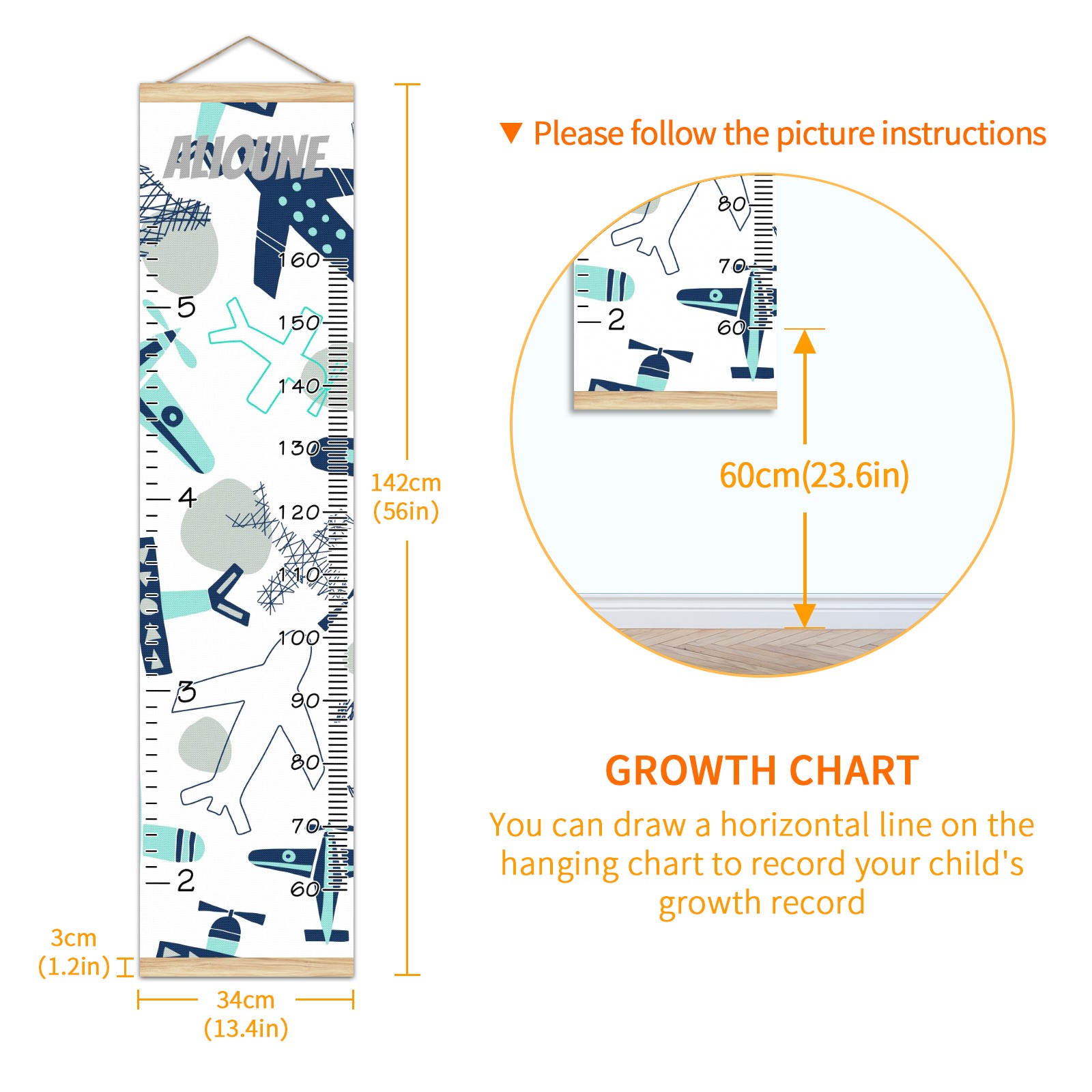 <p><b>Baby height growth chart can be used anywhere</b></p><p>Ideal for kids nursery decoration, kids bedroom, interior walls or windows, playroom, living room, homedecoration.Add name and make the growth chart special!</p><p><br></p><p><b>Easy to fold and carry</b></p><p>With rope at the top of the growth chart, it is easy to install and remove.You can fold it and unfold any time any where.</p><p><br></p><p><b>Perfect Gift Idea for Kids</b></p><p>Environmental and non-toxic for kids use, it must be a perfect gift for baby, kids, girls, and boys.This is a best choice for your friend who have kids or baby as a popular gift.</p><p><br></p><p><b>Easy to read</b></p><p>Measurement accrate with 2 scales, Centimeters and feet. The letters are big enough, very easy to read.</p><p><br></p><p><b>60cm(23.6inch) Over Ground Design</b></p><p>Not only can protect from dust and other damage, but also will not interfere in floor cleaning.</p><p><br></p><p><b>Features:</b></p><p>Rope for Hanging</p><p>Material: Linen + Wood</p><p>Dimensions: 13.4x56 inches</p><p>Weight: 7.5 once</p><p>Package Included: 1 * Baby Growth Chart</p>