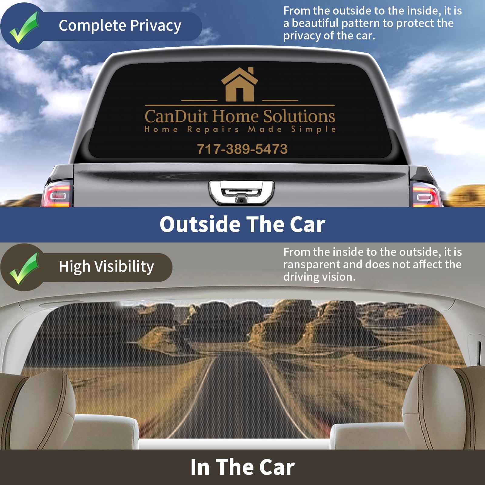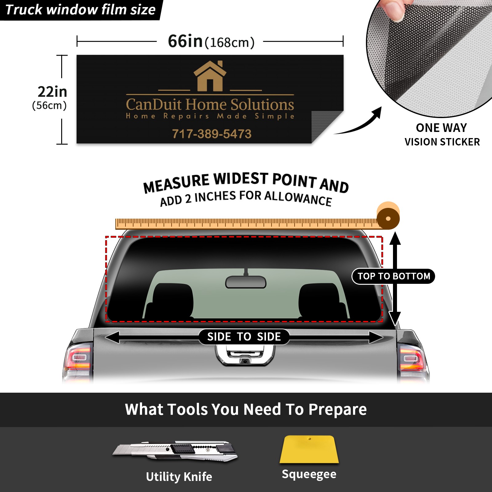 <p><strong>Truck Rear Window Graphics Decals Pickup Trucks Back Window Film Stickers 66" x 22" Perforated Vinyl Wrap Stickers Decorations for Car Rear Window</strong></p><p><strong><br /></strong></p><p><strong>Features :</strong></p><p>- Size of the rear window decals for trucks is 66x22 Inches (168x56cm).</p><p>- High quality perforated vinyl window film, one way vision sticker.</p><p>- Perforated is see through from the inside but not from outside.</p><p>- Clear printing, waterproof and durable.</p><p>- The car back window graphics stickers fits most truck and makes your vehicle more beautiful. </p><p><br /></p><p><strong>【Installation Instructions】</strong></p><p><strong>1. CLEAN SURFACE -</strong> Clean the rear window thoroughly and make sure the surface clean.</p><p><strong>2. STICK THE DECALS -</strong> Tear off the paper on the back and stick the decal on the window.</p><p><strong>3. SCRAPE OFF AIR BUBBLES -</strong> Use a squeegee or other card to scrape off the excess air bubbles.</p><p><strong>4. TRIM THE EXCESS -</strong> Use a knife to cut off the excess stickers of the window, finally complete.</p><p><br /></p><p>1. Please measure the size before purchasing, back window graphics decal for truck can be cut to your desired size.</p><p>2.The graphics stickers for truck back window is a great gift for yourself also can as a birthday / halloween / christmas gift for your friends and family.</p>