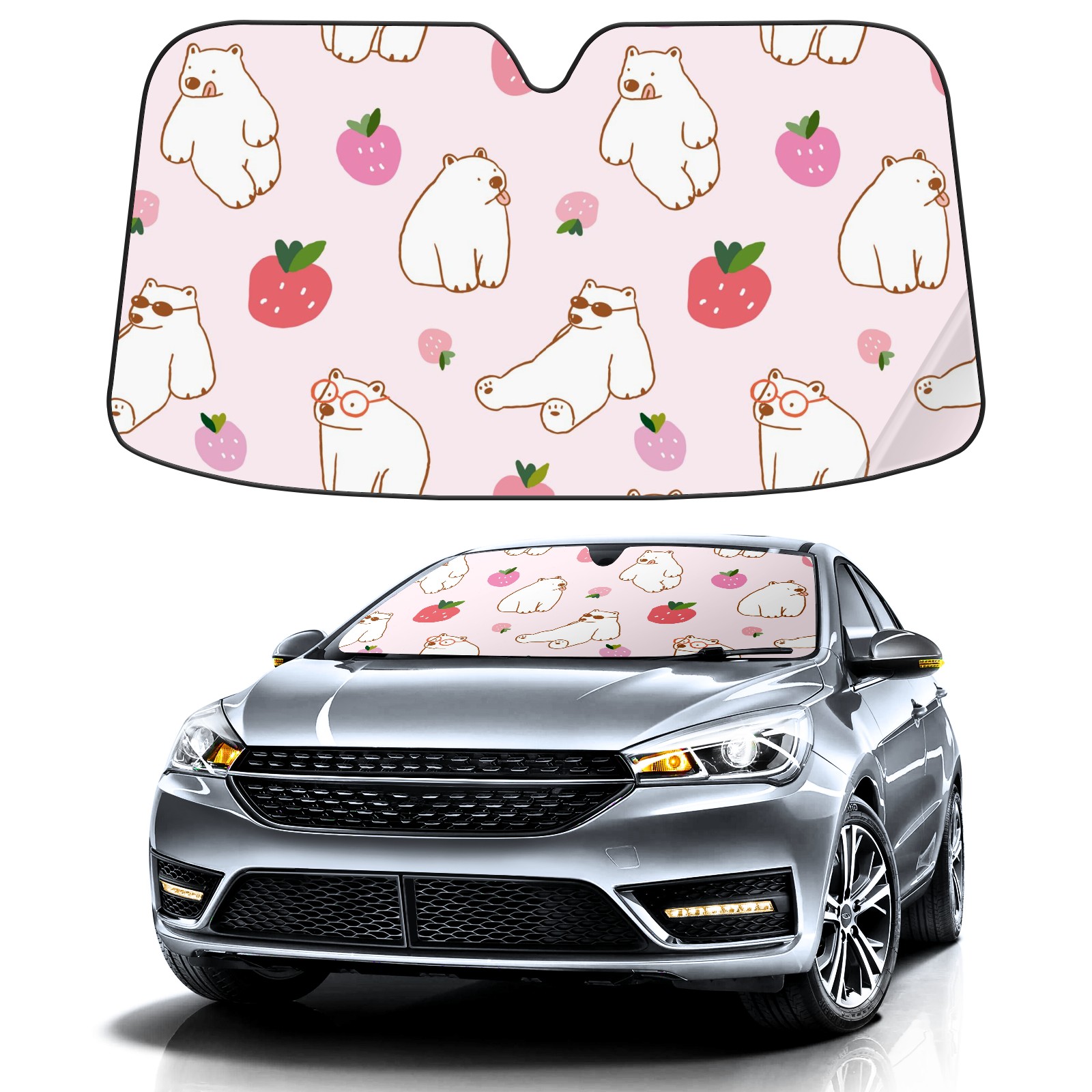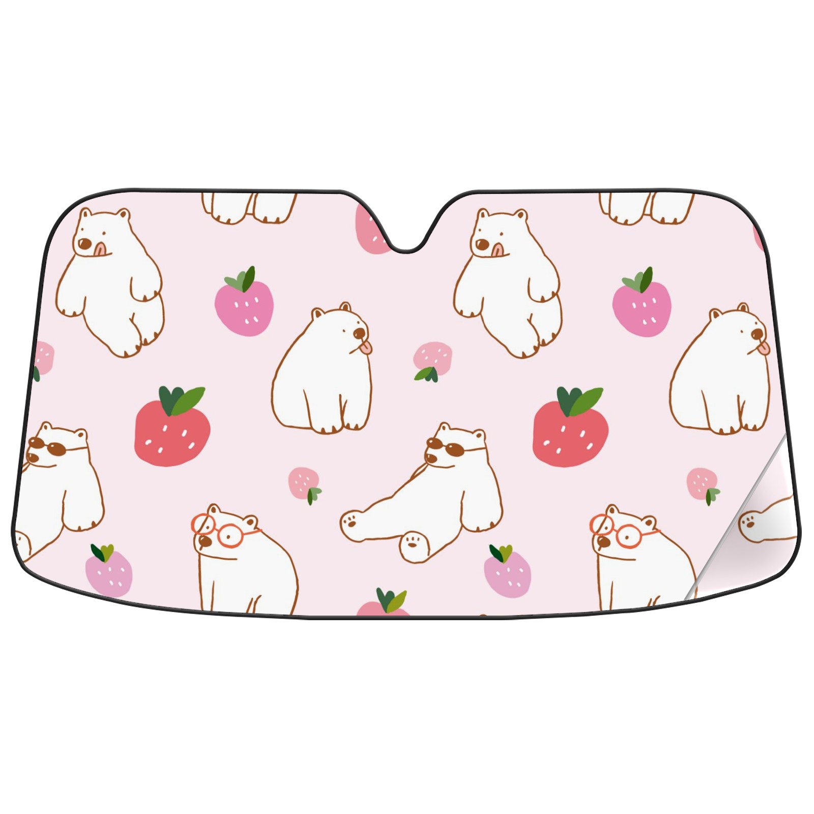 Car Windshield Sun Shade For Front Window White Bear Strawberry On Pink Background Foldable Vehicle Windshield Car Sun Visor Covers Automotive Window Protector Car Camping Privacy Sun Blocker