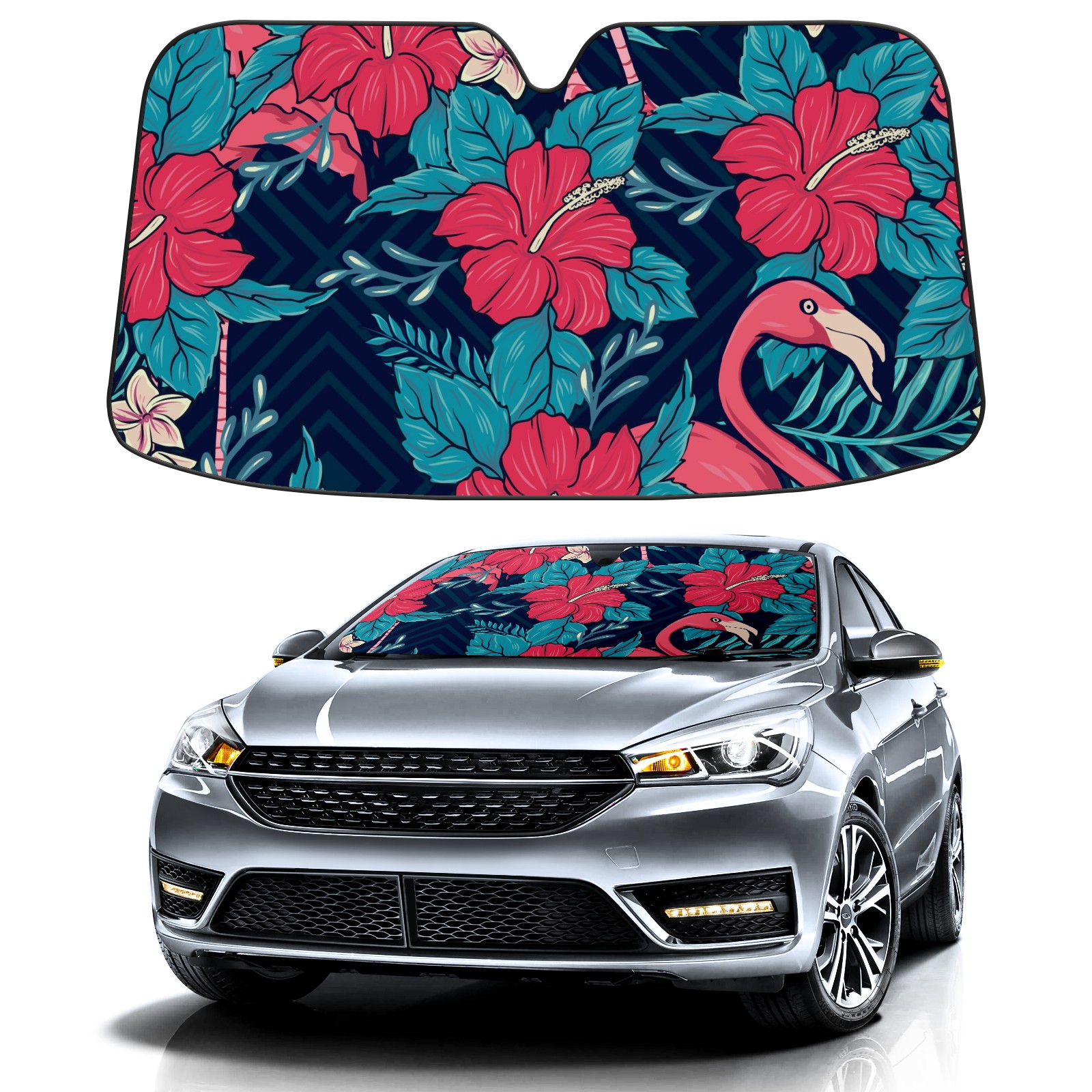 Car Windshield Sun Shade For Front Window Hawaiian Floral And Flamingo Foldable Vehicle Windshield Car Sun Visor Covers Automotive Window Protector Car Camping Privacy Sun Blocker